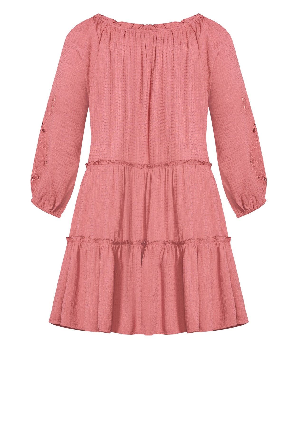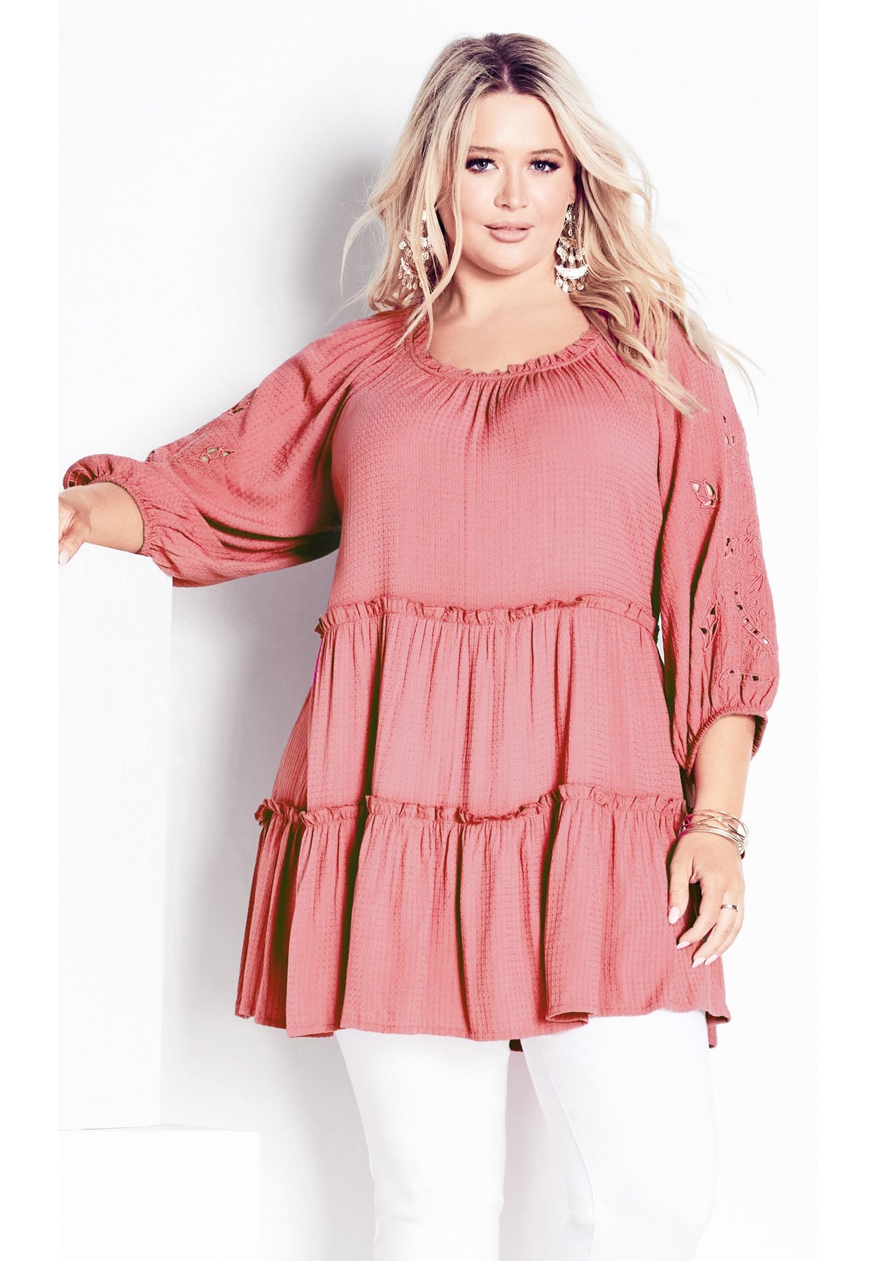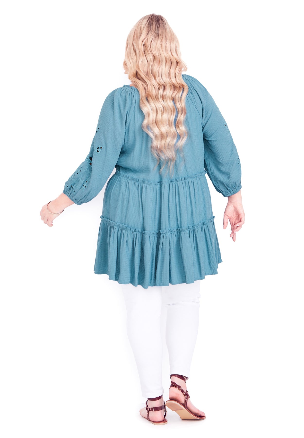 Looking for something special to elevate your everyday style? Look no further than our Clover Cut Work Tunic. This tunic features a round ruffle neckline, elbow-length elasticated sleeves, and cut-out sleeve detail for a unique and eye-catching look. Key Features Include:- Round ruffle neckline- Elbow-length elasticated sleeves- Cut out sleeve detail- Pull on fit- Tiered style- Flared silhouette- Hip length hemlineWear it with skinny-fit jeans for a casual look.