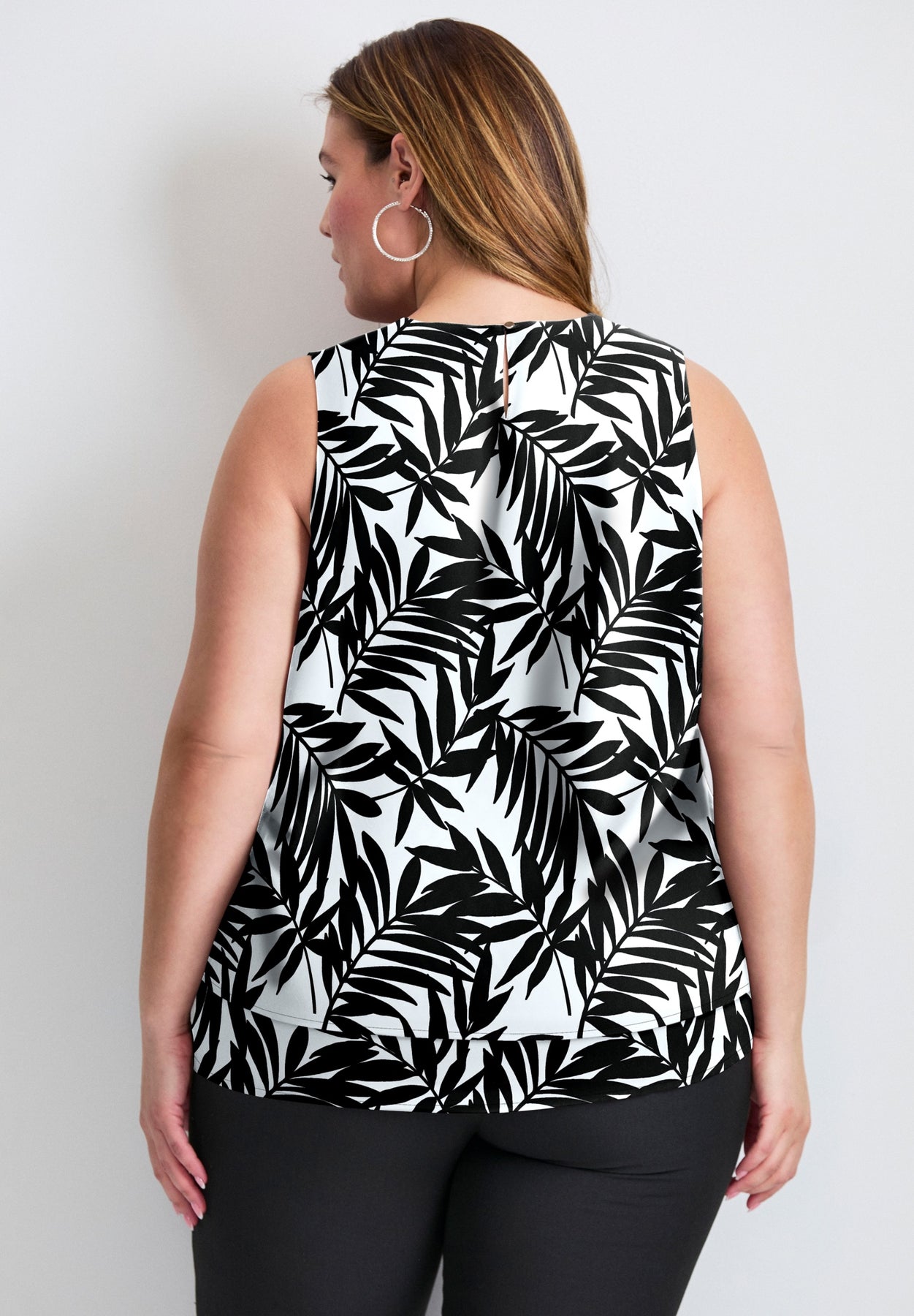 This sleeveless V-neck top features a double-layered hem, adding depth and dimension to its flowy silhouette.