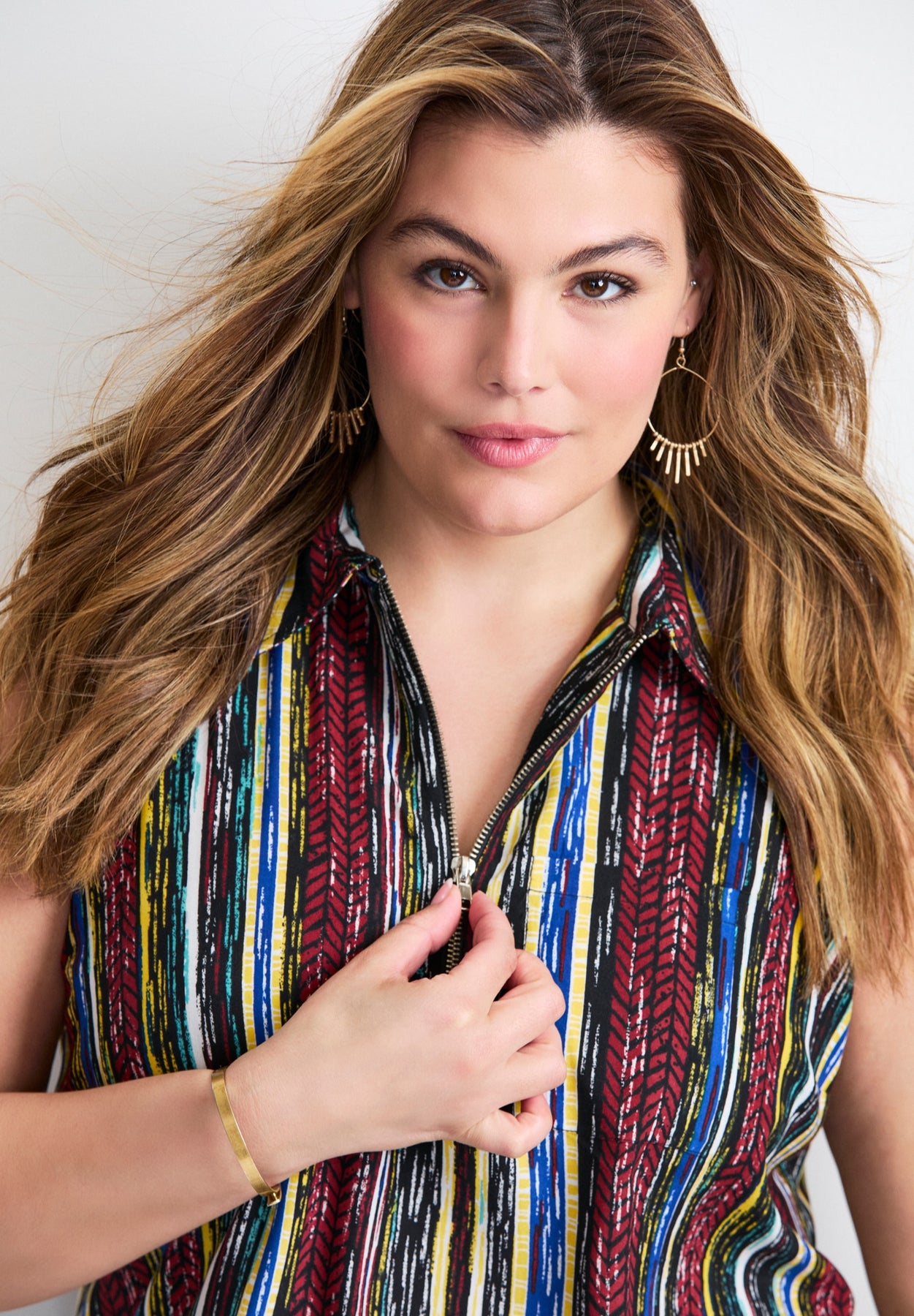 This sleeveless top features a stylish hi-low hem, offering a modern and flattering silhouette. The sleek zipper detail at the neckline adds a contemporary twist, while the classic collared design keeps it polished.