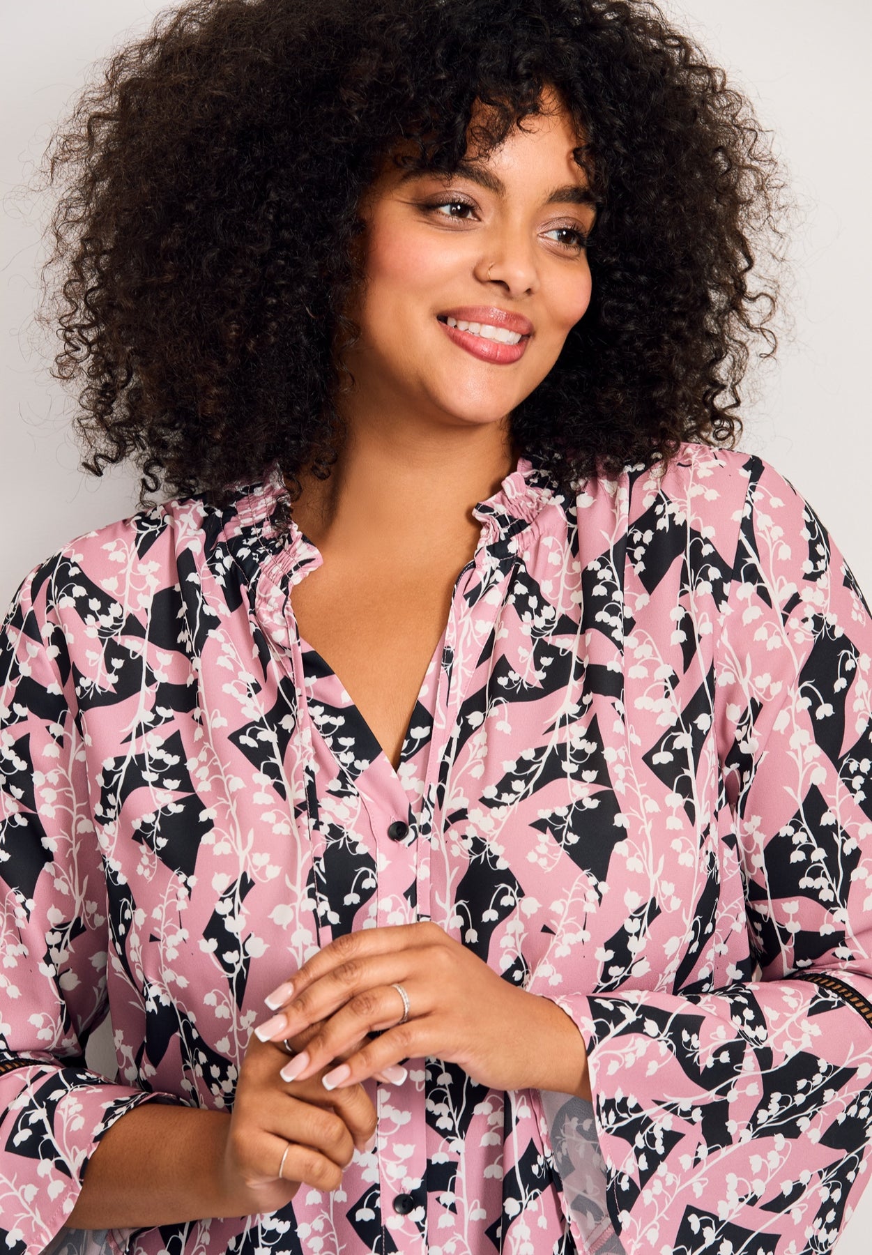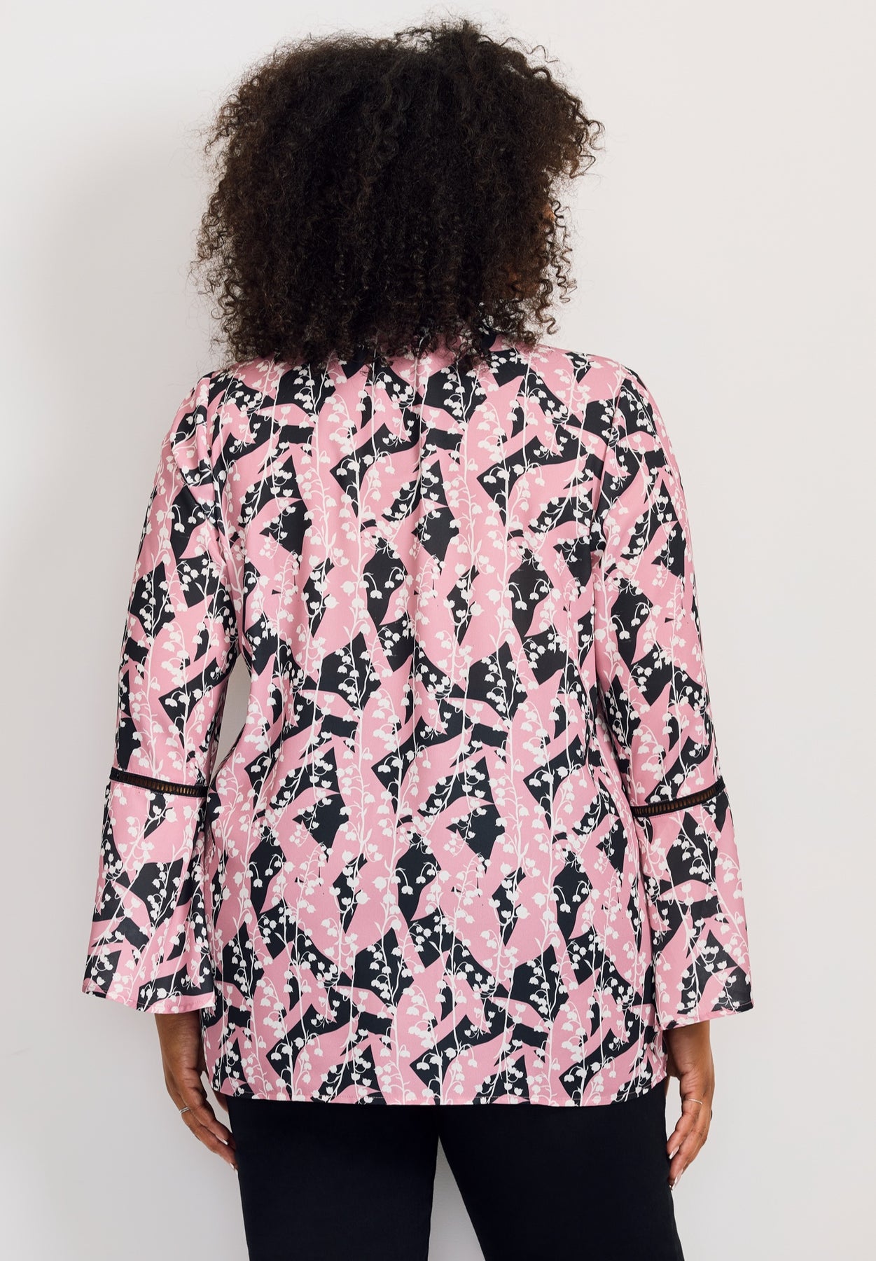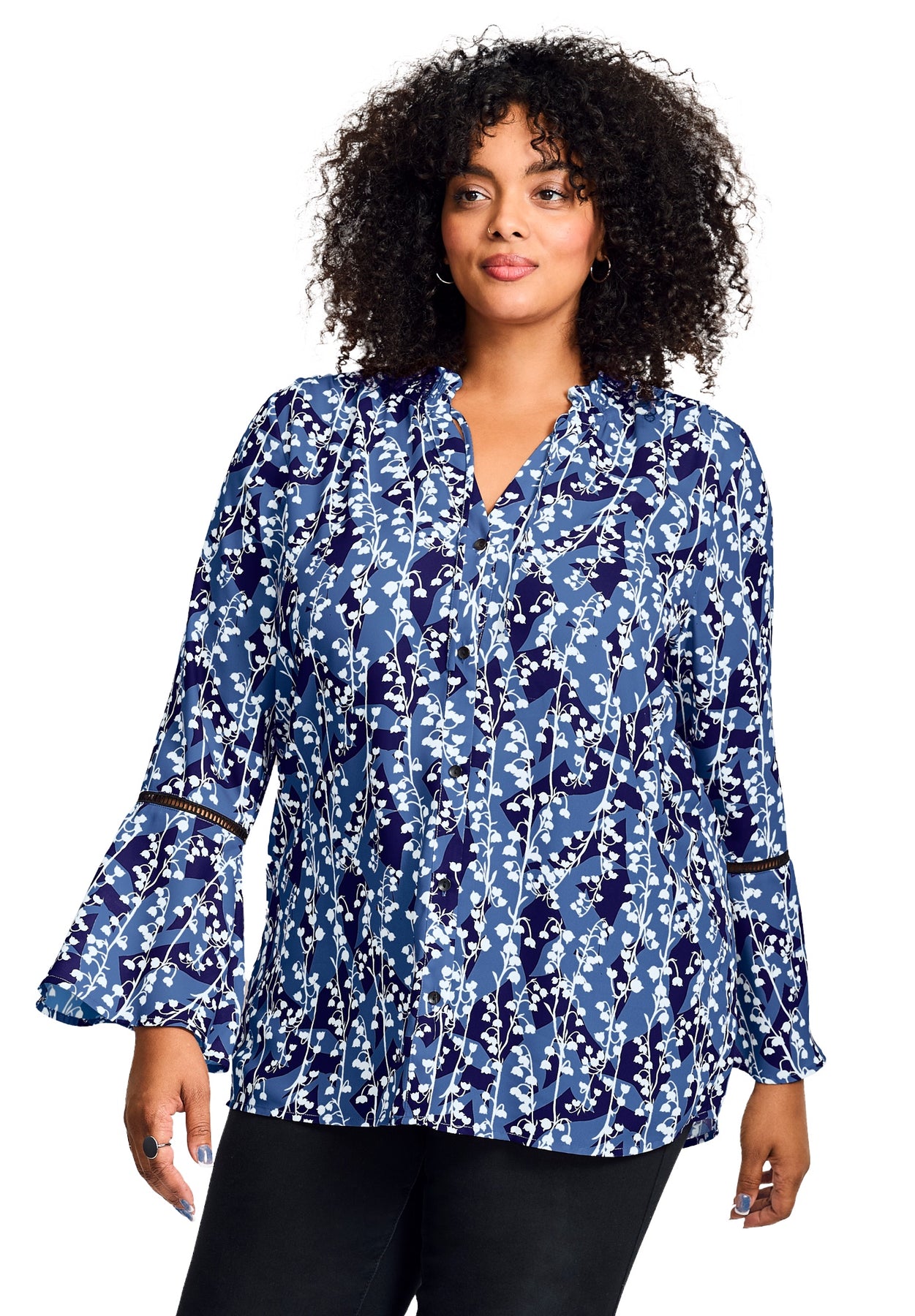 This blouse showcases a flowy silhouette with long, subtly flared sleeves and delicate trim accents. The ruffled collar and button-down front add feminine detail and styling versatility. Made from a lightweight woven fabric, it provides breathable comfort for day-to-evening wear.