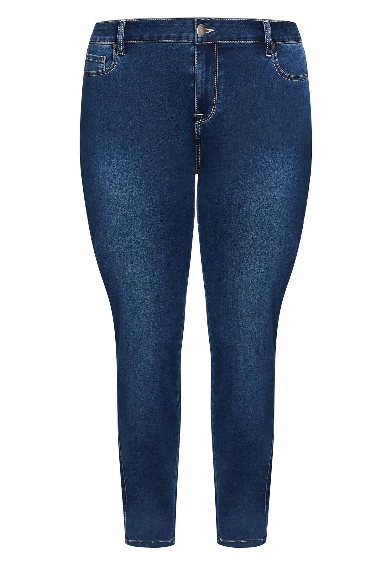 Master the art of curve appeal in the Stretch Denim Skinny Jean. This surprisingly supportive fit gets you looking your best and feeling even more comfortable with our premium Denim fabrication. Key Features Include: - Zip fly and button closure - Functional 5 pocket design - Belt loops - denim stretch fabrication - Skinny leg cut - Available in petite, average, and tall lengths A graphic tee plays up the casual medium wash of these figure-hugging jeans.