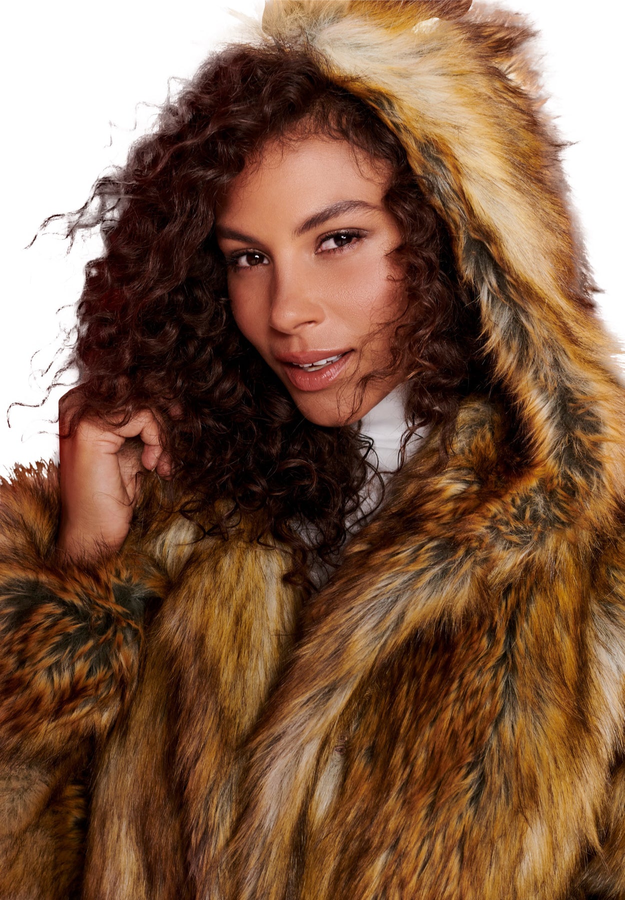 A glamorous faux-fur coat to keep you warm from head to toe. An iconic look, faux fur never goes out of style and is equally great for formal occasions or with favorite denim. Hook and eye closure at front, single button closure at neck. Rolled cuffs. Colors may vary due to nature of fabric.