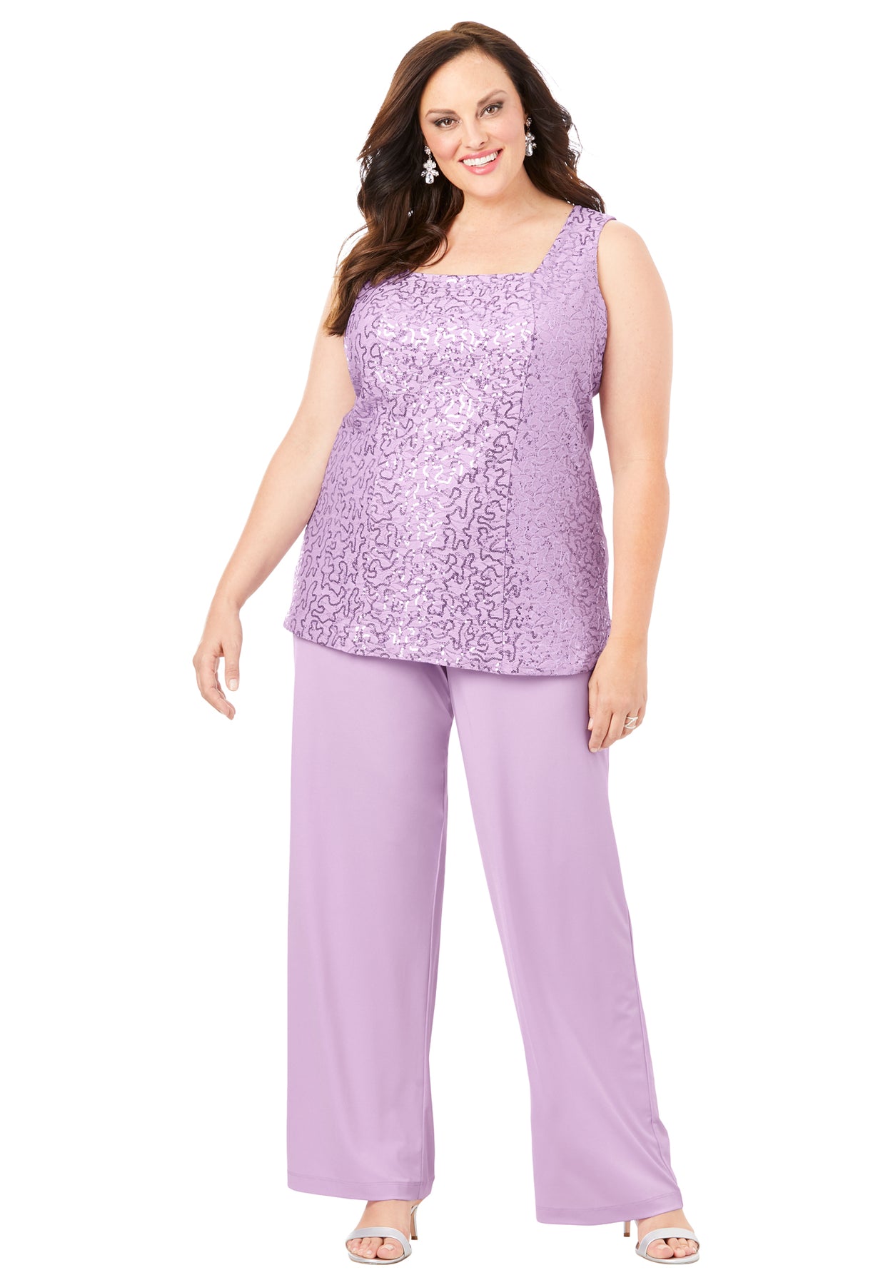 This timeless set makes an elegant, going-out statement. The duster jacket features an open front, sheer three-quarter sleeves and sequin cuffs. Allover lace top with a feminine square neck and squareneck sleeveless top with jersey knit back. Elasticized wide-leg pant.