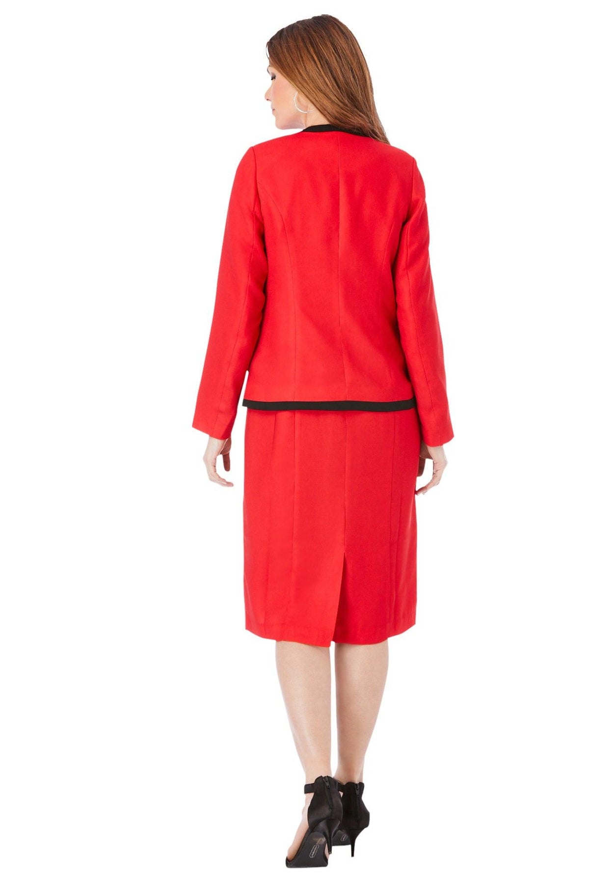 Pretty professional and ultra-chic this contrast-trim jacket dress will soon become your new go-to from day to dinner and beyond. The iconic fit of the dress is universally figure flattering for every body and the jacket completes the look and adds a modern, feminine finish that you will love. Sleeveless sheath dress topped by a chic flyaway-opening contrast-trim jacket. Dress has back zip and back walking vent; fully lined.