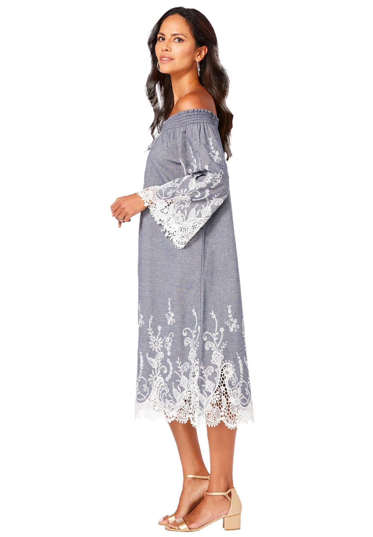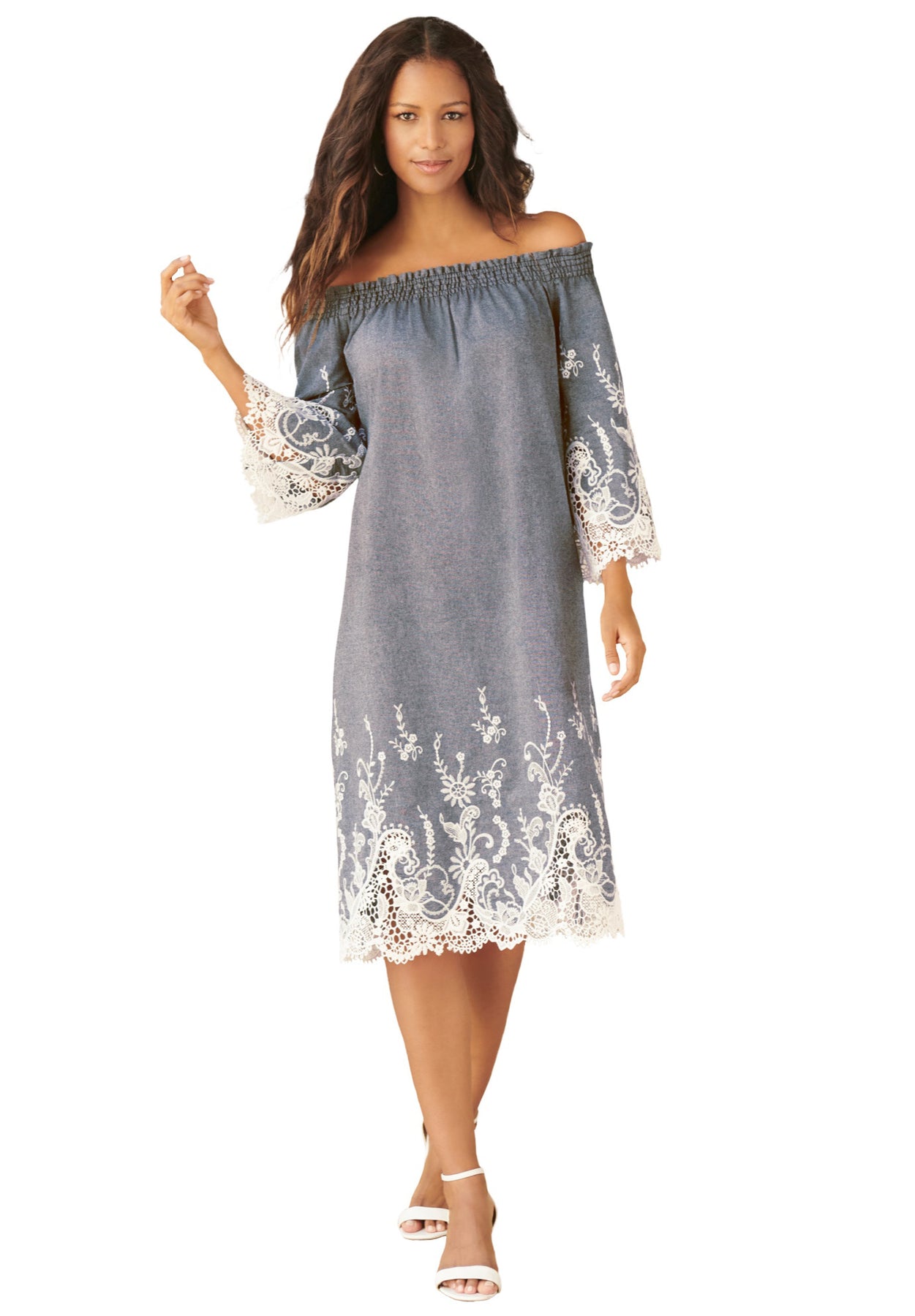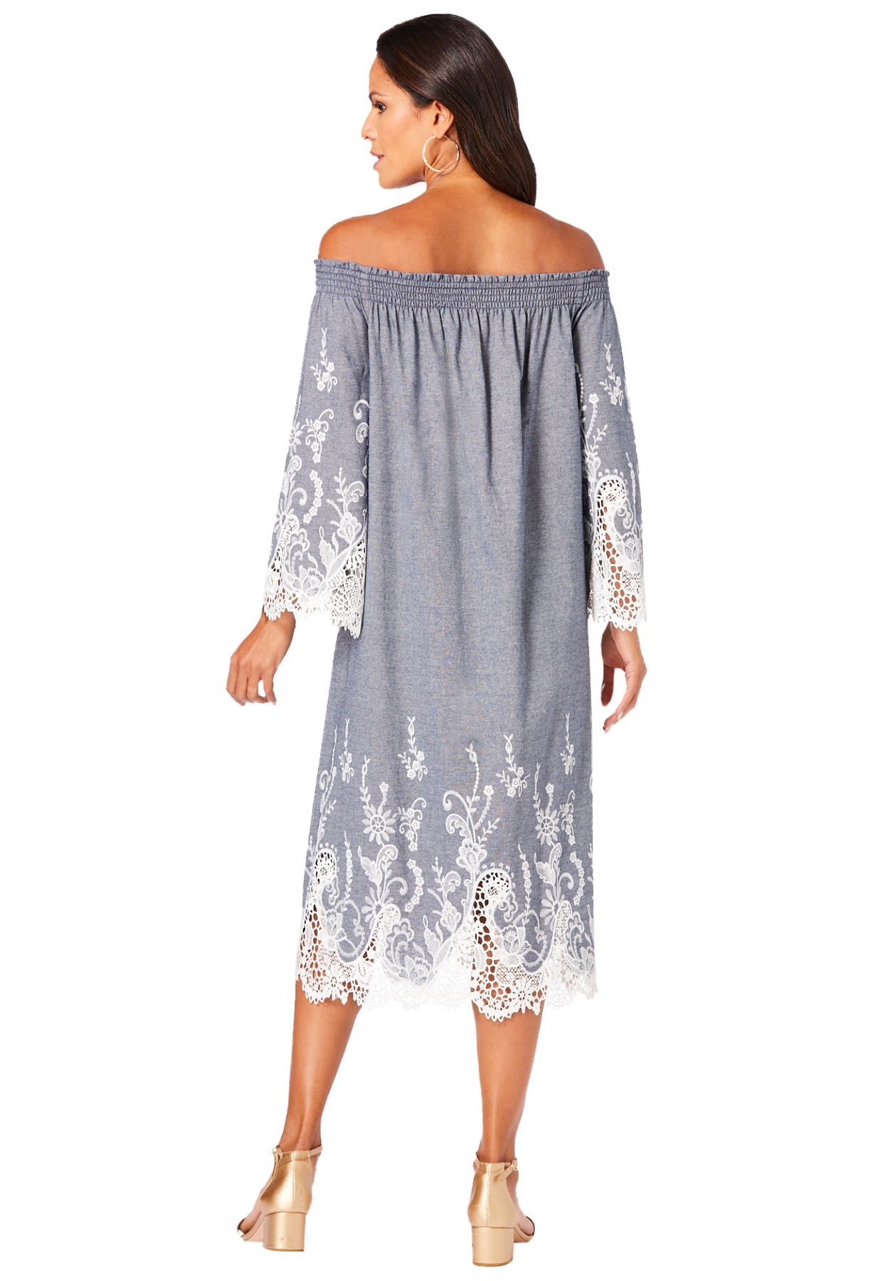 Perfect for brunch, a weekend getaway or casual Friday, this style features eyelet trim at the sleeve and hem. Off-the-shoulder, swing silhouette, bell sleeves.