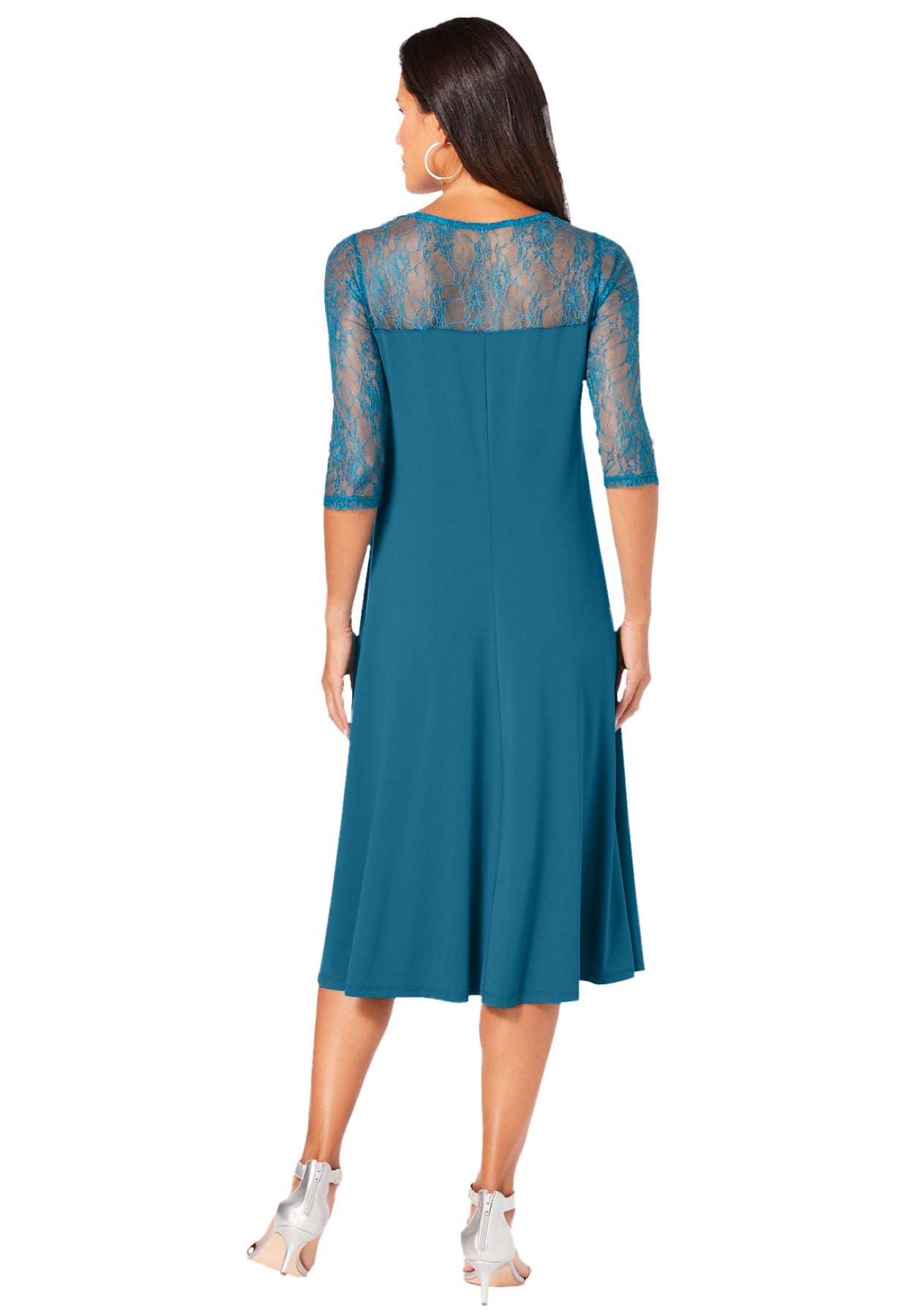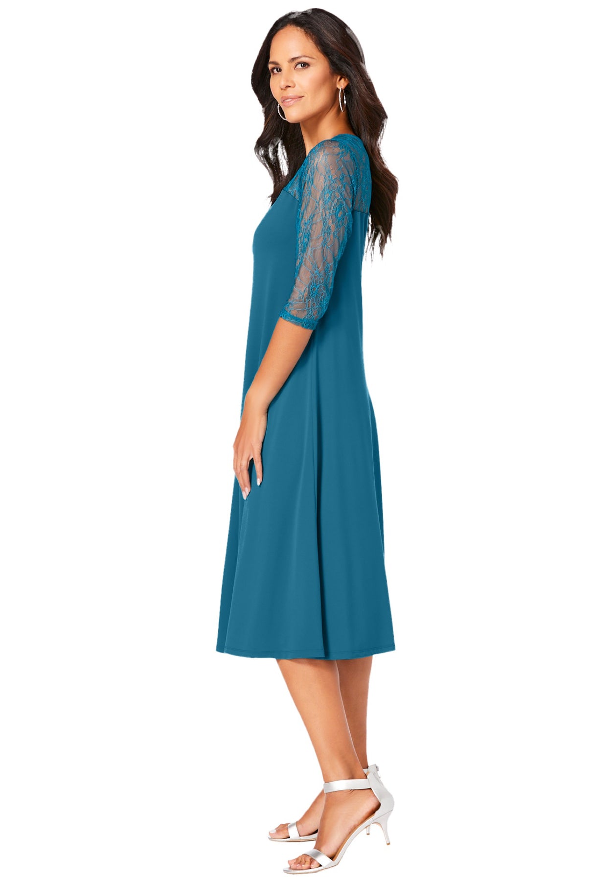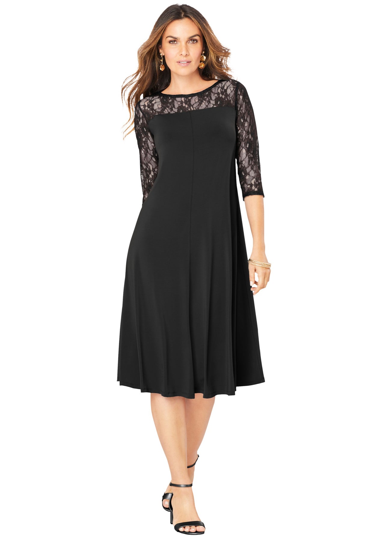 Pretty and feminine, designed with an illusion lace yoke that adds just the right amount of romance. Three-quarter sleeves, swing silhouette.
