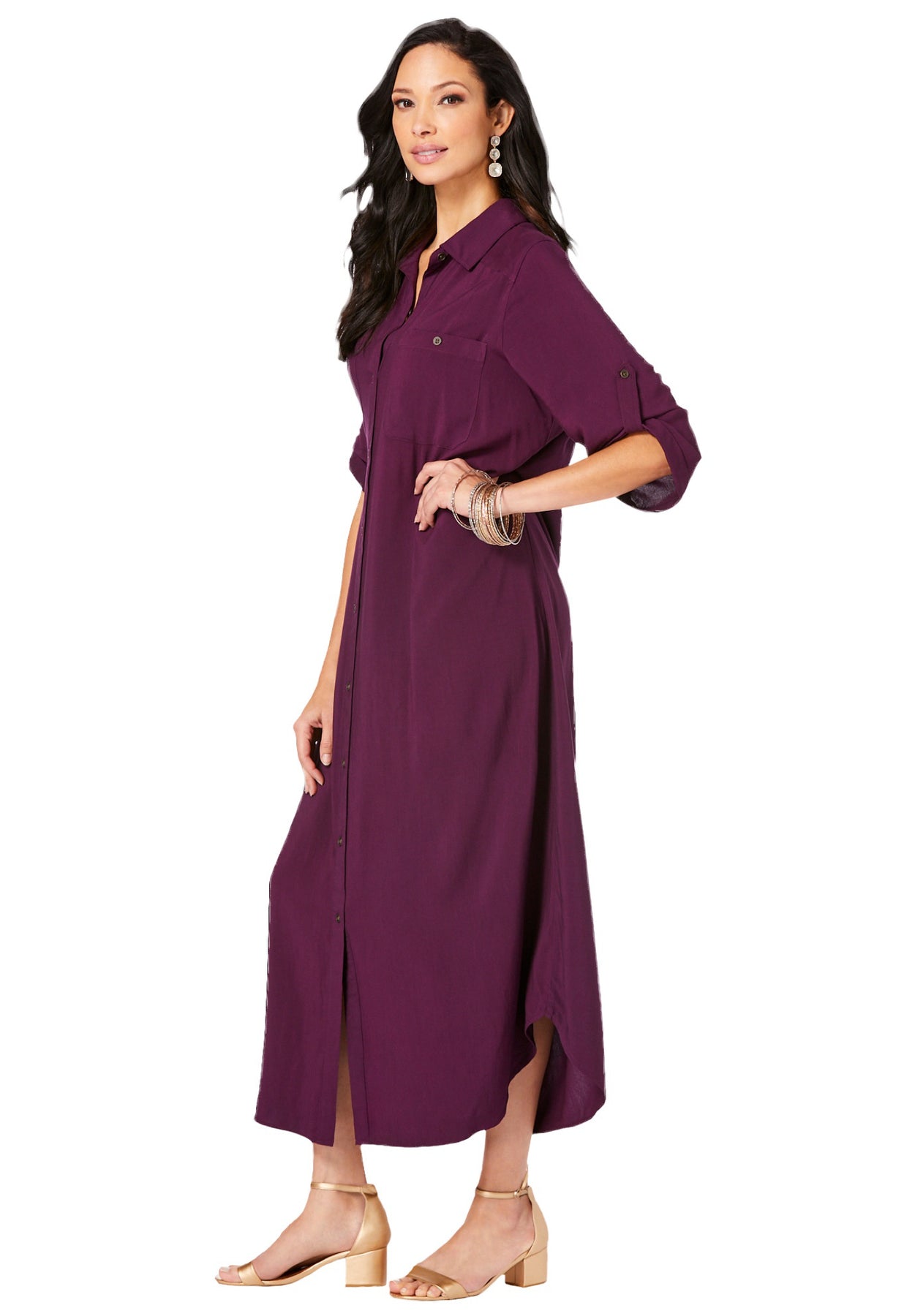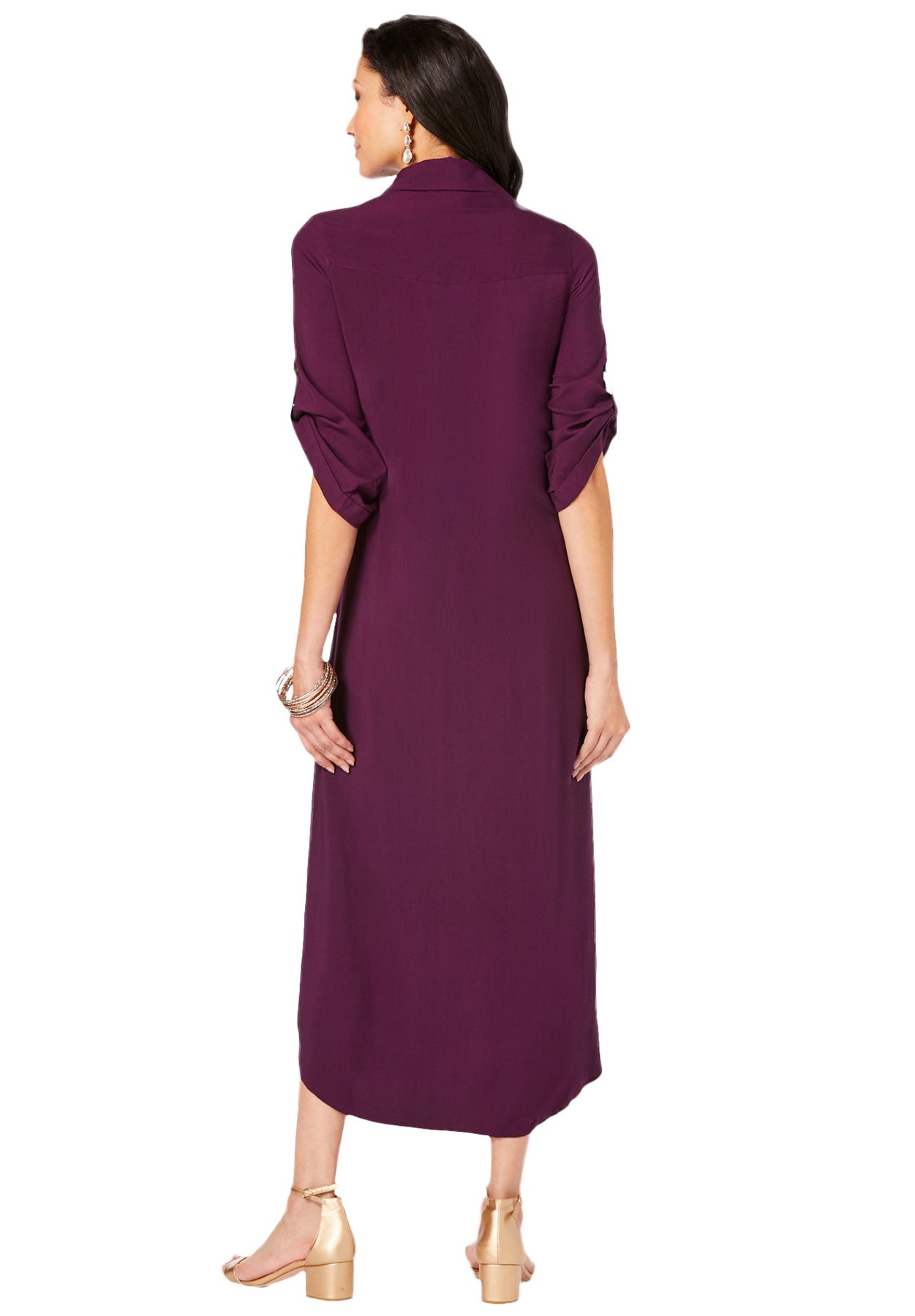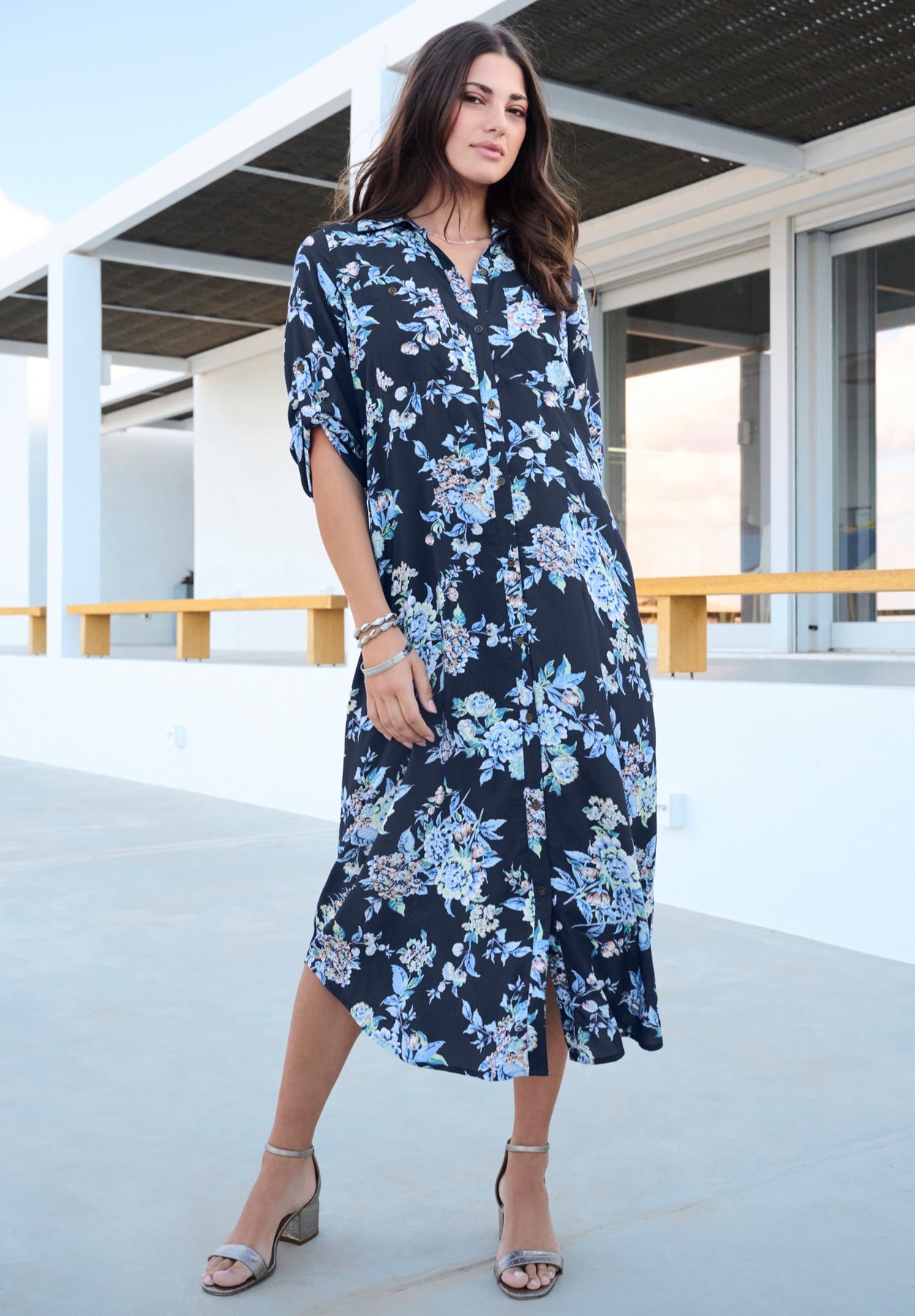 Explore your wild side with this safari-inspired button-front shirtdress with three-quarter roll-tab sleeves. Shirttail hem.