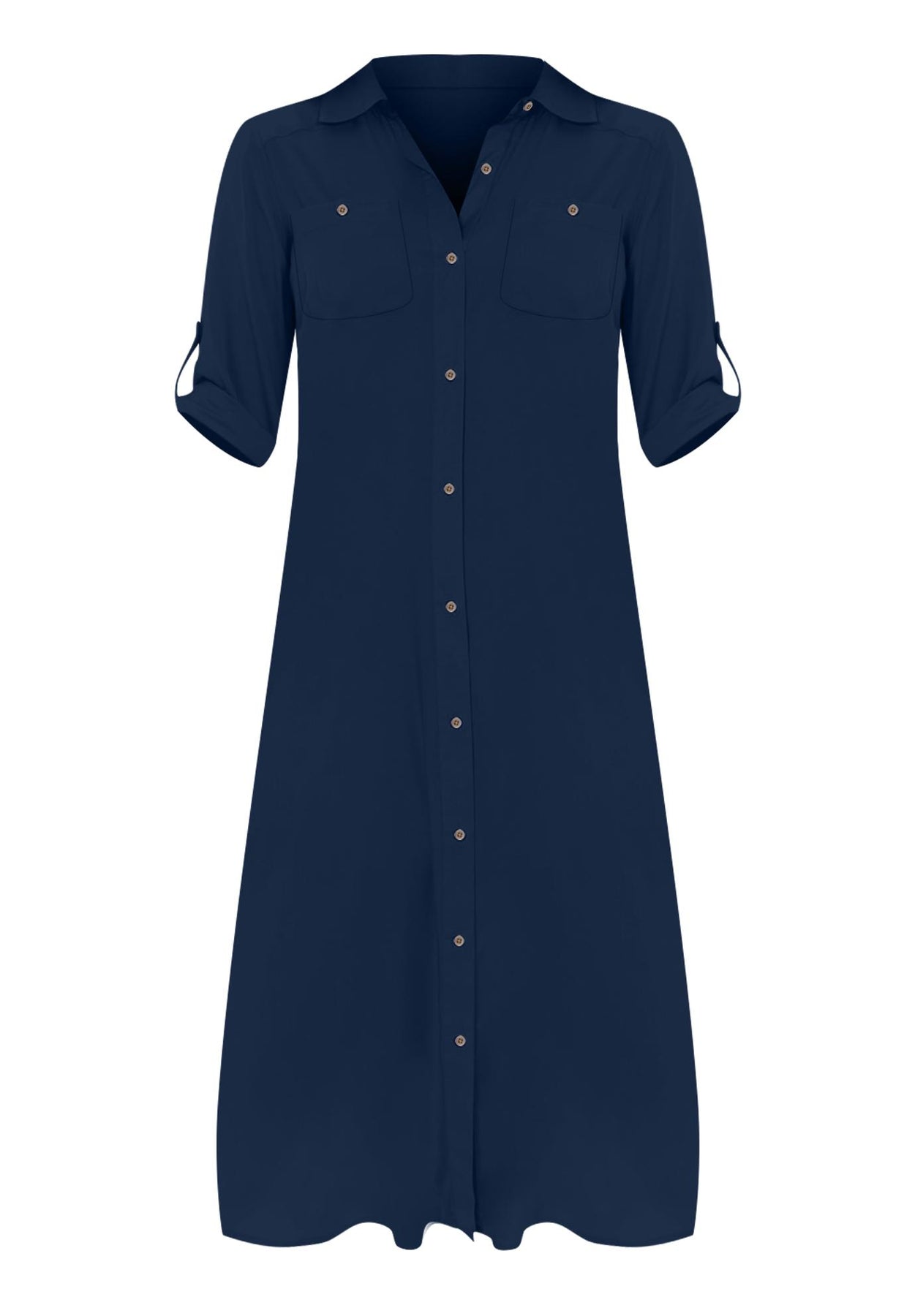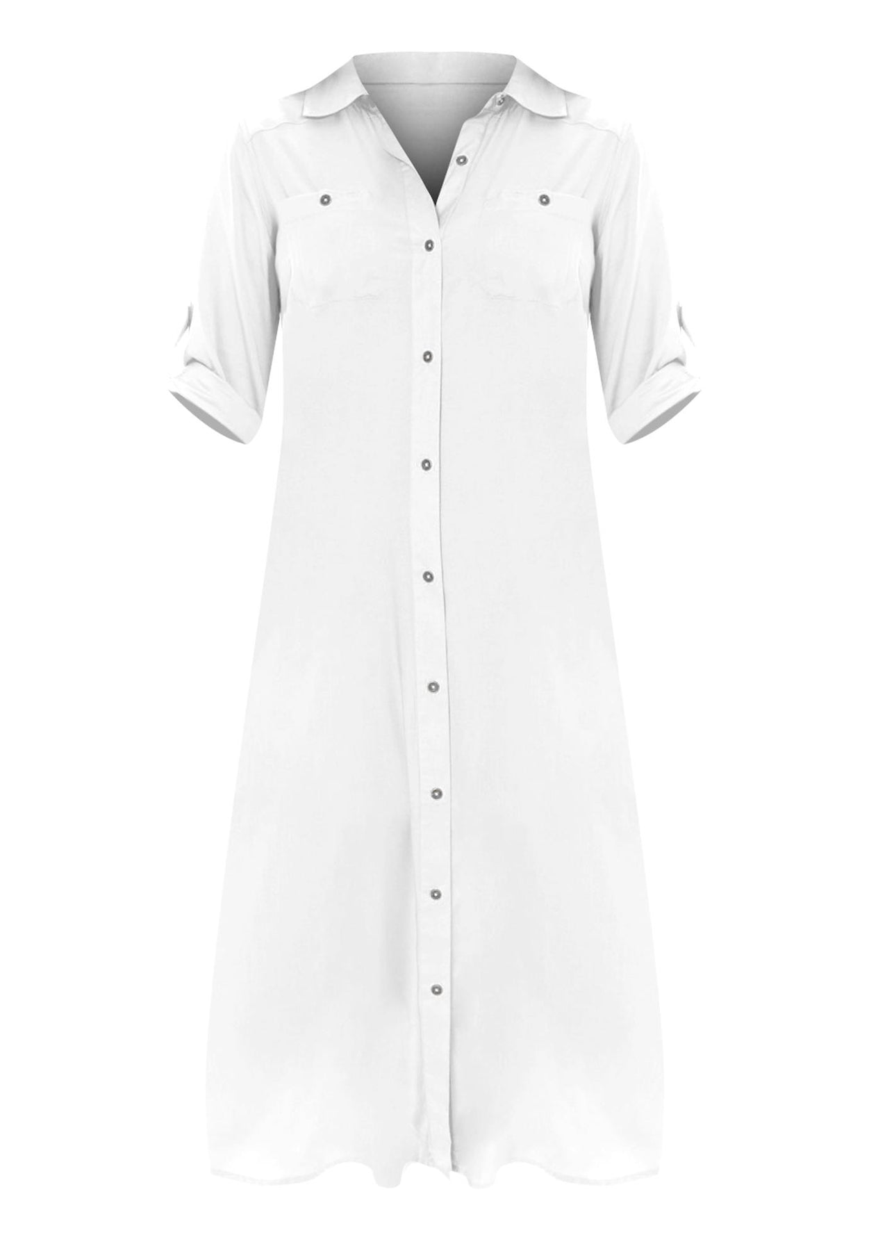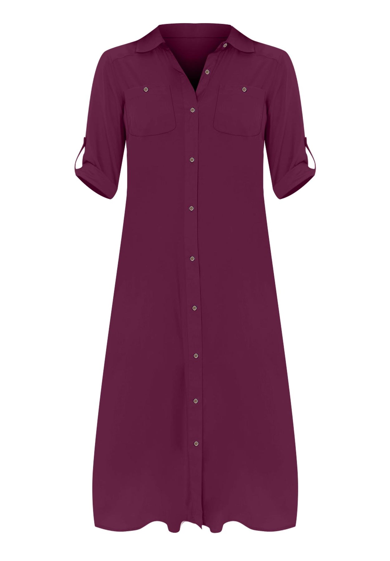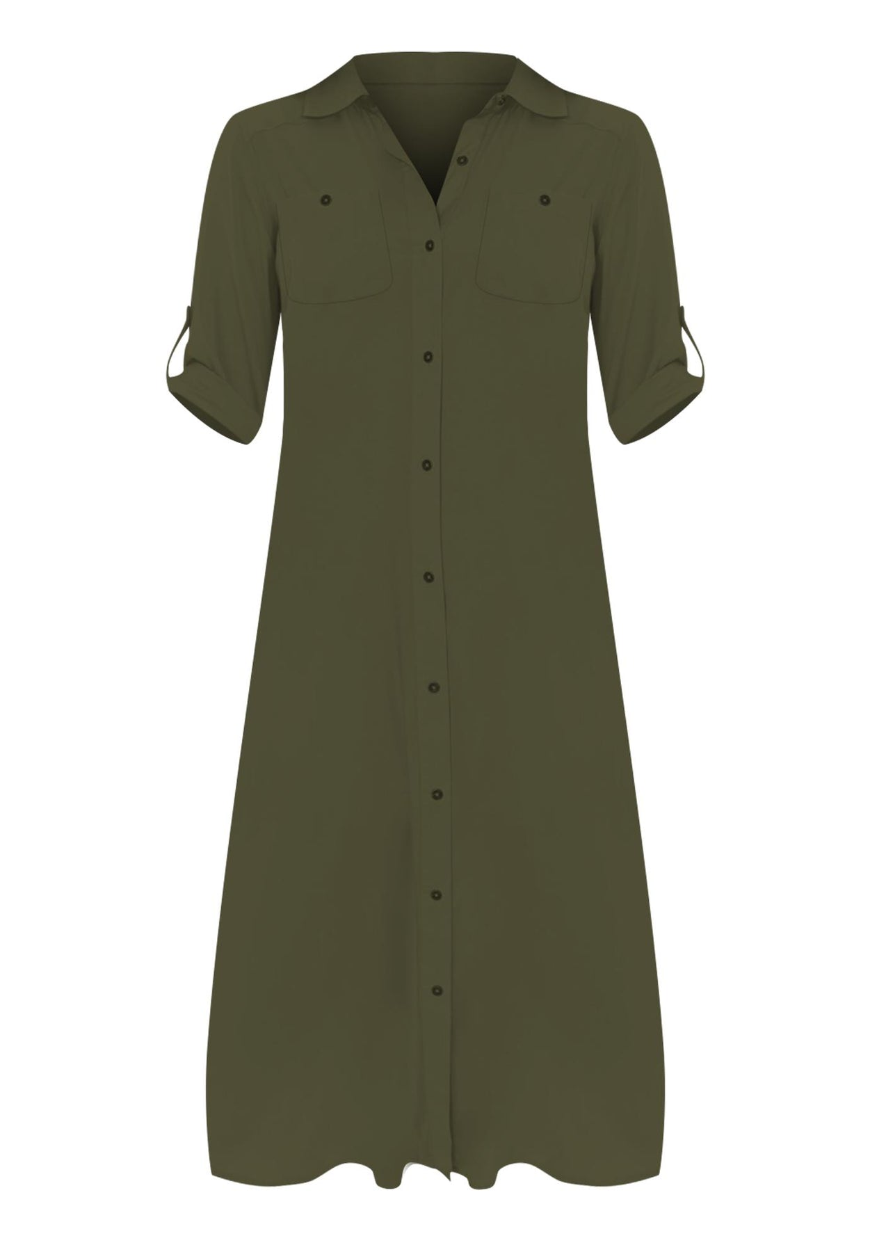 Explore your wild side with this safari-inspired button-front shirtdress with three-quarter roll-tab sleeves. Shirttail hem.