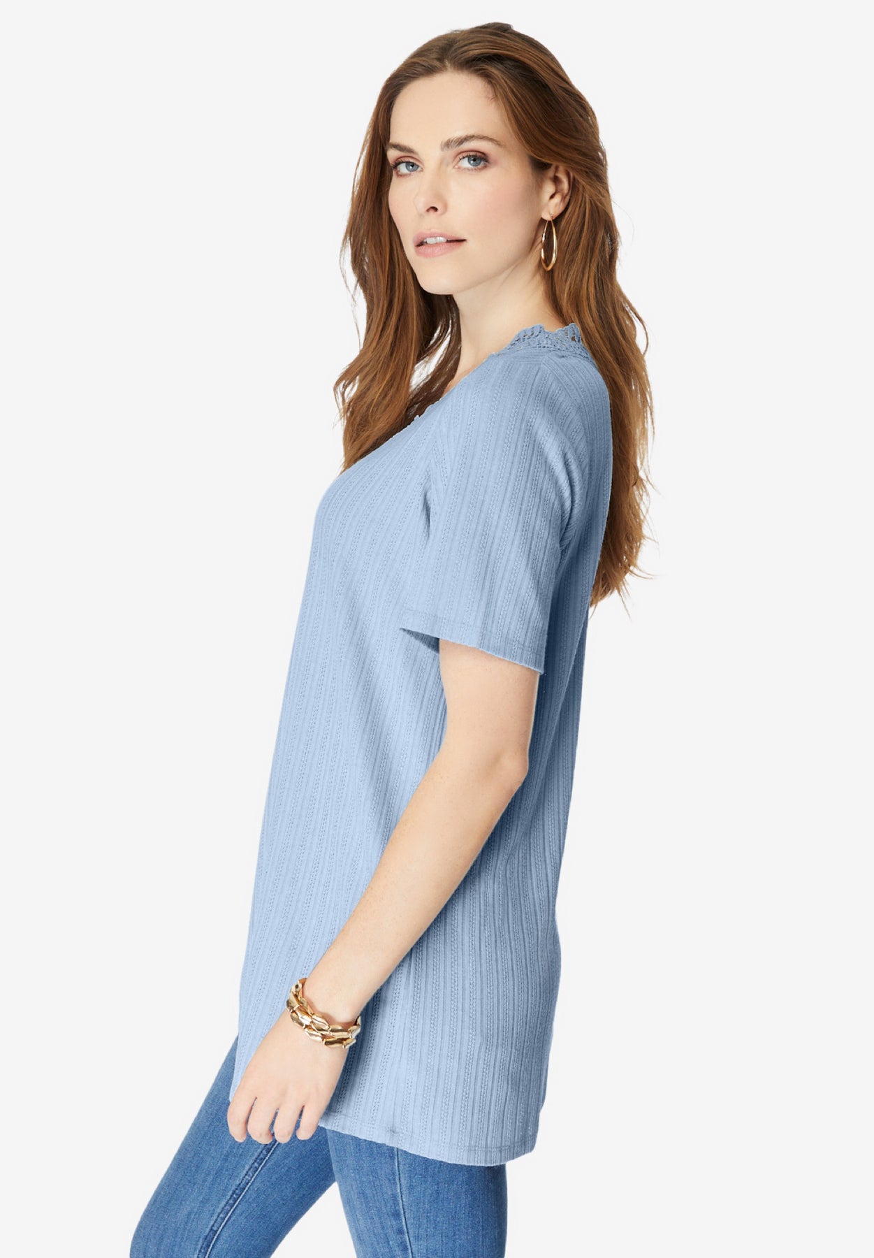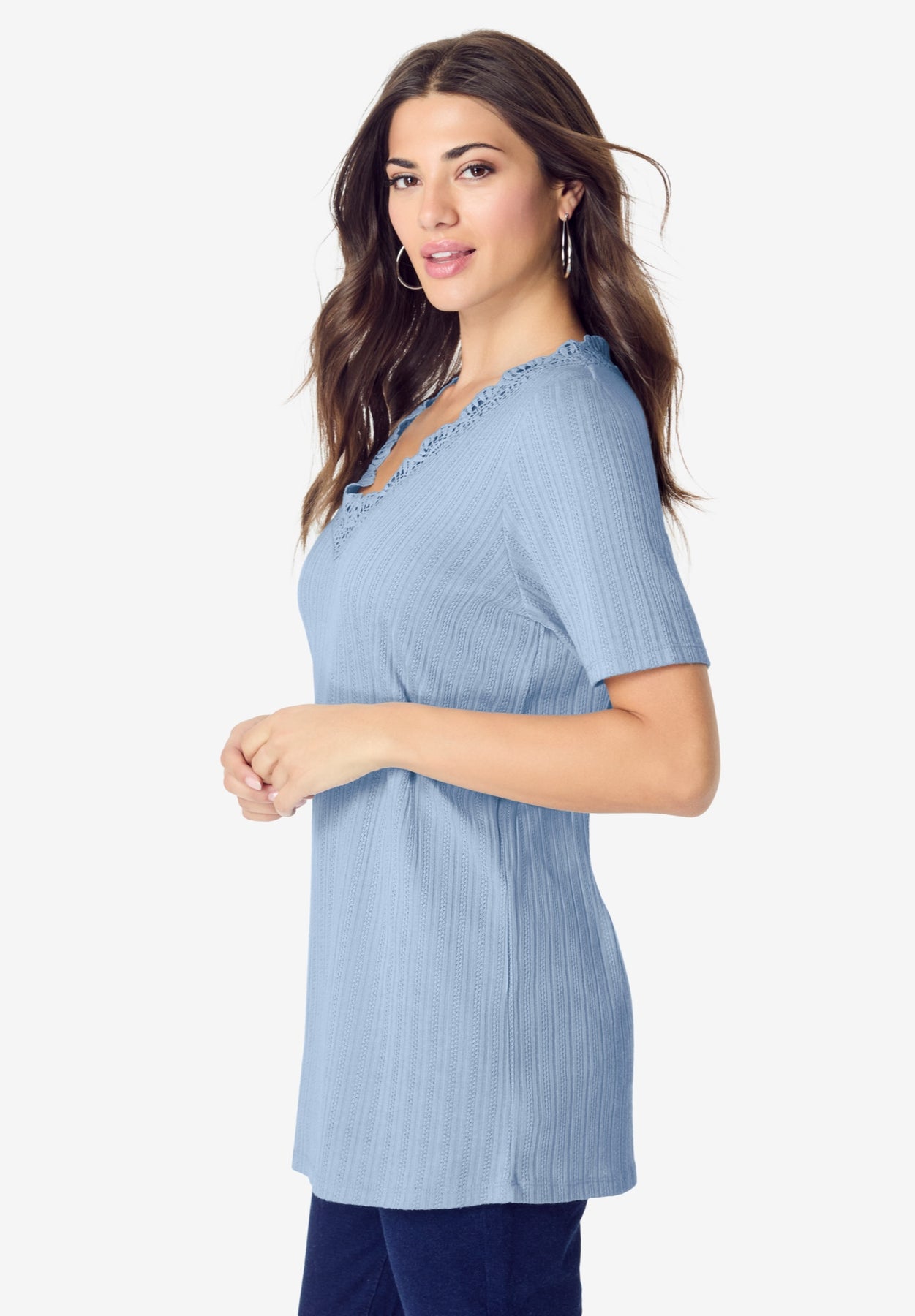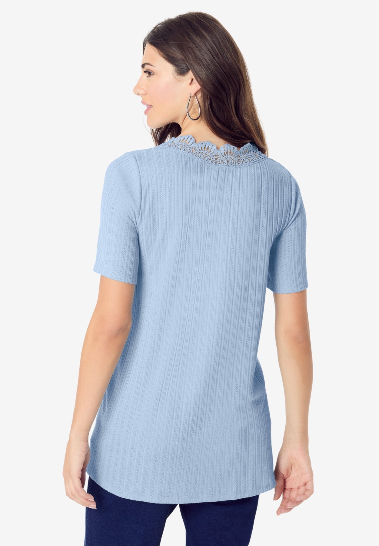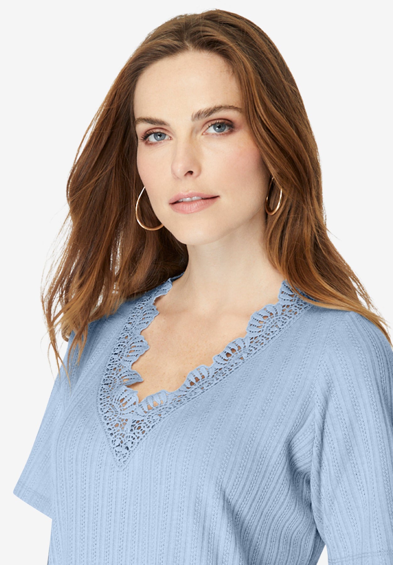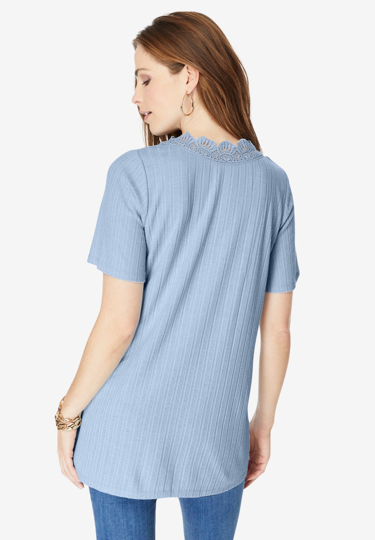 The scallop lace detailing on the v-neckline adds a romantic touch to this short-sleeve tee. Its straight silhouette drapes your curves well and looks great styled with a long skirt or straight-leg trousers.