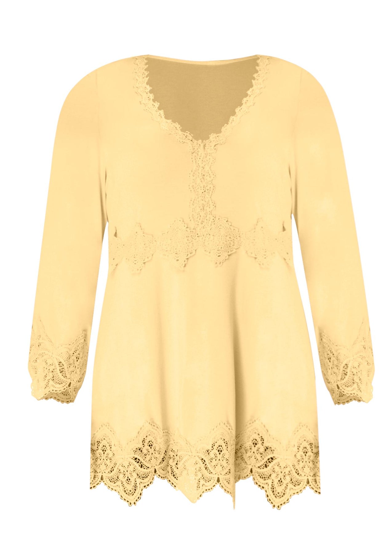 Love your look in this empire-waist V-neck tee with lots and lots of lace. Featuring intricate lace trim at neckline, high waist, cuffs and hem, this versatile tee has three-quarter sleeves and a flouncy flared silhouette. Dress it up with sleek pants and heels or dress it down with jeans!