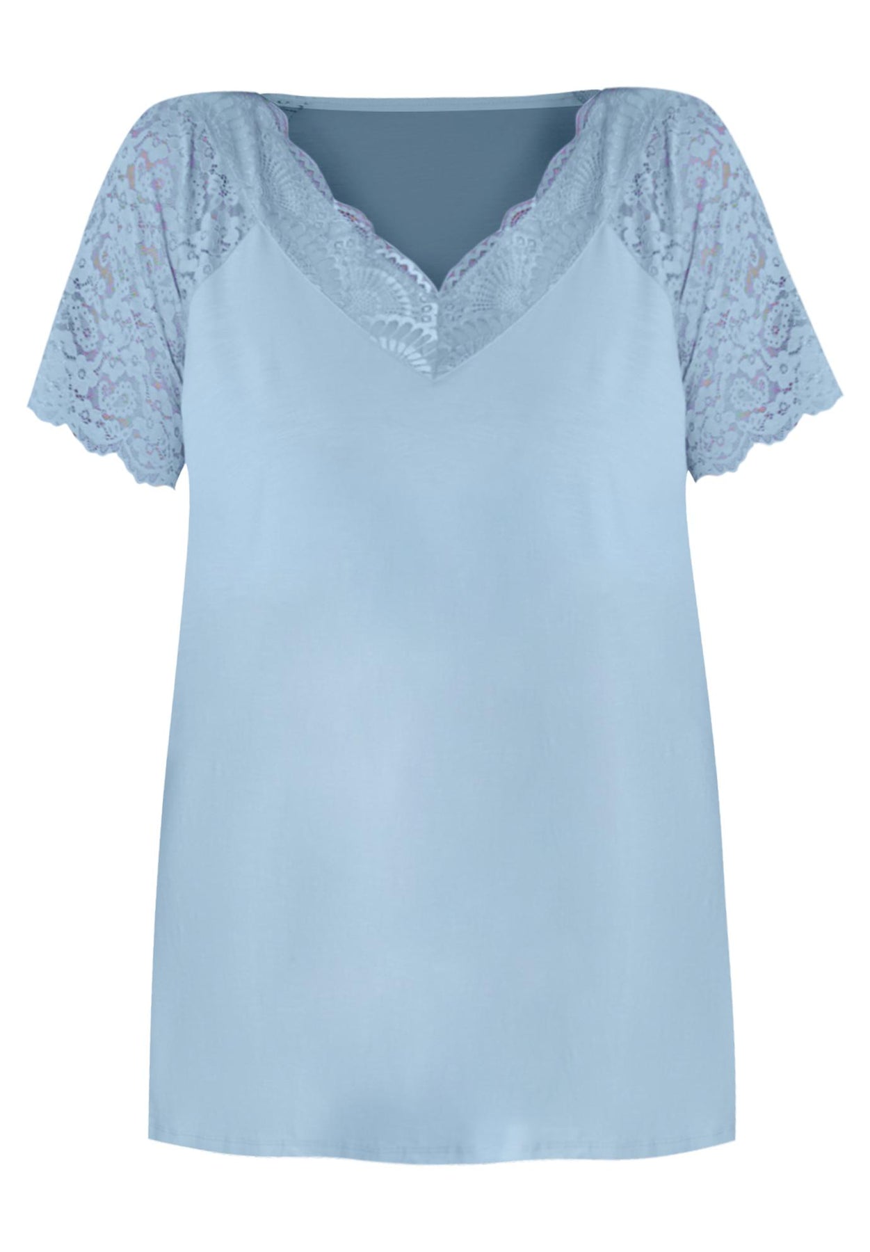 Pretty lace detail at this tee's scalloped v-neckline and on its raglan sleeves help you dress up any casual outfit. Its empire waist flatteringly drapes over your curves. Wear it with your favorite pair of jeans. Straight silhouette.