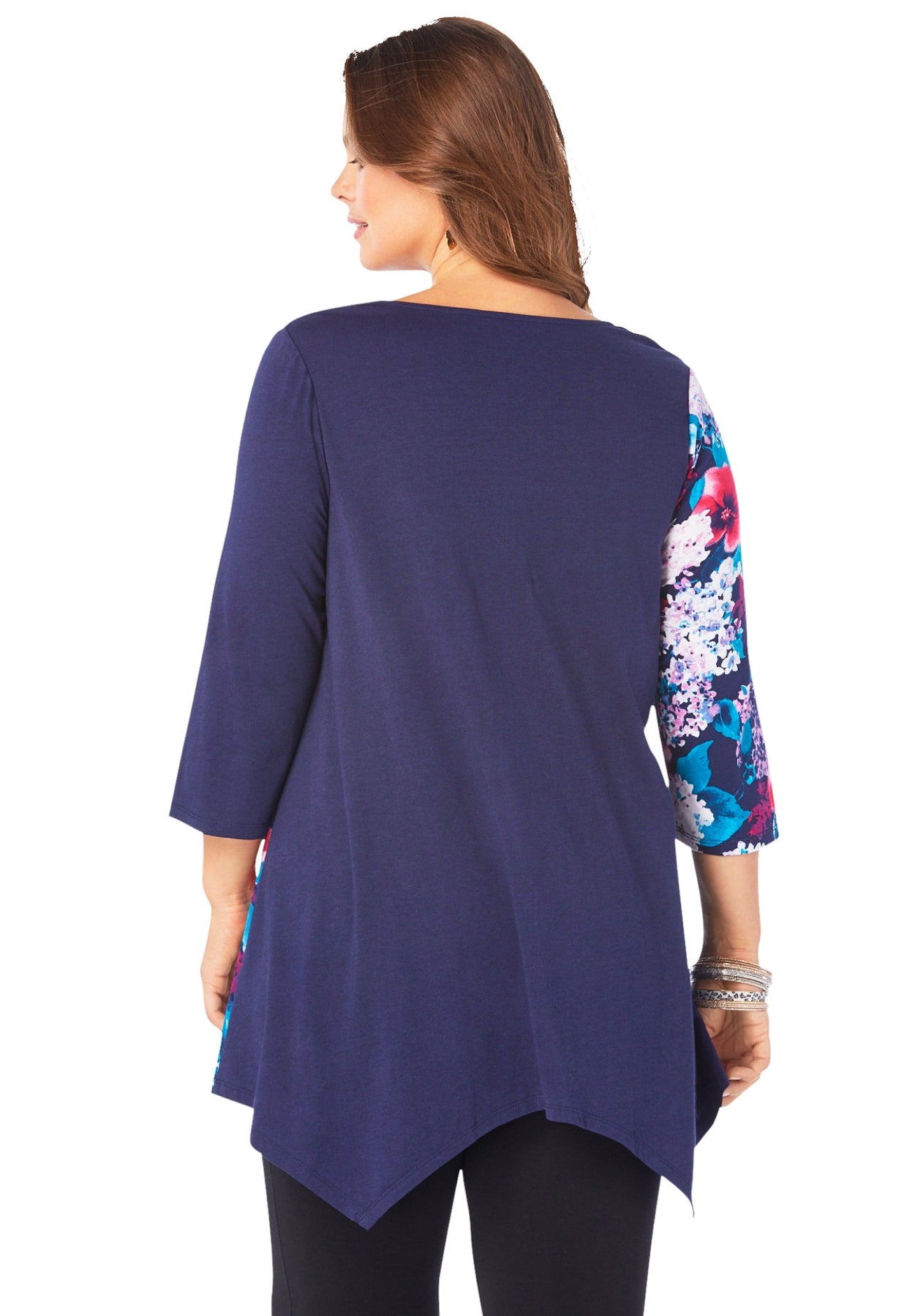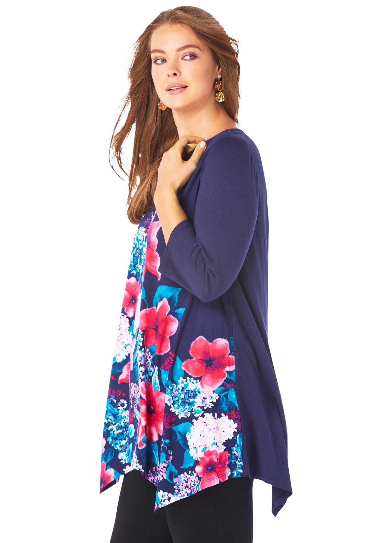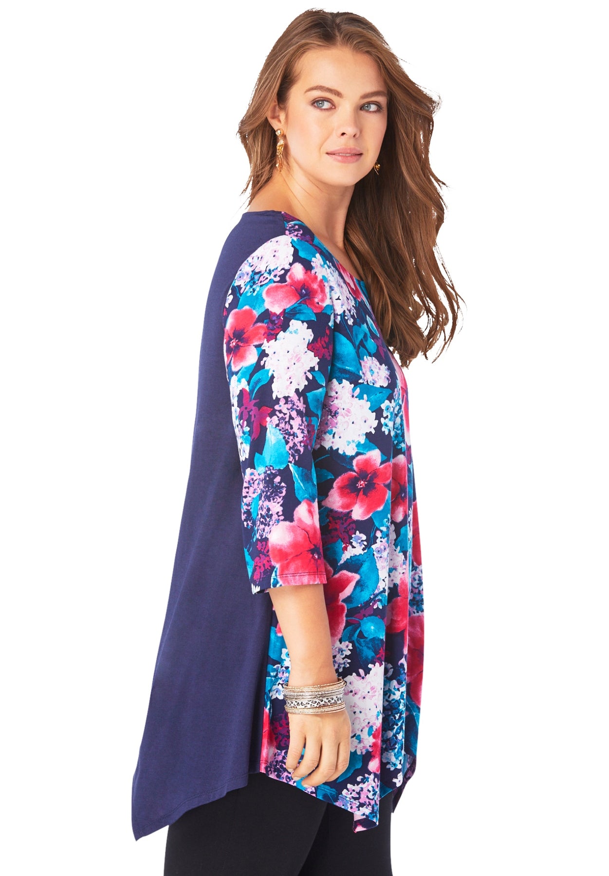 Printed with an eye-catching floral design, this tunic is made from breezy, breathable fabric and cut in the swingy silhouette you love. Three-quarter sleeves.