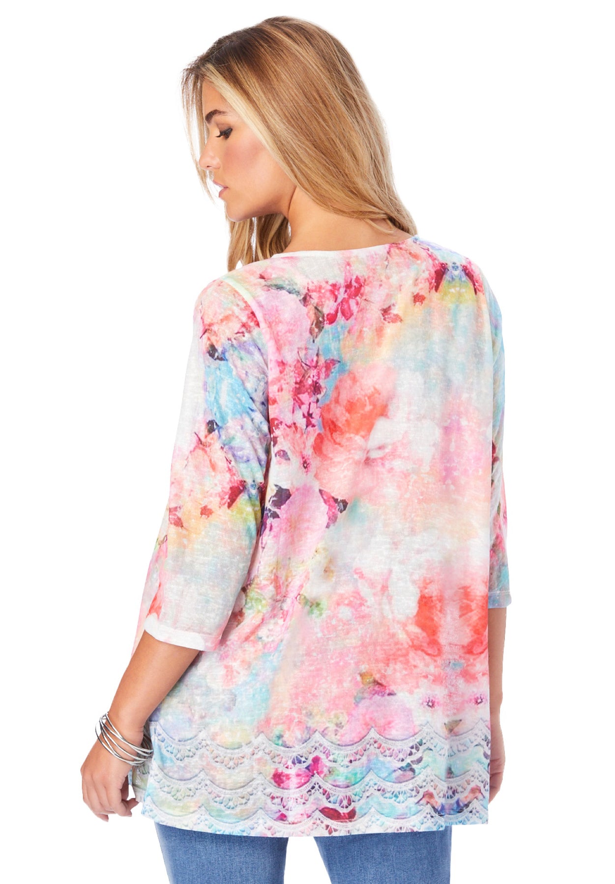 Made from a super lightweight knit, this 2-piece twin set surely makes the case for feminine style. A border-printed flyaway jacket with three-quarter sleeves sits atop a scoop-neck tank for relaxed style that can easily go from day to dinner and beyond.