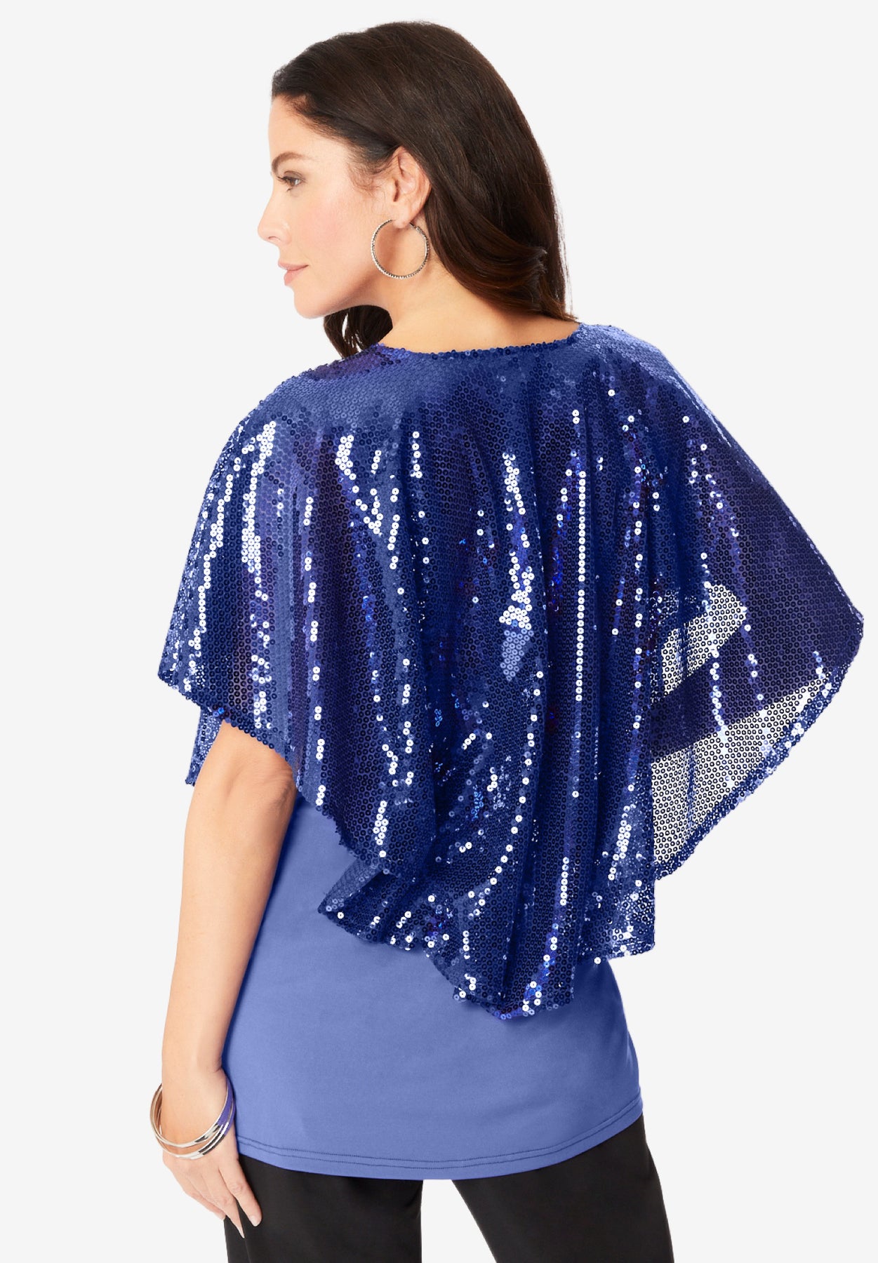 This jersey tee with a sequin popover adds shimmer and shine to your wardrobe. The dual-layered V-neck top has a stretch jersey base covered by a cropped sequin popover. The sequin layer falls over the shoulders, creating a fluttering mock short sleeve. Pair it with jeans for an effortlessly glam look.