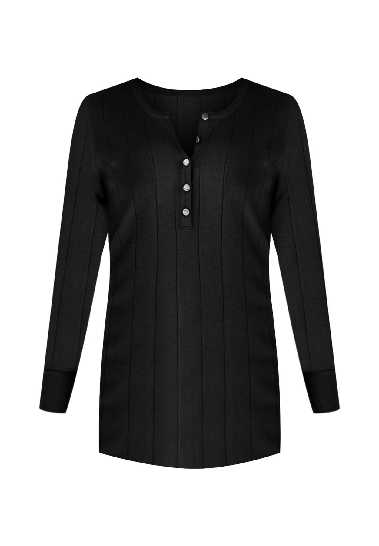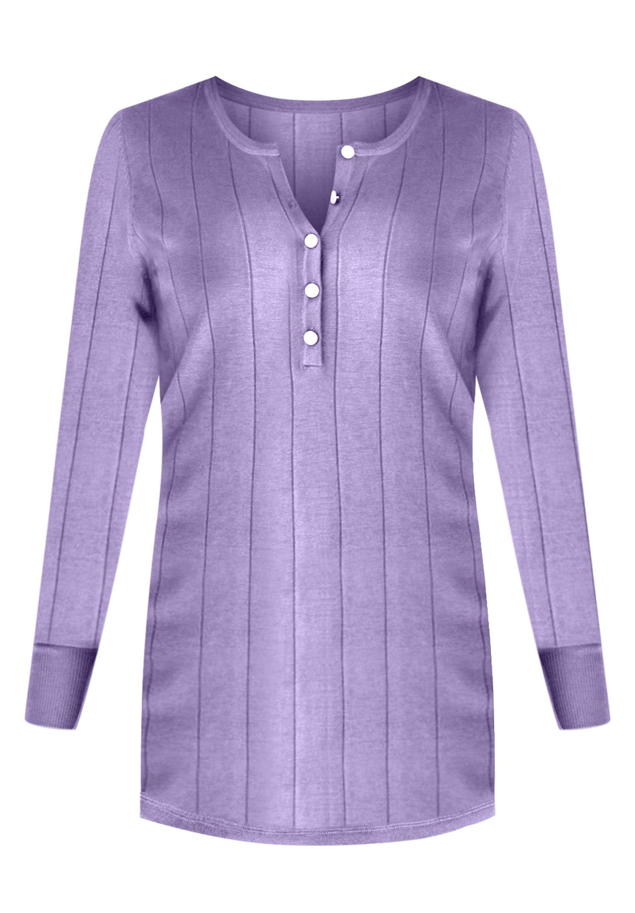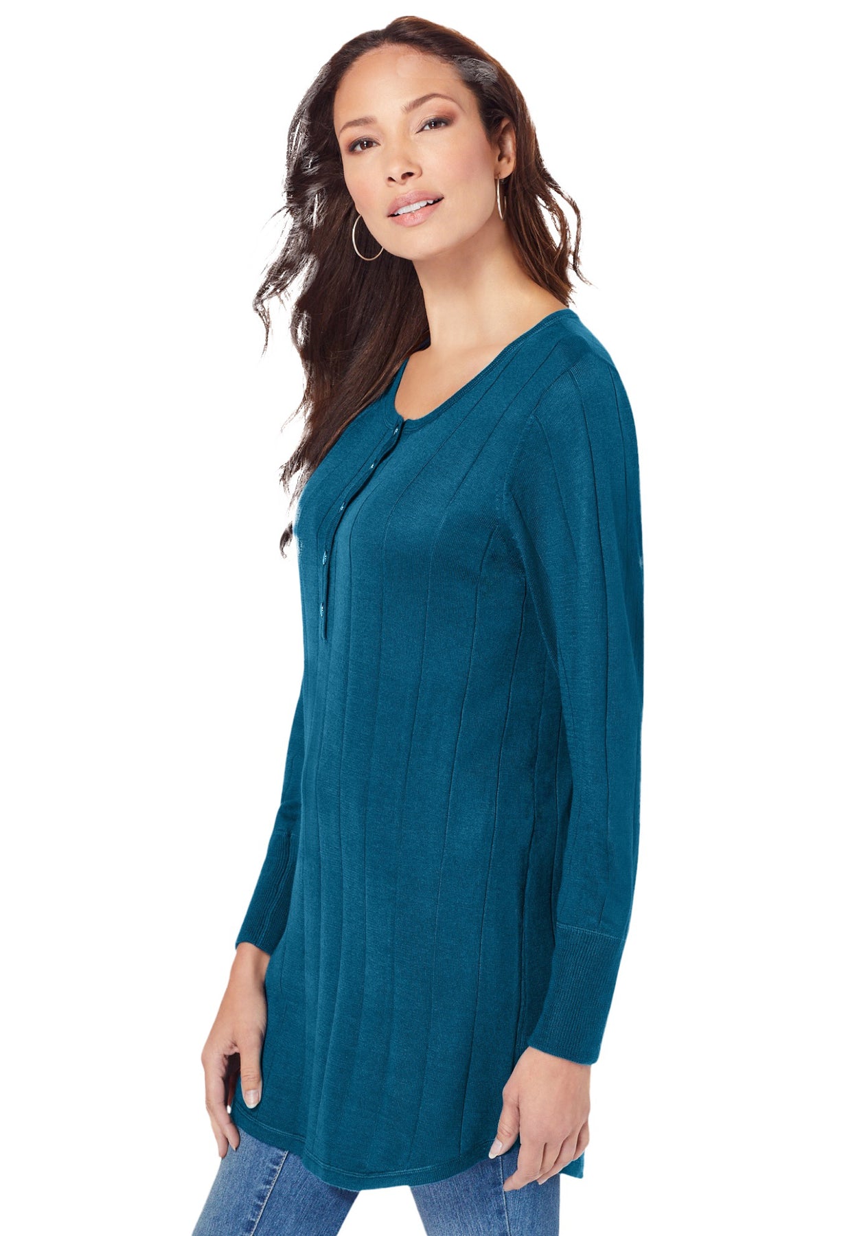 A casual sweater detailed with pretty buttons at the scoop neck. Made with a shirttail hem and rib trim.