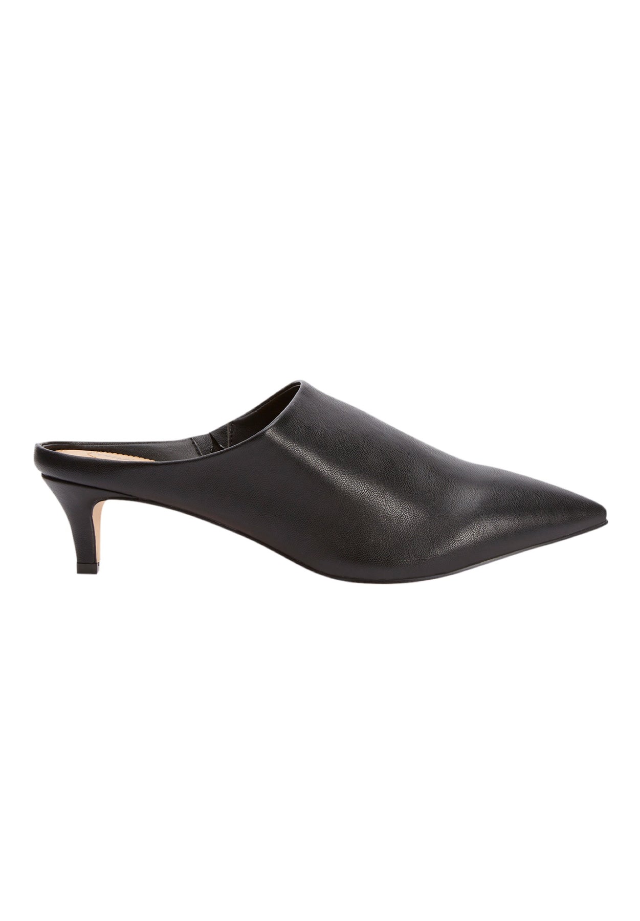 A smooth, supple leather-like upper distinguishes a streamlined mule in an ultra-stylish kitten heel silhouette.