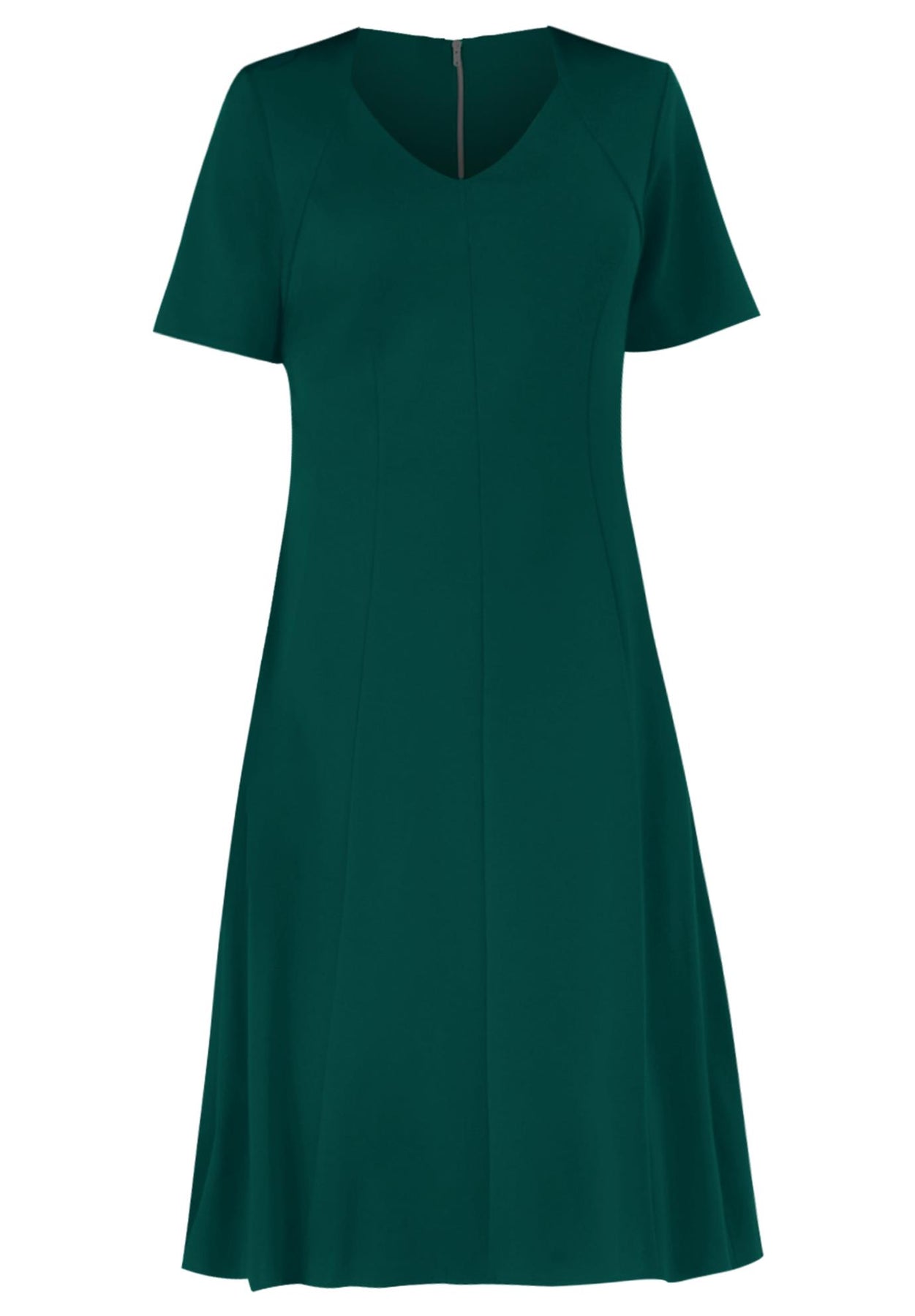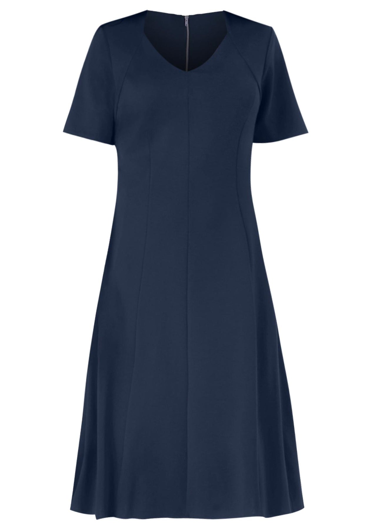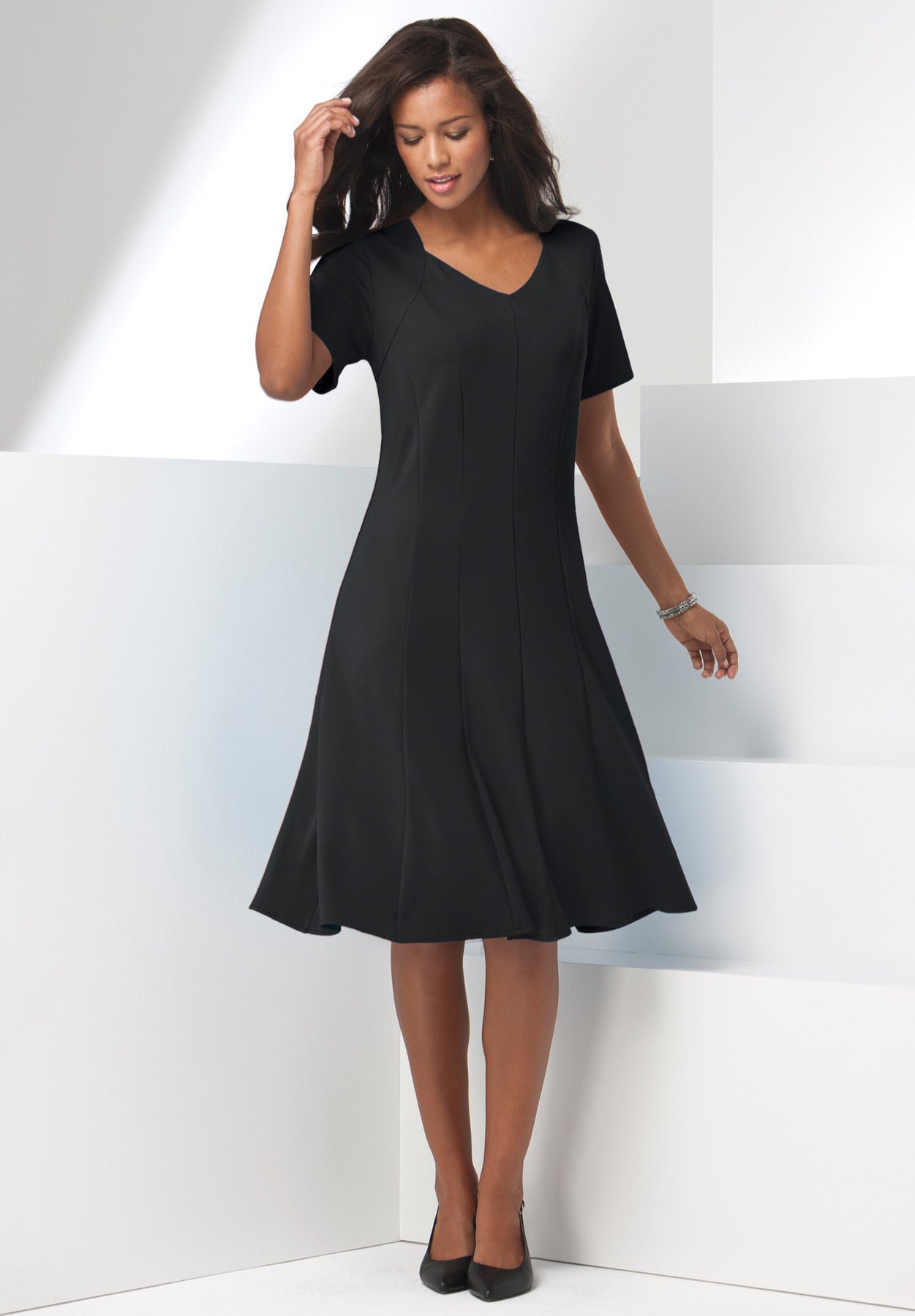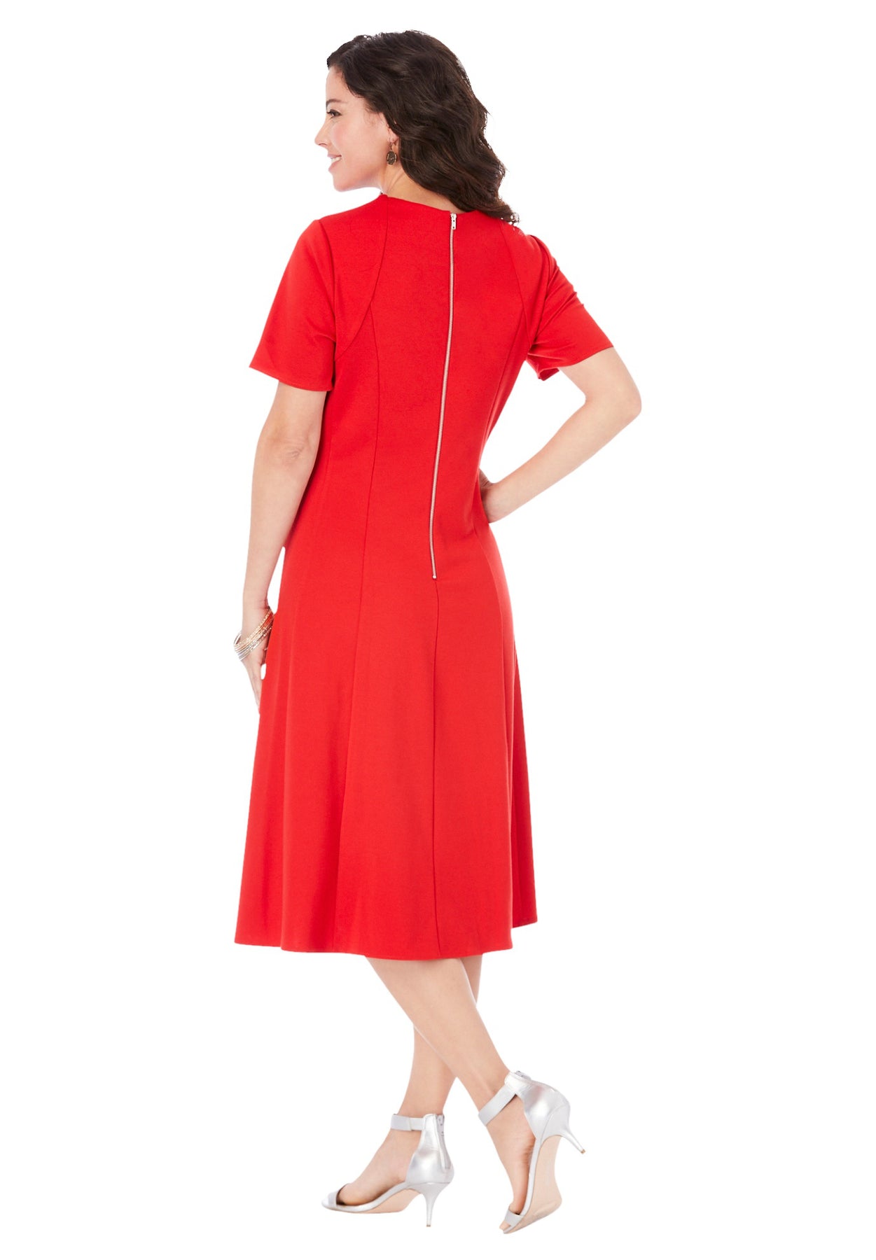 A dress with attitude for feeling (and looking) your best. Faux shrug style with short sleeves, fit-and-flare silhouette, back exposed zipper.