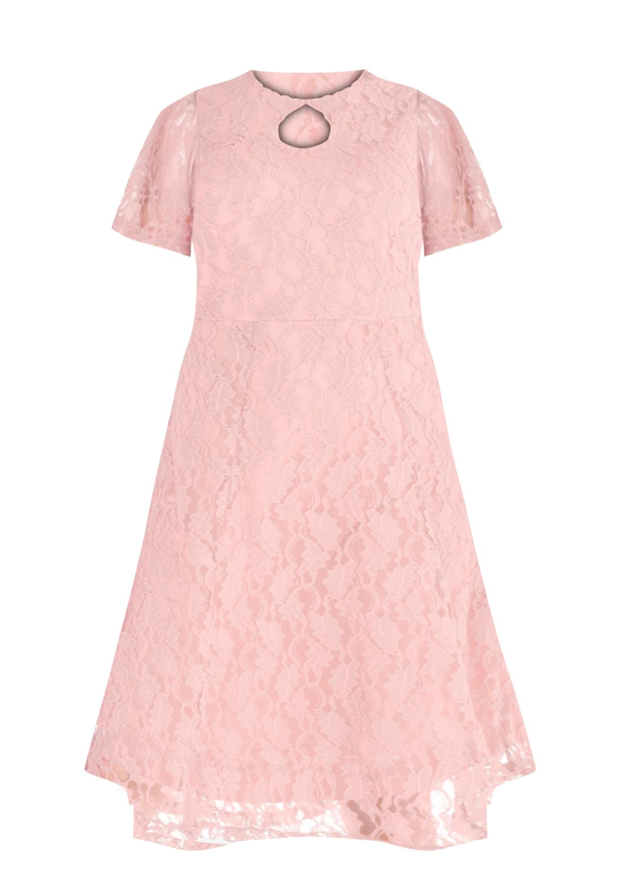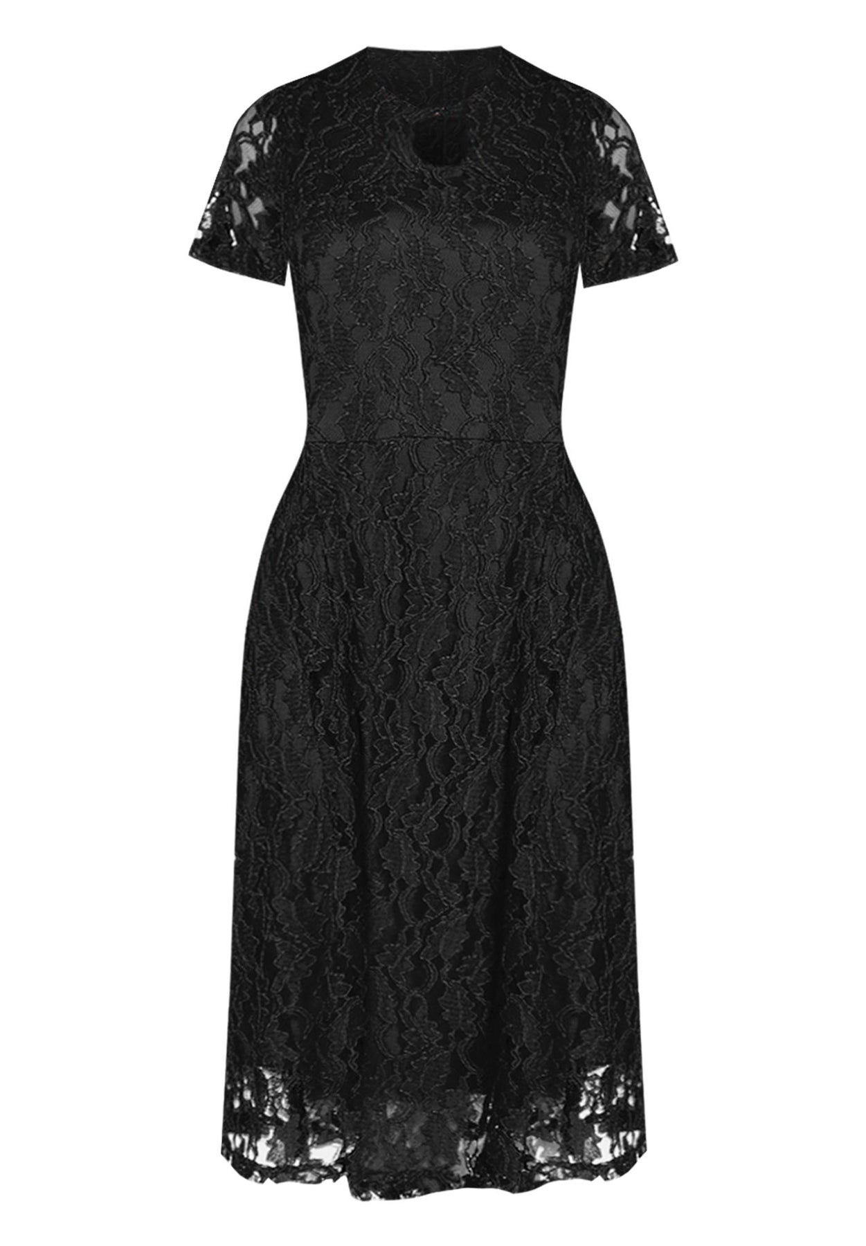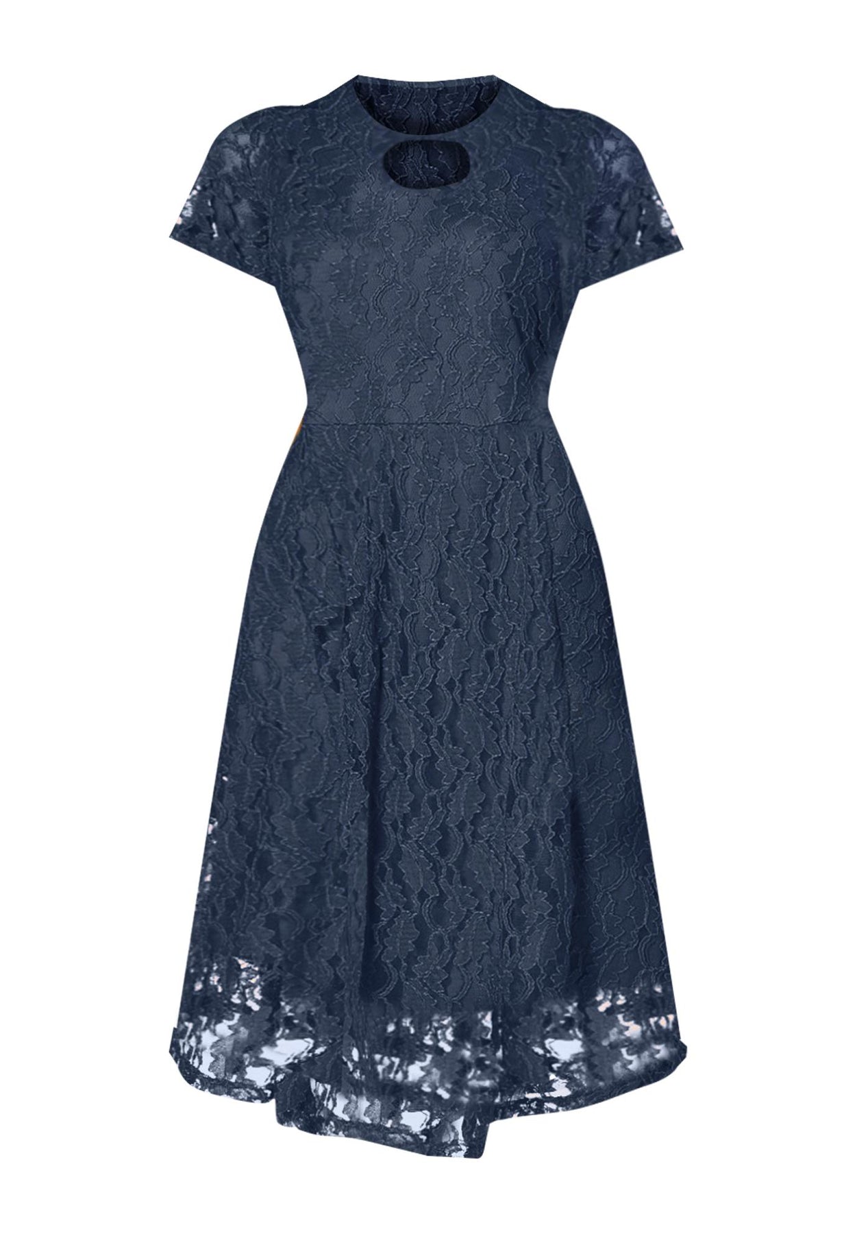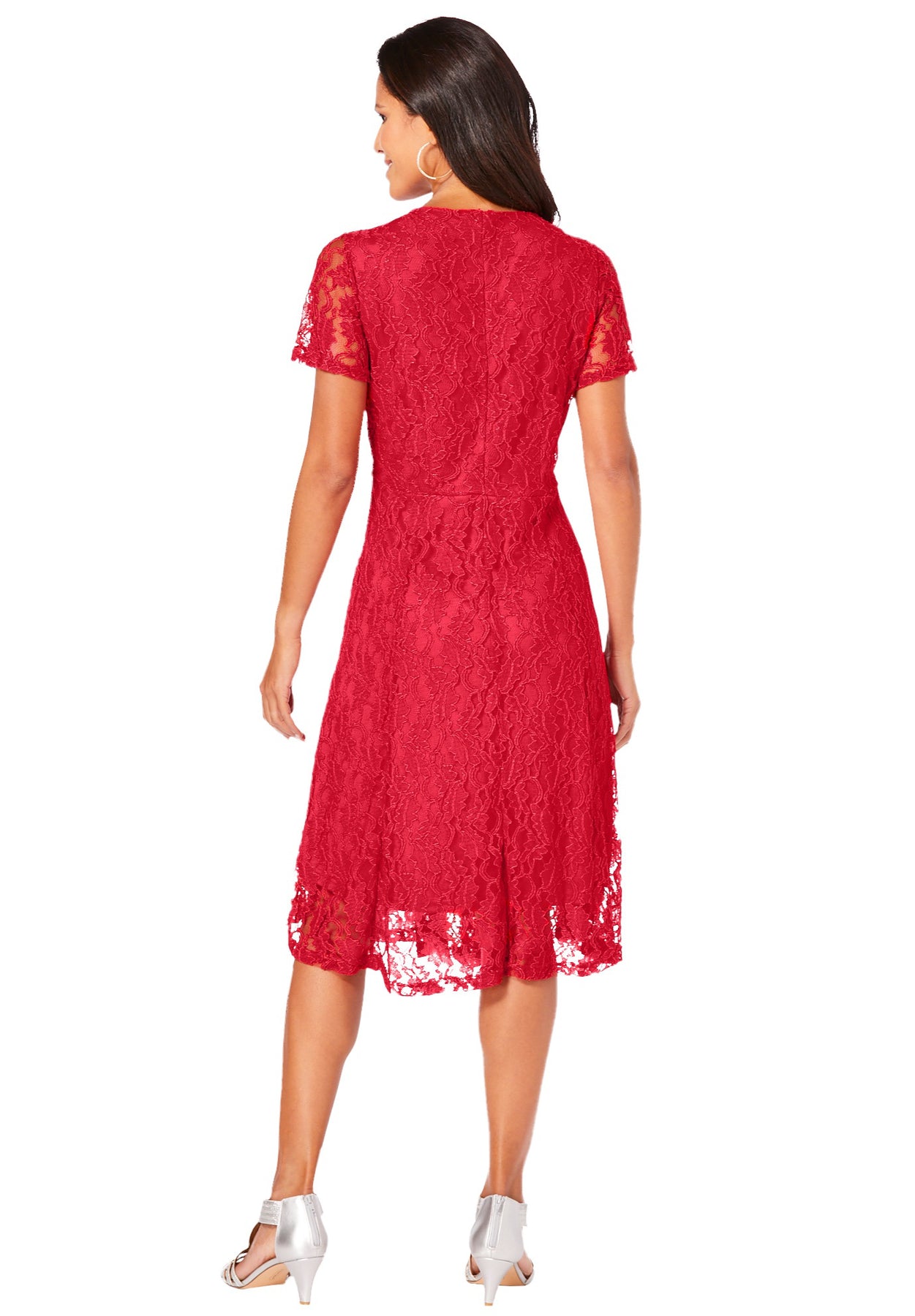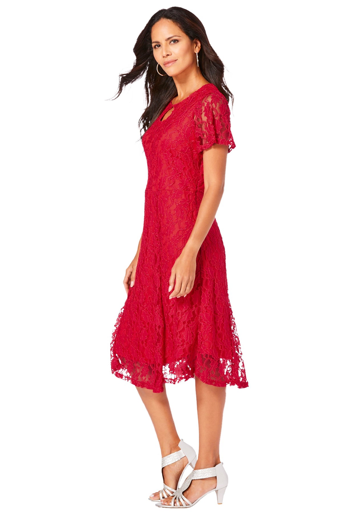 Look great from every angle in this charming allover lace dress featuring a so-pretty scalloped keyhole at the neckline. Flutter sleeves. Fully lined body. Side zip.