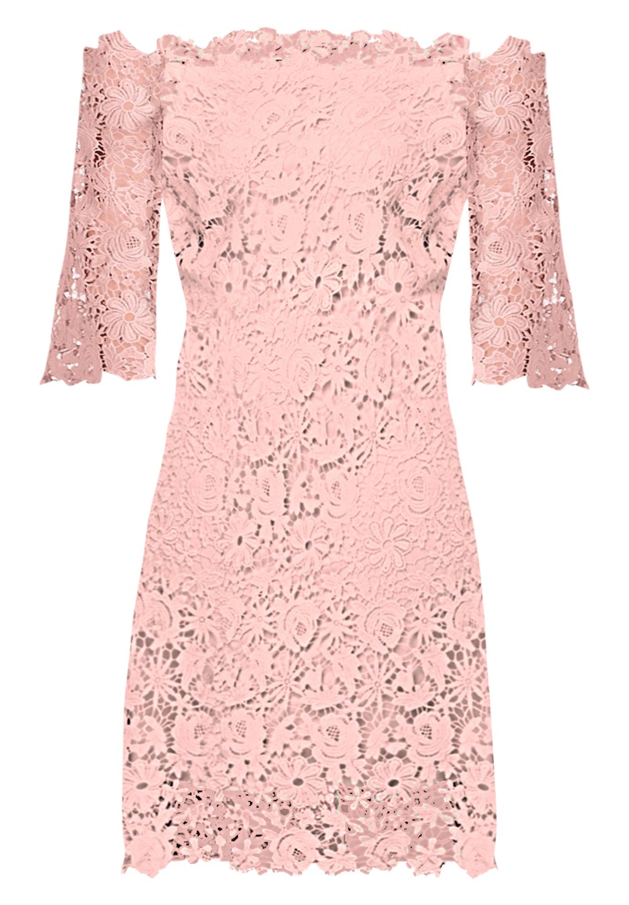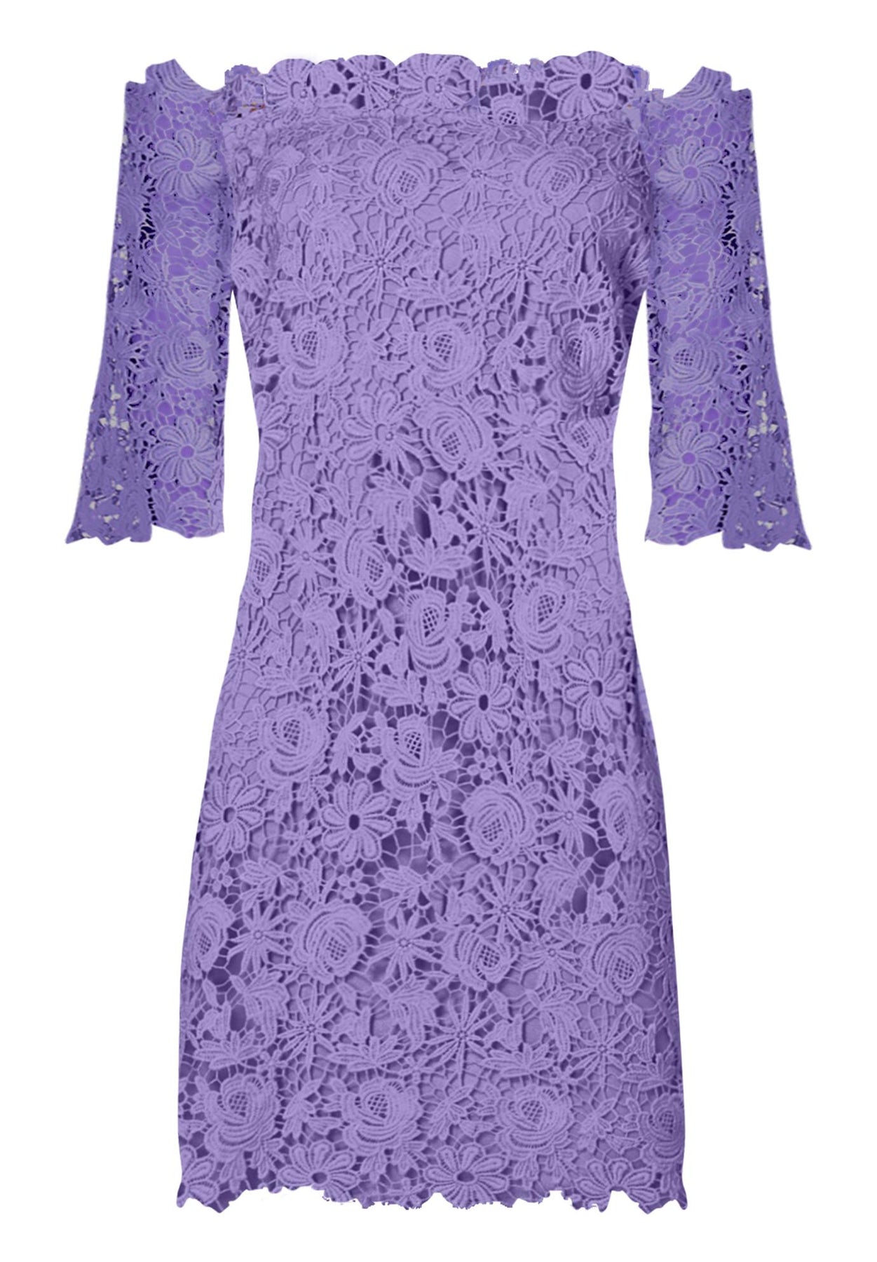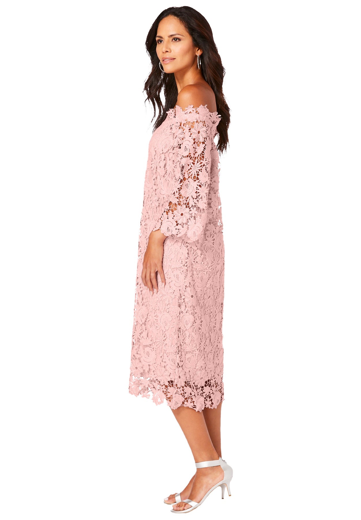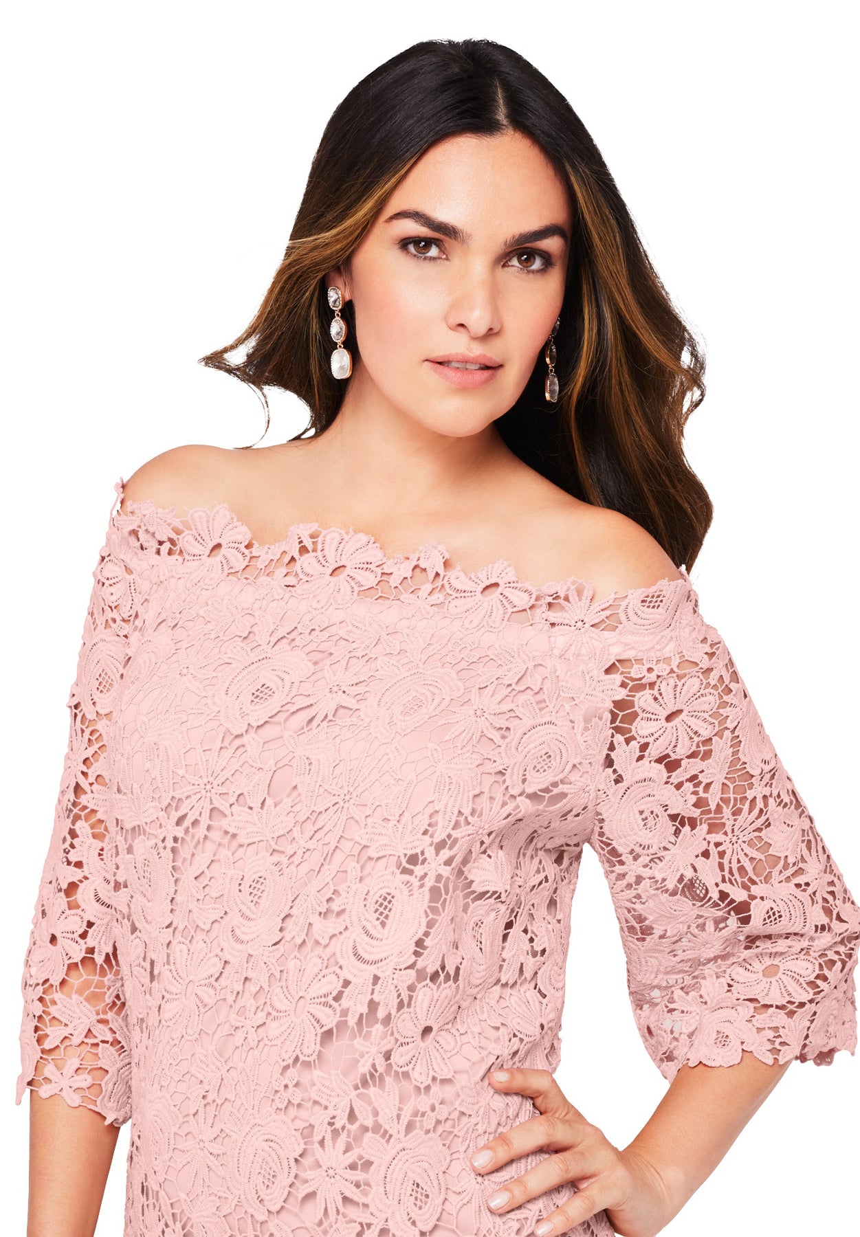 Look great from every angle in this charming allover lace dress featuring so-pretty scalloped edging. Elasticized neckline, three-quarter bell sleeves. Fully lined body.