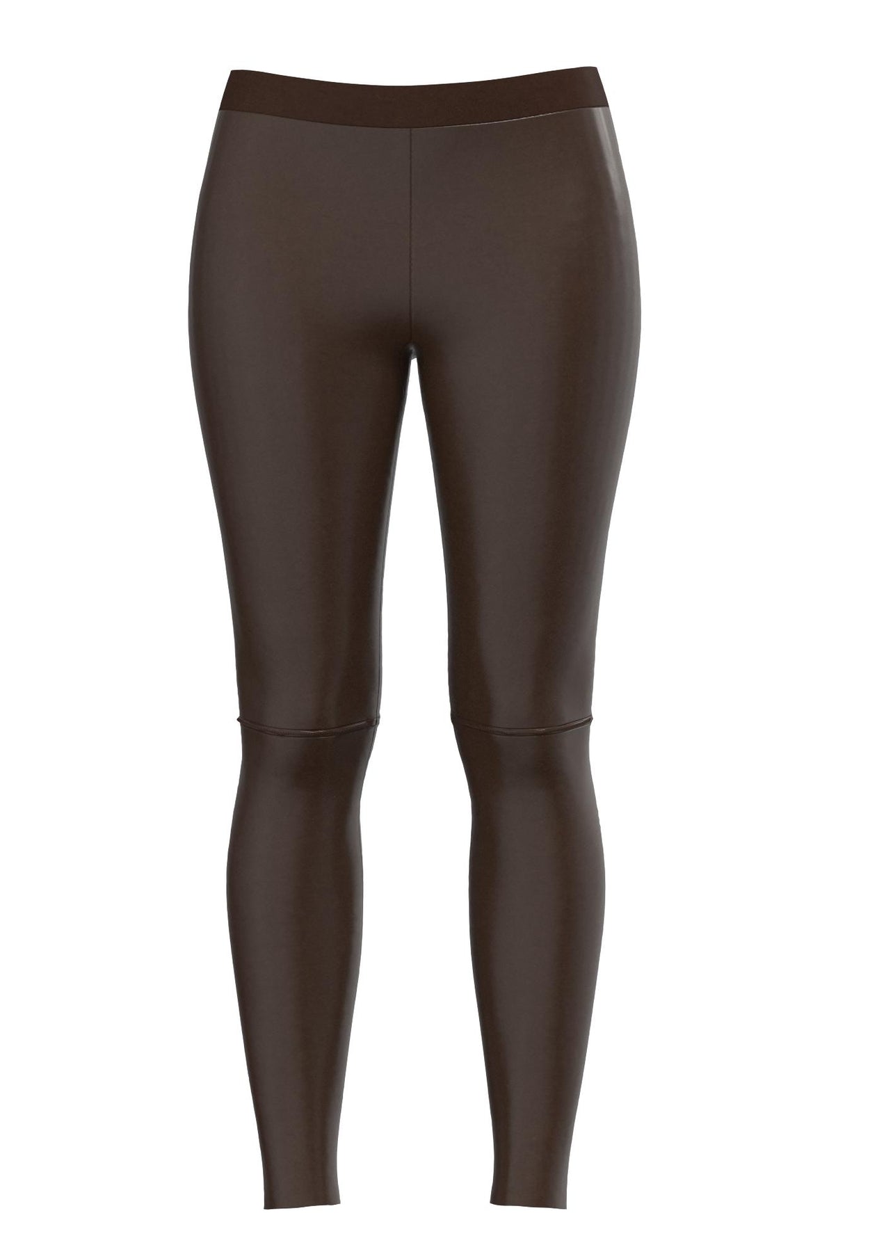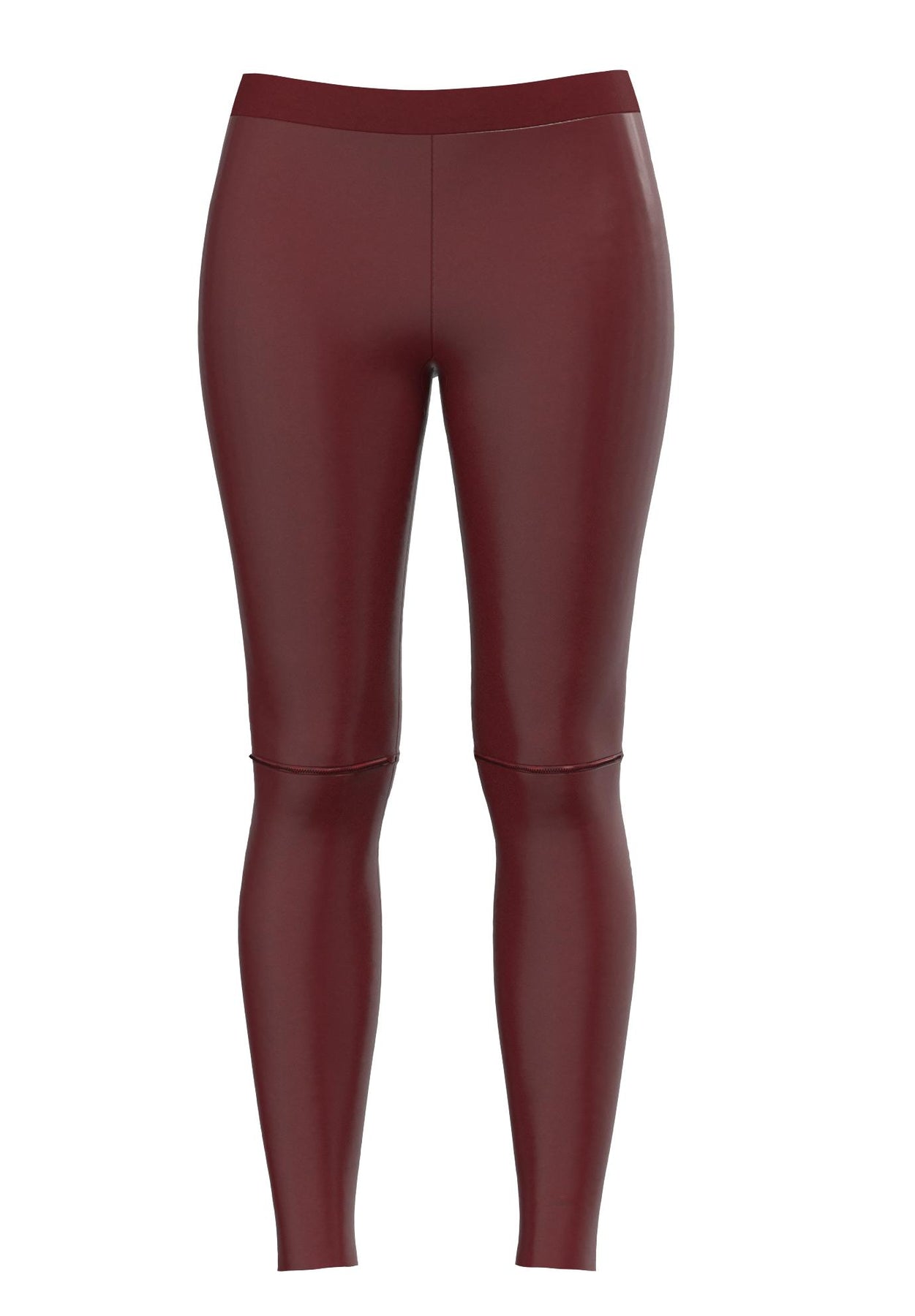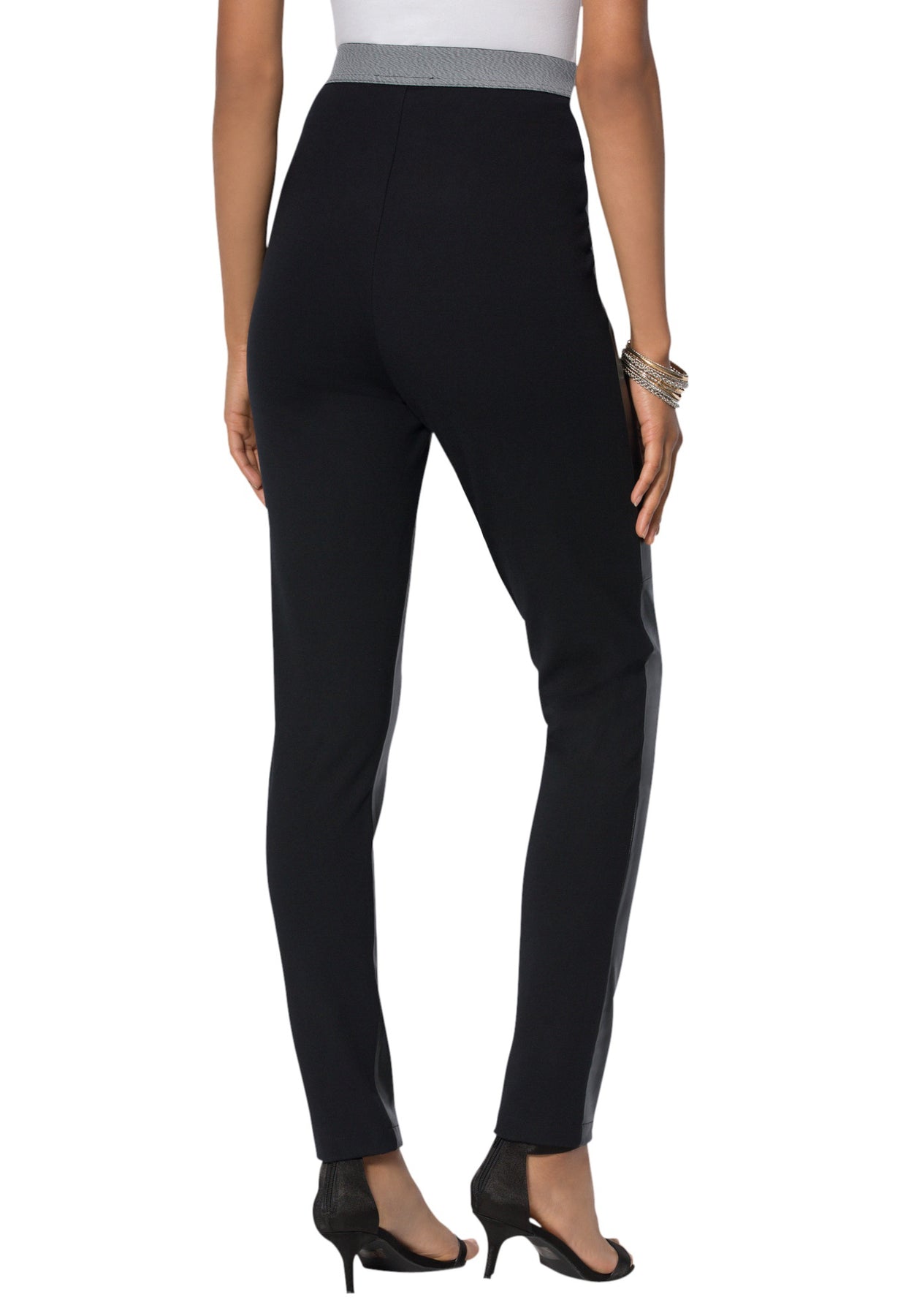 Faux leather-look front with smooth ponte back. Flat waistband, tapered leg.