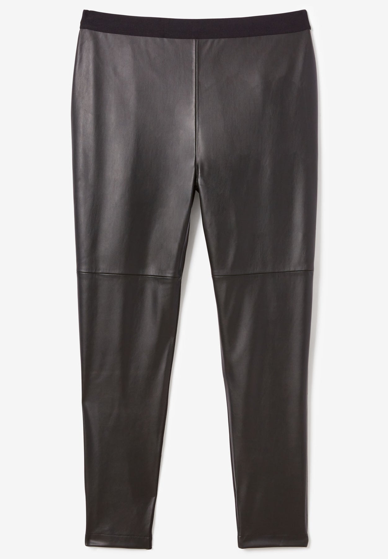 Faux leather-look front with smooth ponte back. Flat waistband, tapered leg.