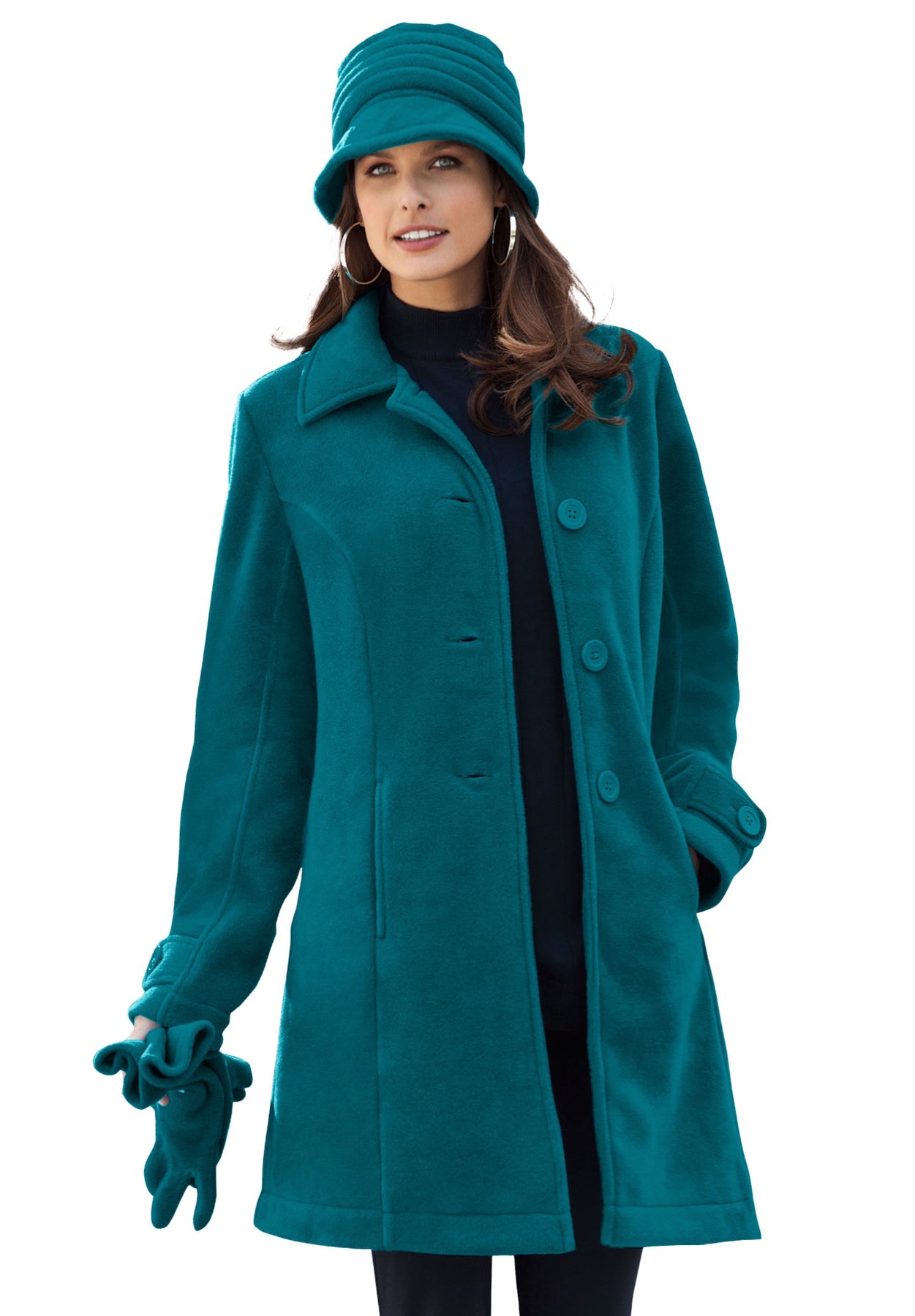 Fleece gets fashionable in this cozy jacket with an A-line silhouette and classic button front. Designed to warm up your style all season long, with princess seams, button tabs at the cuffs and on-seam pockets. Unlined.