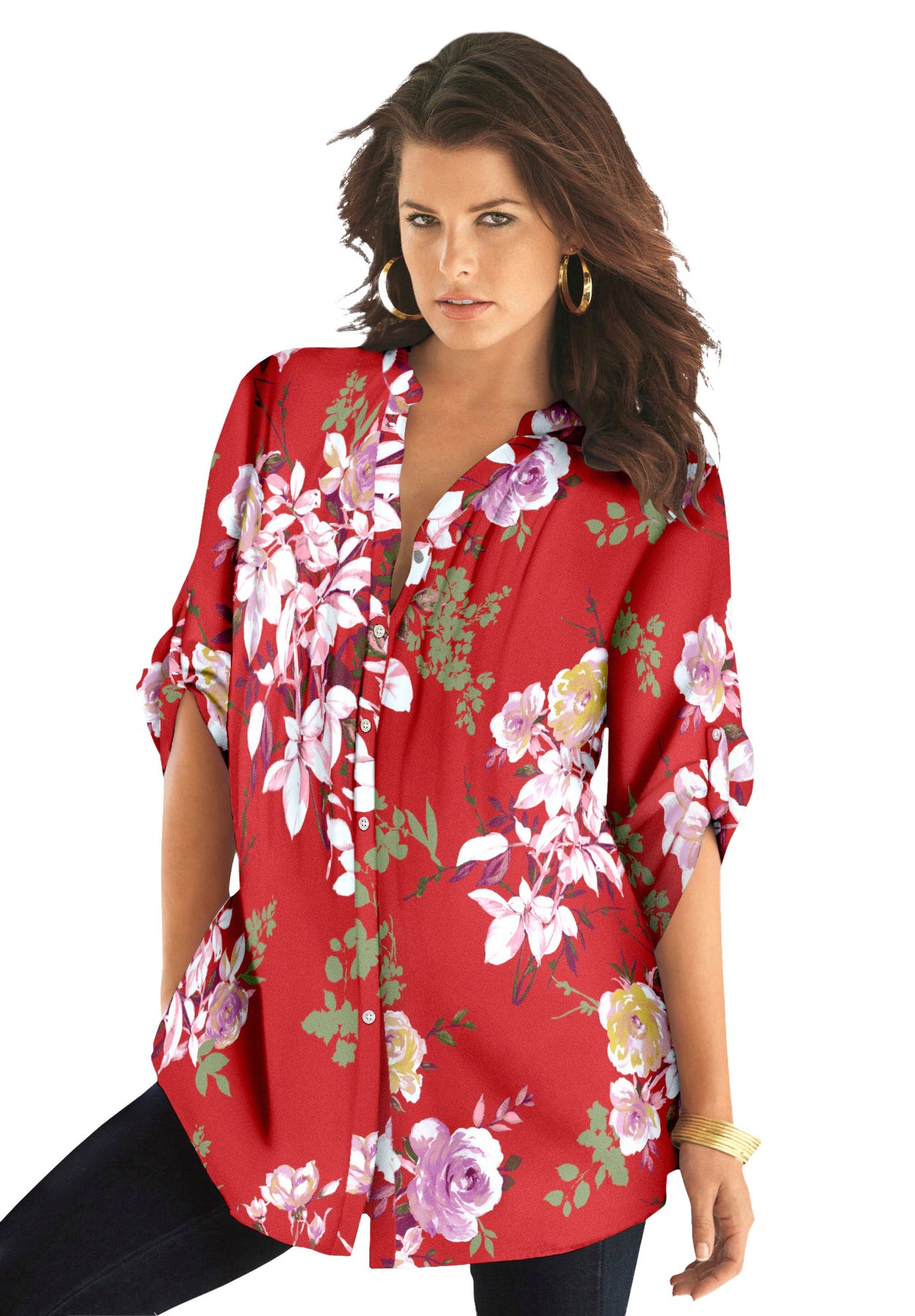 Plus Size Floral Y-Neck Pintuck Tunic – Adjustable Long Sleeve Button-Front, Relaxed Shirt Style | Roaman&
