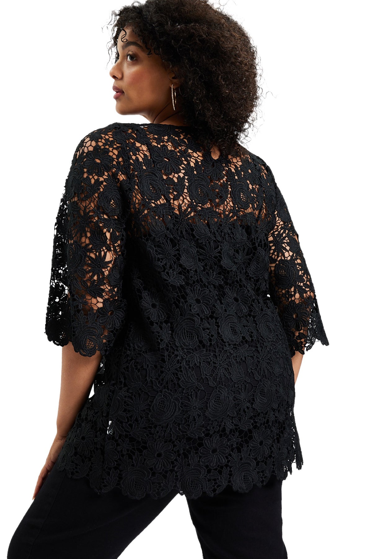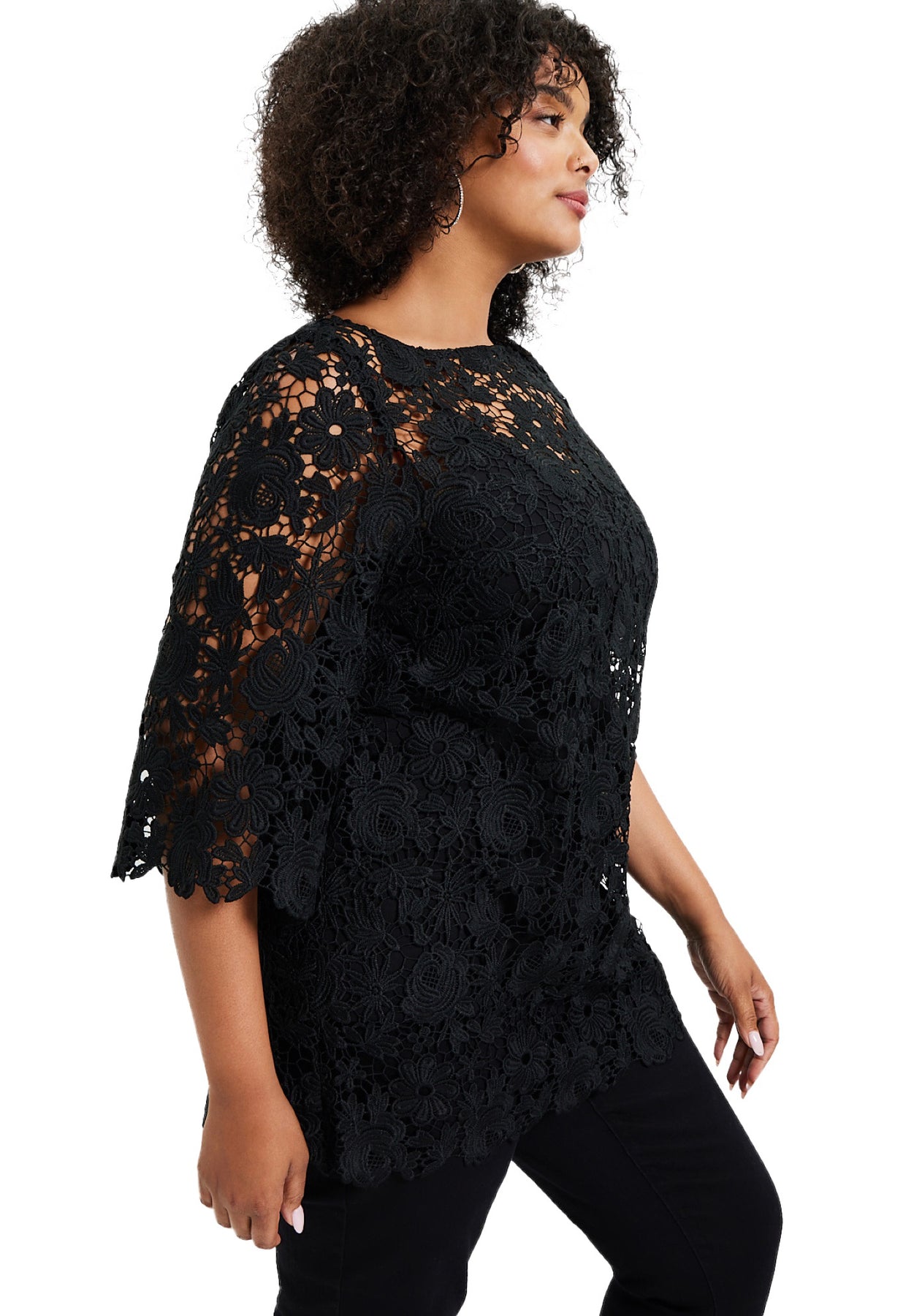 All-over lace, a boatneck design and three-quarter sleeves add just the right amount of romance. A-line silhouette. Unlined. This style tends to run big, sizing down is recommended for a better fit.