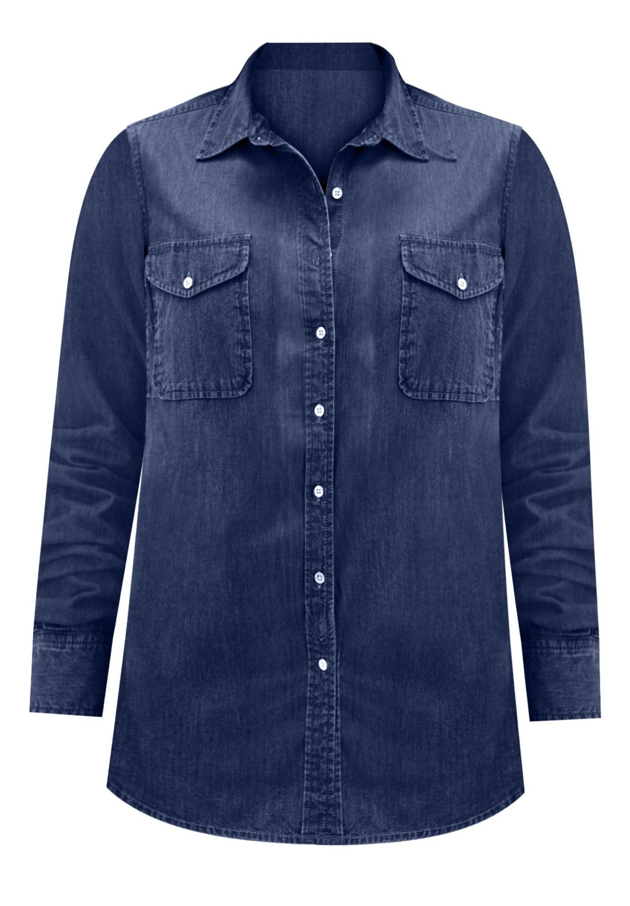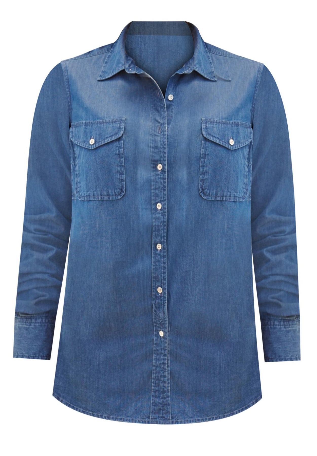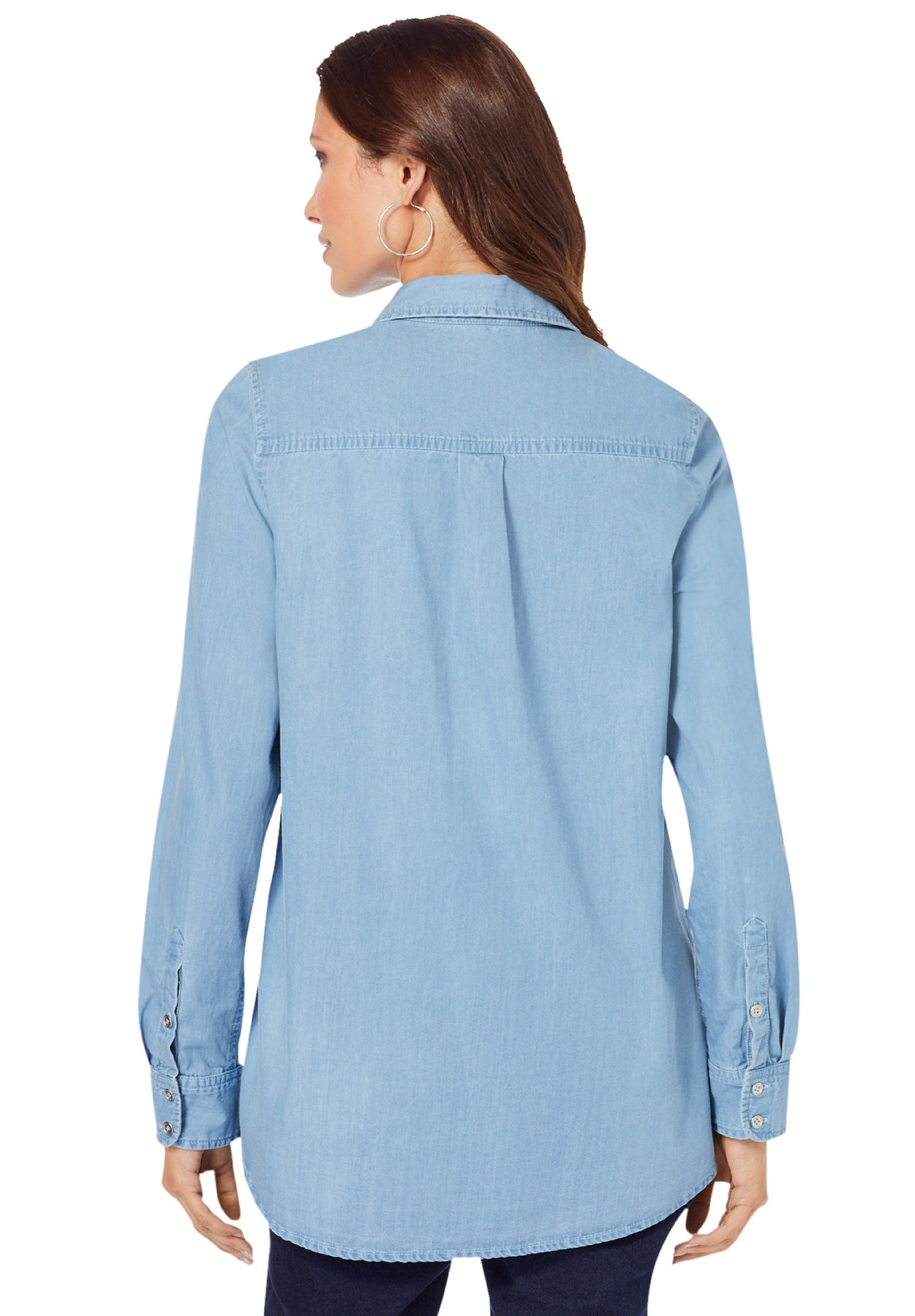 A figure-loving fit and a button front design make this denim shirt an absolute must for the season. Add printed or colored jeans for an on-trend look that keeps you at the top of your style game. A-line silhouette. Two front-chest pockets.