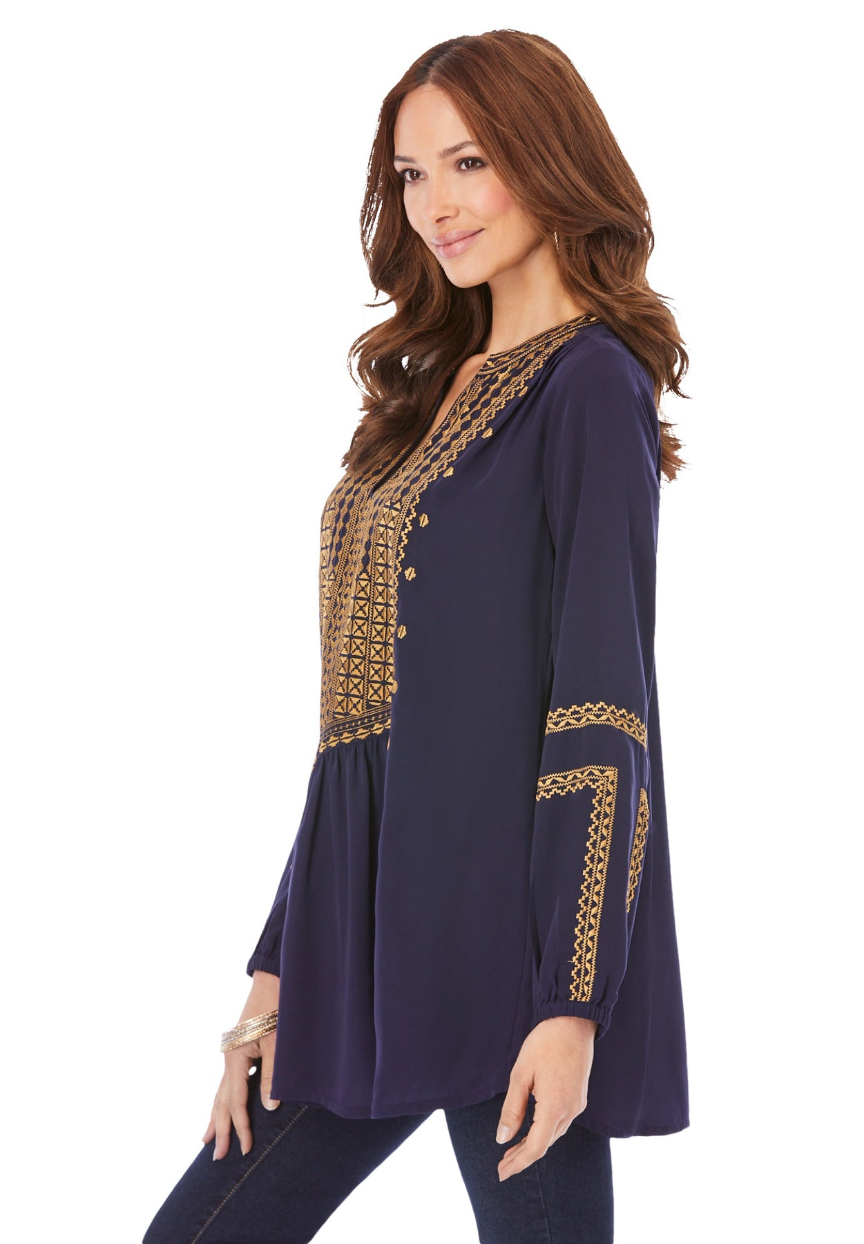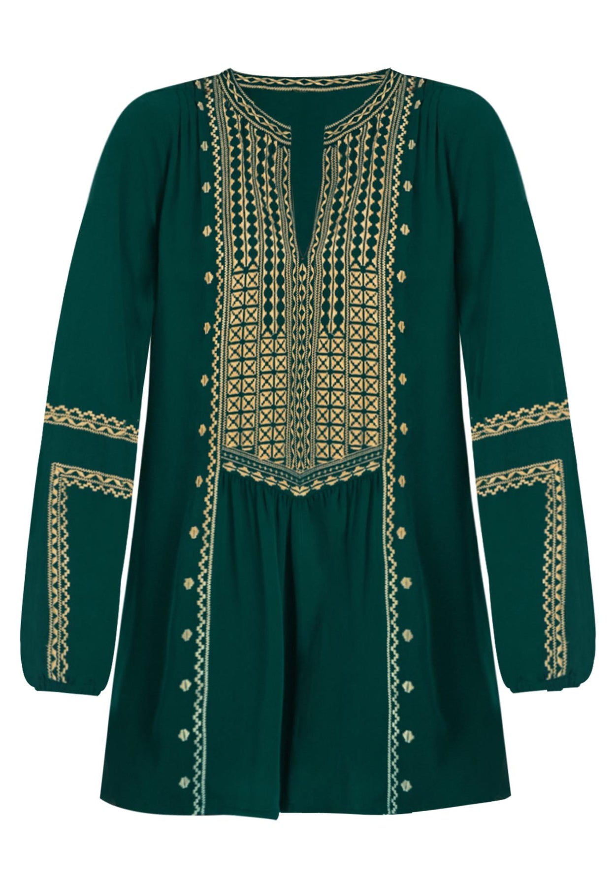 A boho-inspired notch-neck embroidered tunic that dresses up any season with an a-line silhouette and embroidery detail throughout.