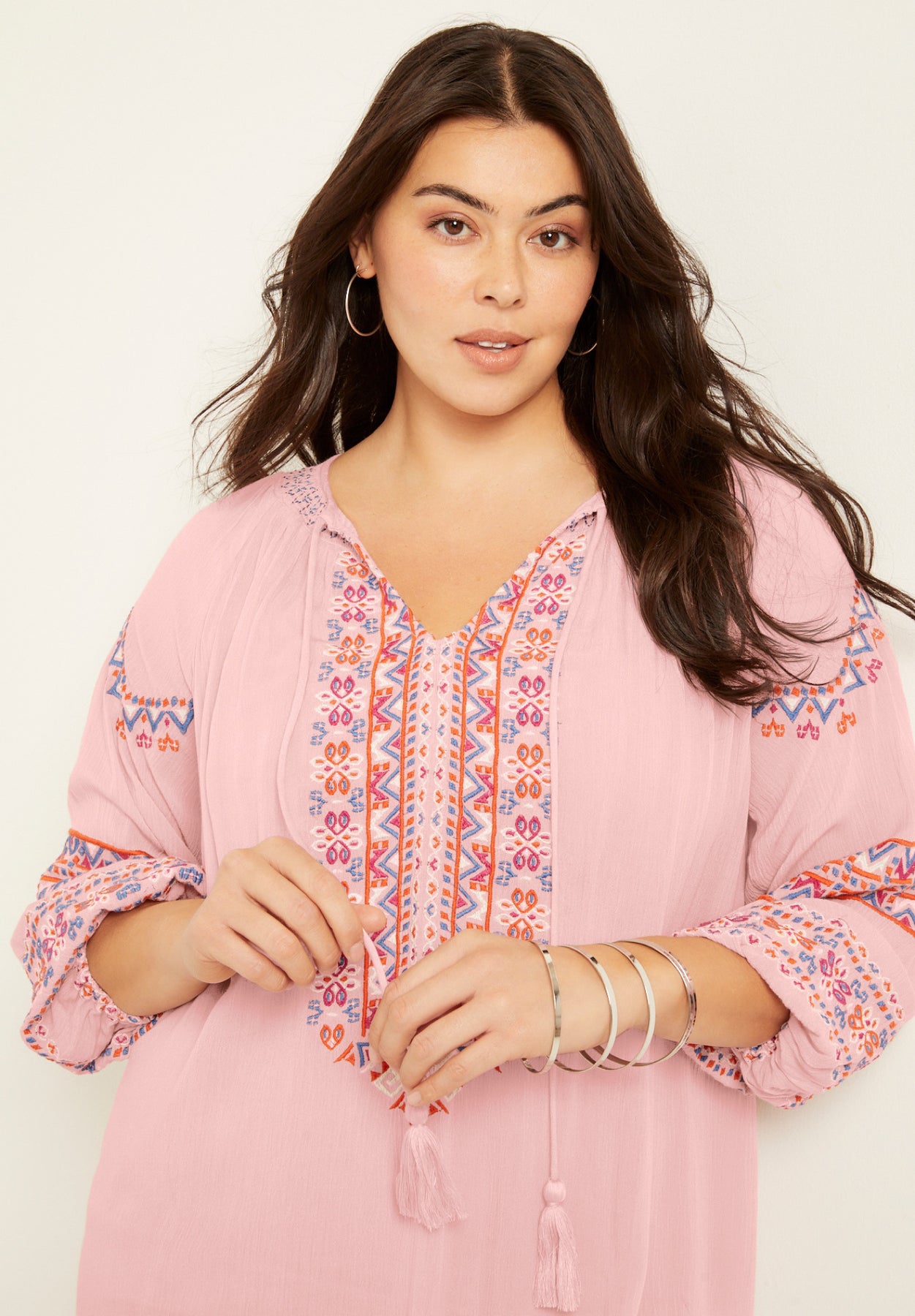 Get in touch with your boho side thanks to this pretty embroidered style. Finished with fun tassel ties at the neckline, it's outlined with voluminous puffed sleeves.
