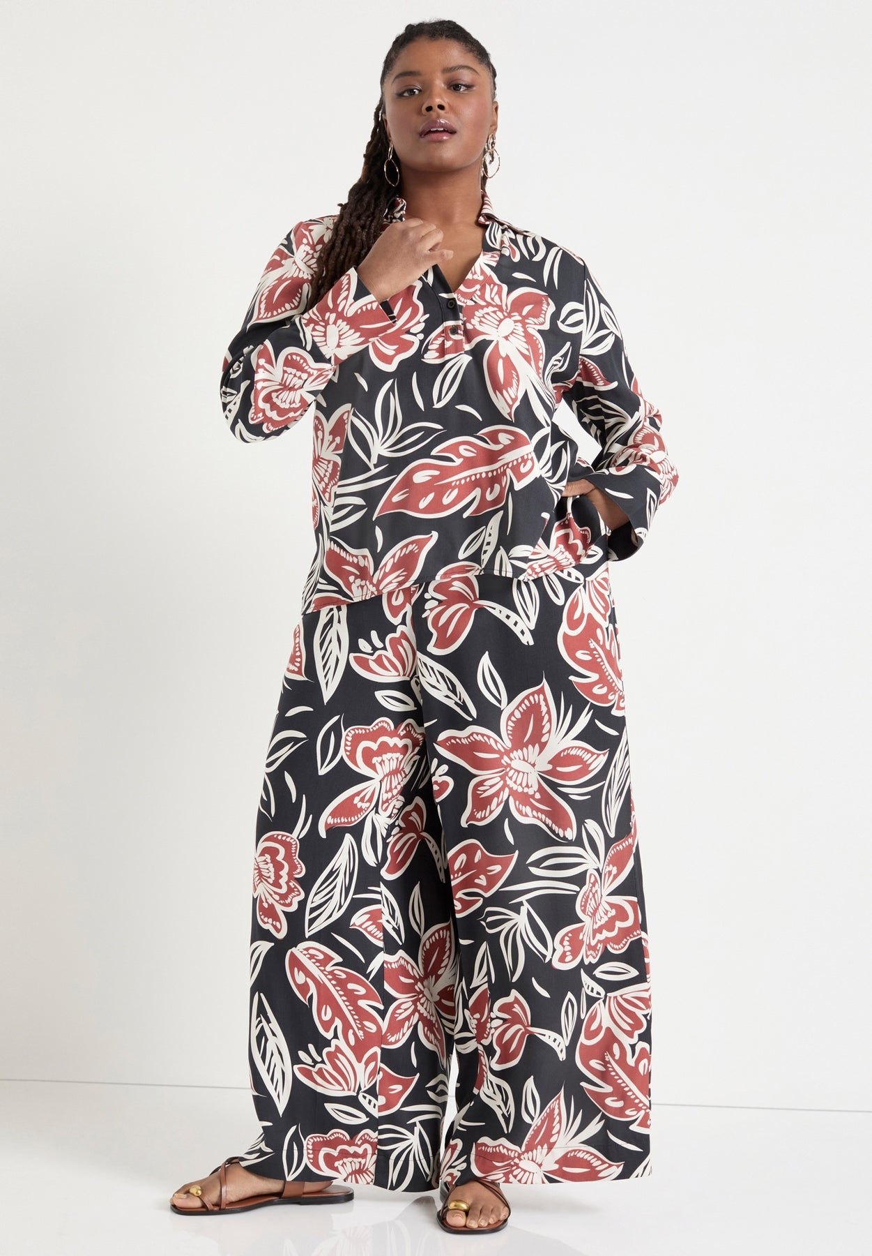 This slightly cropped blouse features a collared, button-front design and long sleeves with button cuffs for a polished look. This rayon twill top offers a modern, chic silhouette, perfect for office hours and beyond.