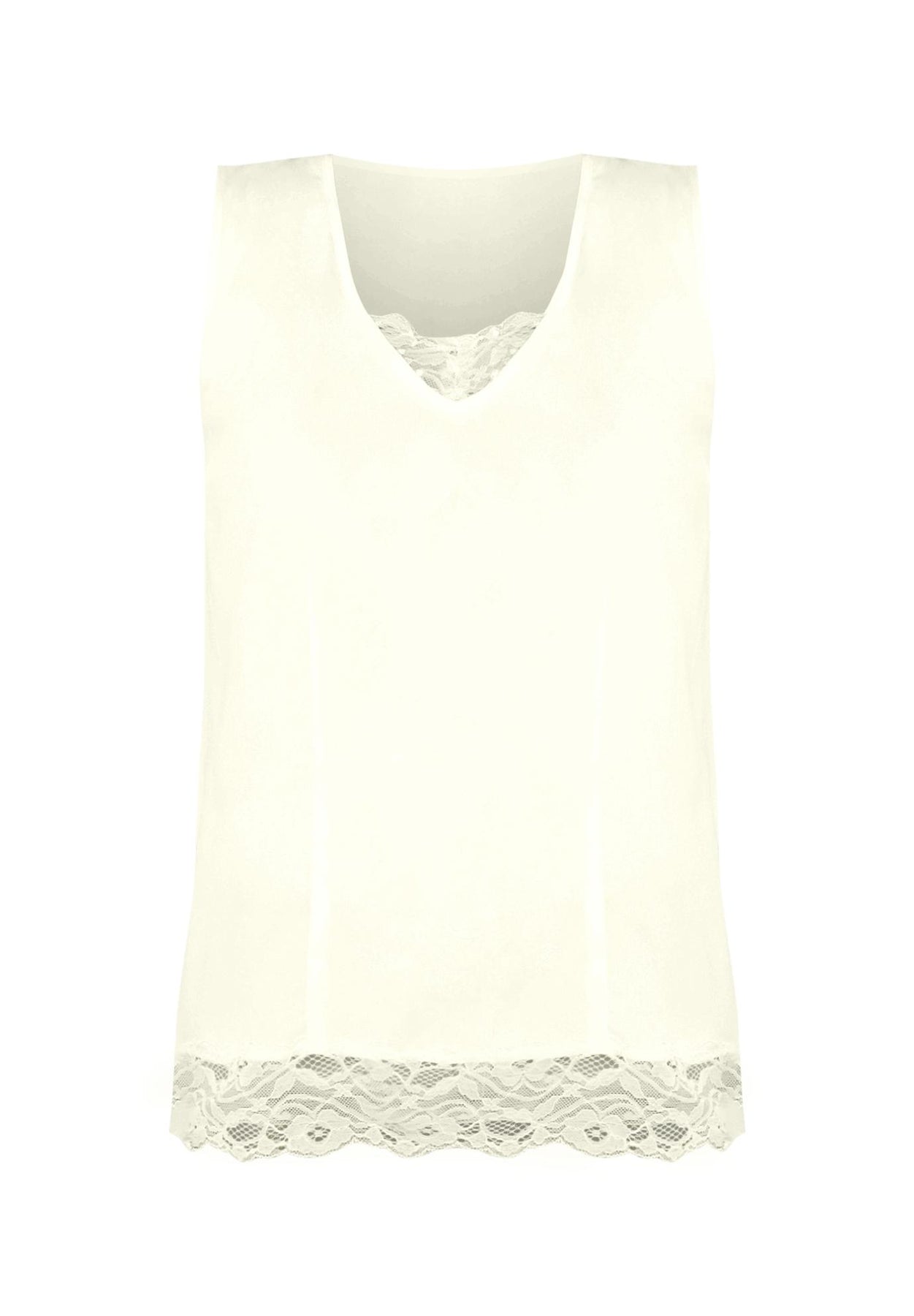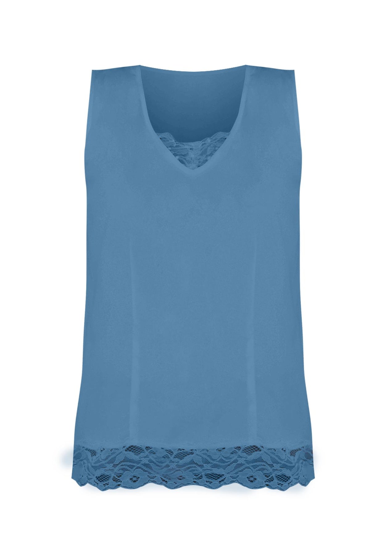 Trimmed in lace, it's the perfect tank to dress up or down depending on your mood. Straight silhouette. Lace trim. Bust darts.