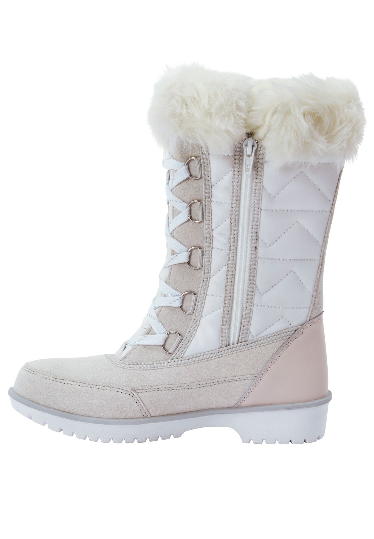 - Quilted nylon and suede upper with fleece lining and foam insulation