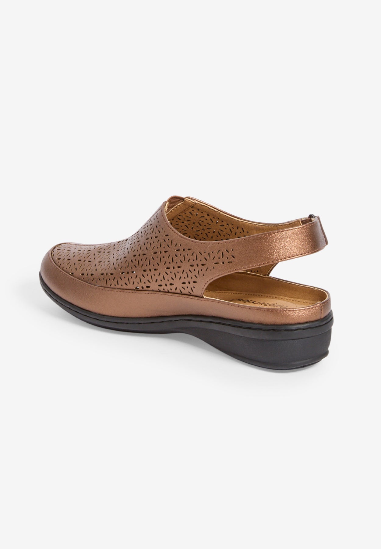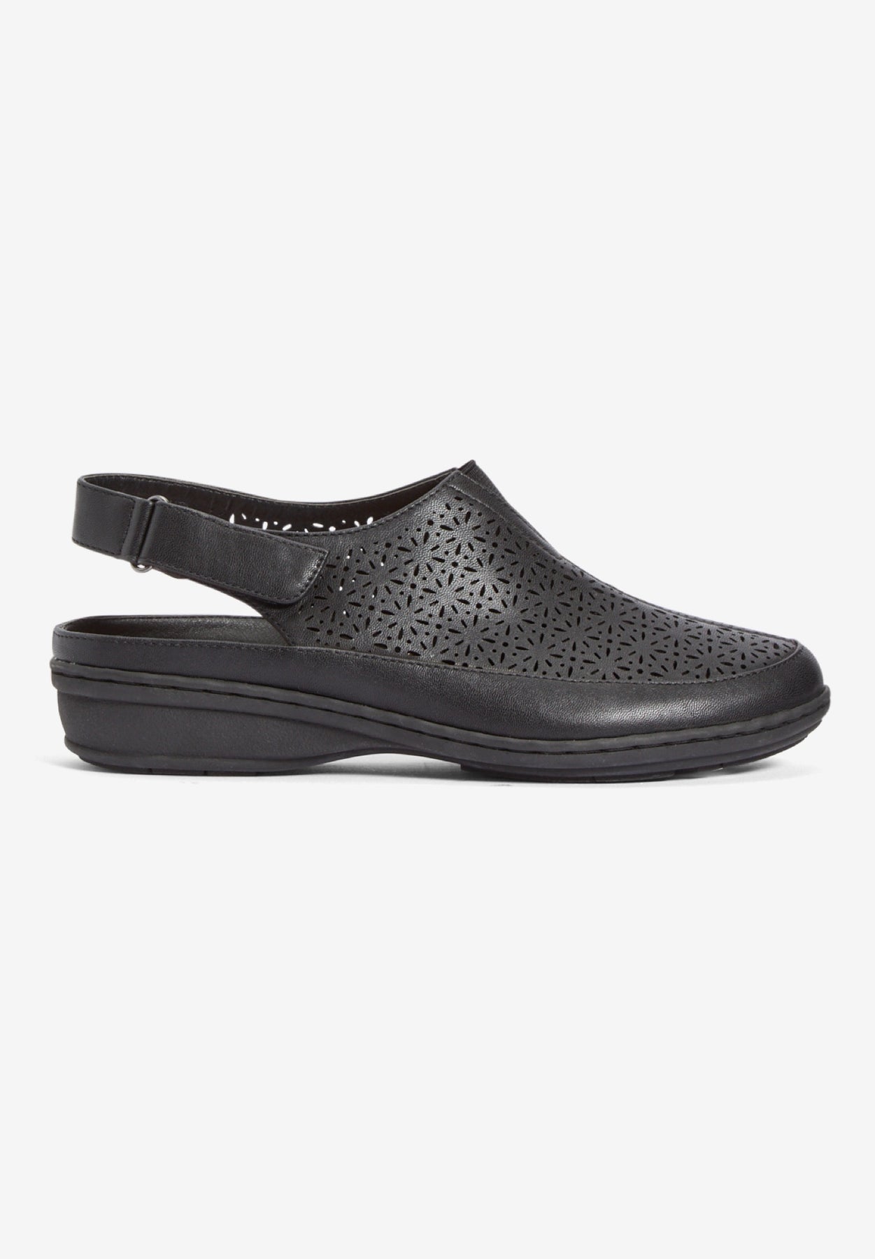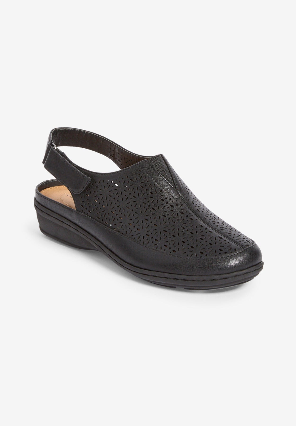 A must-have for your work-to-weekend closet! These versatile slings feature a faux leather upper with pretty details and adjustable, self-adhesive strap.