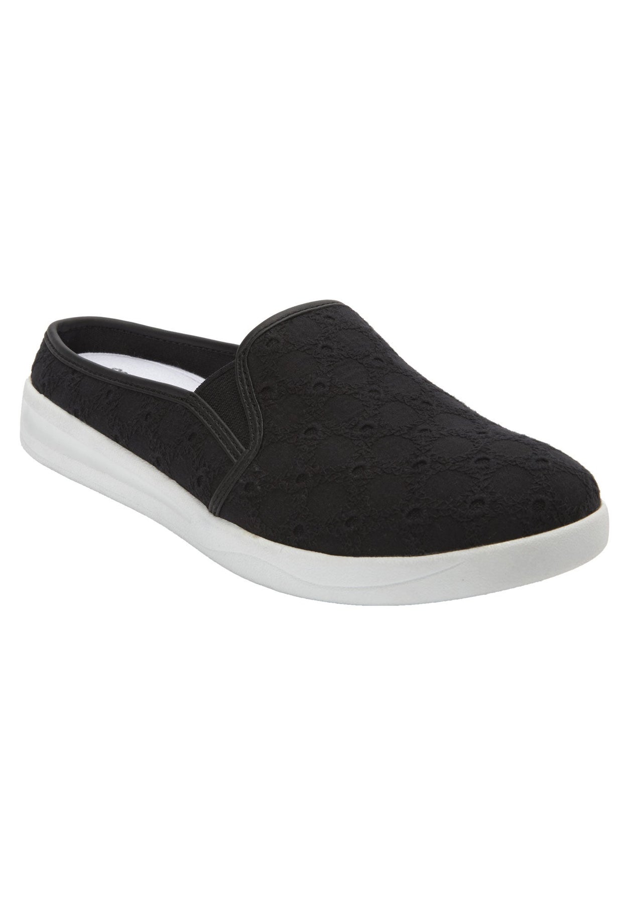 This stylish sneaker mule has a canvas or eyelet fabric upper with double side elastic gore for easy on and off.