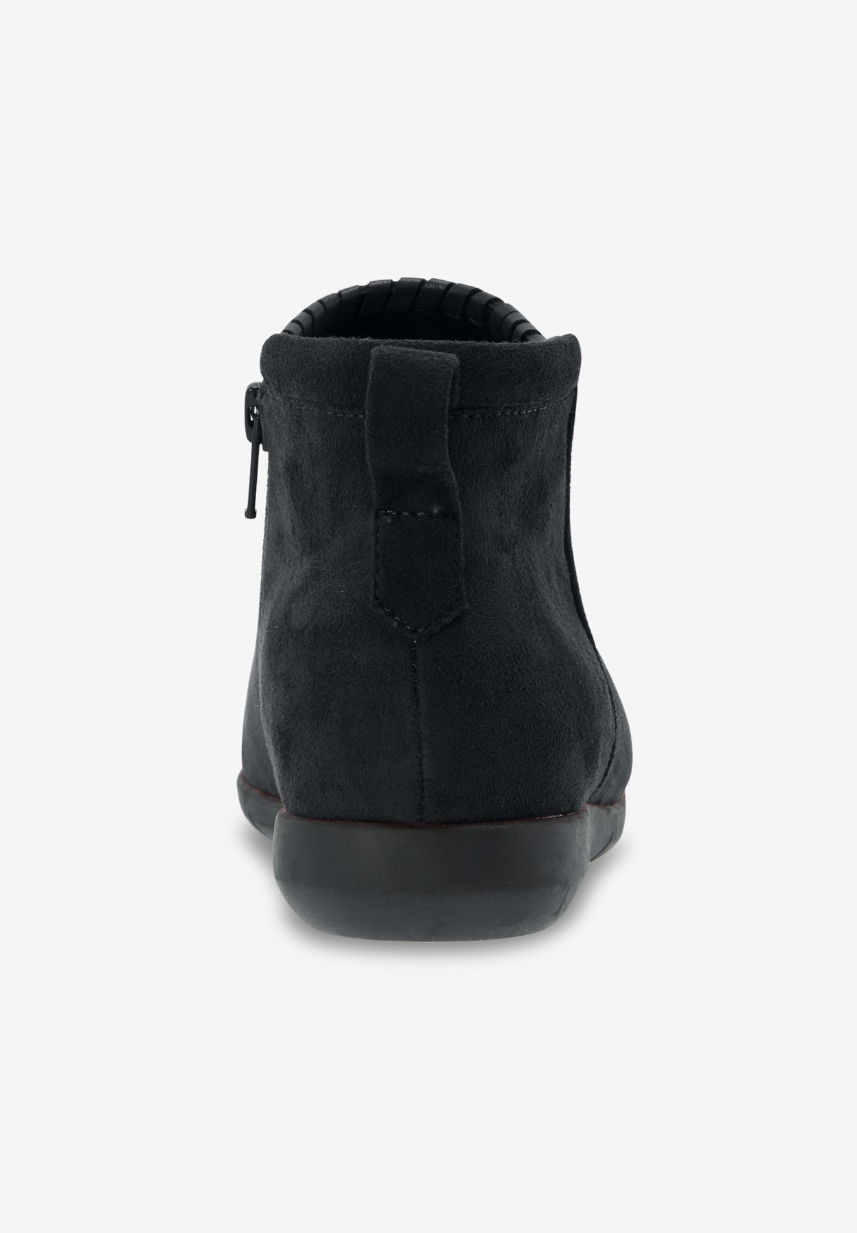 Faux suede booties with leather-like whipstitch detail available in full and half sizes 7-11, 12 M, W, WW