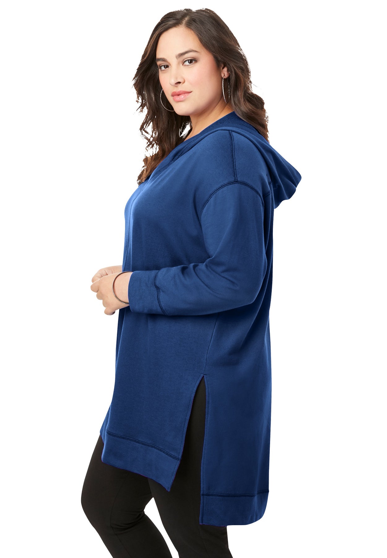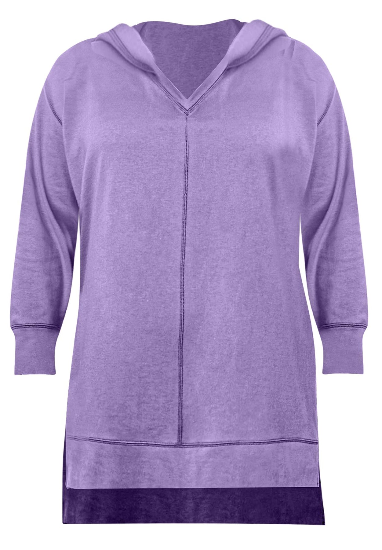 Perfect over everything, this relaxed layer features a V-neck, dramatic side slits and high-low hem. Relaxed silhouette. Center seam at front and back. Overlock stitching detail.
