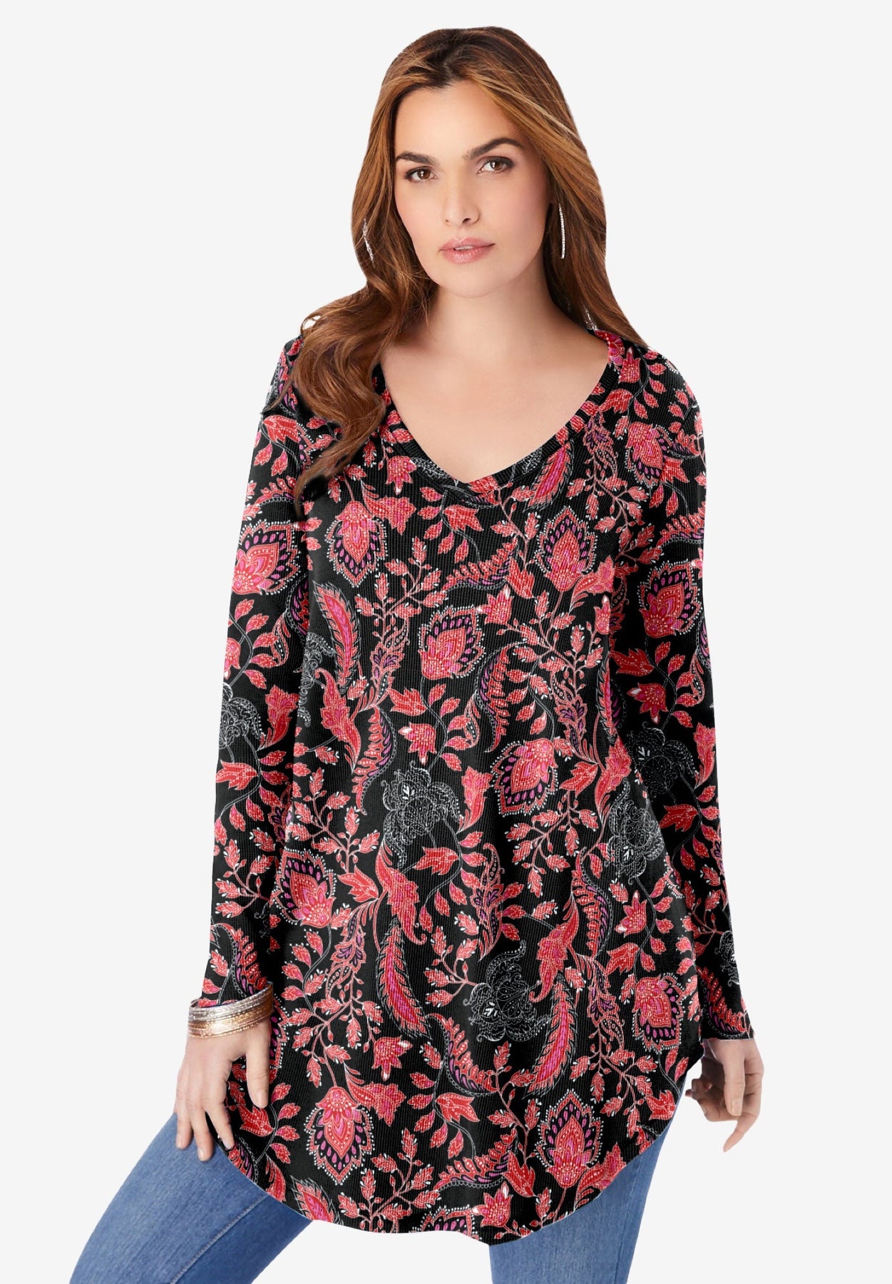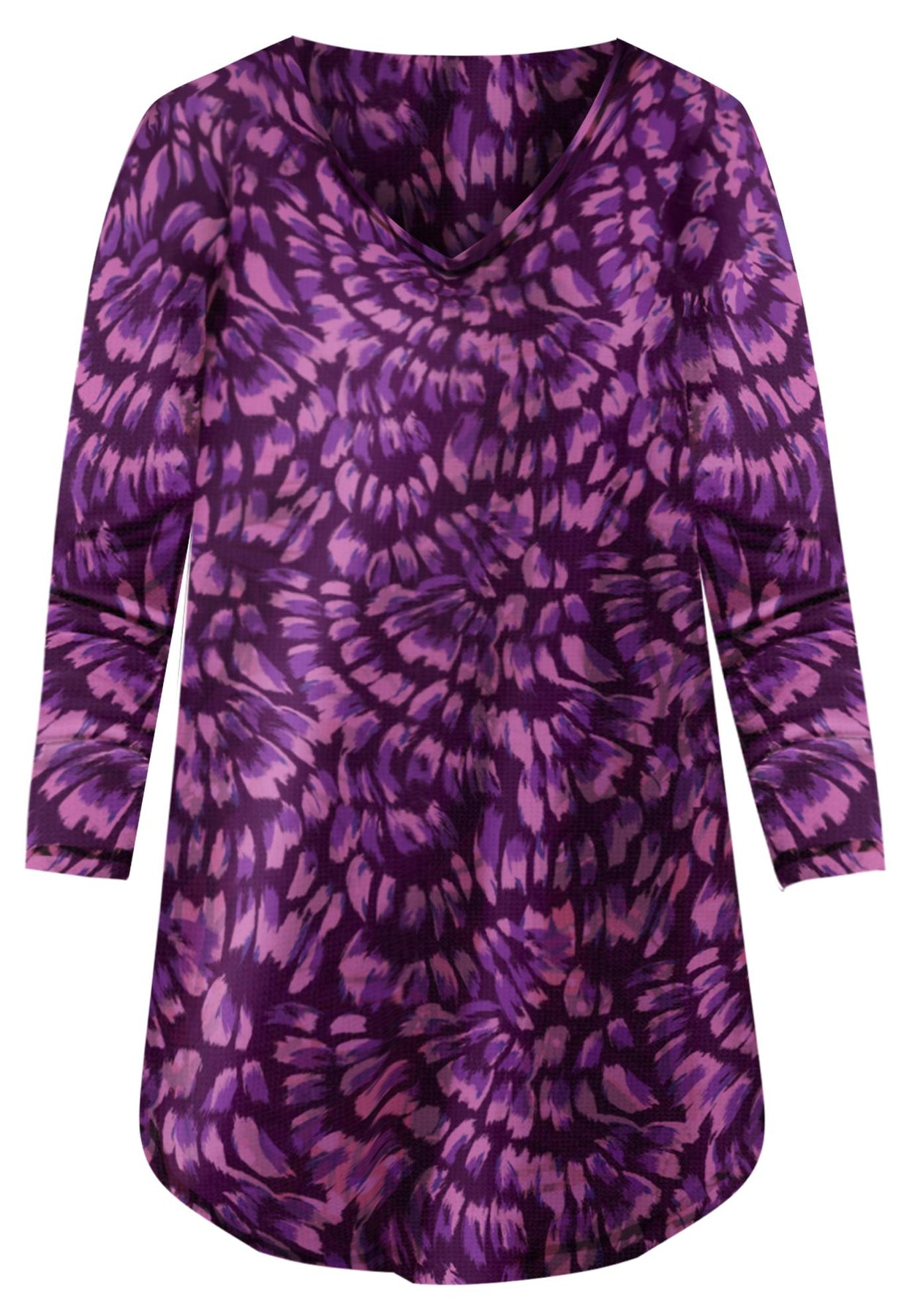A V-neck and longer tunic length for more coverage—perfect for cooler days and nights with its swingy silhouette. Shirttail hem.