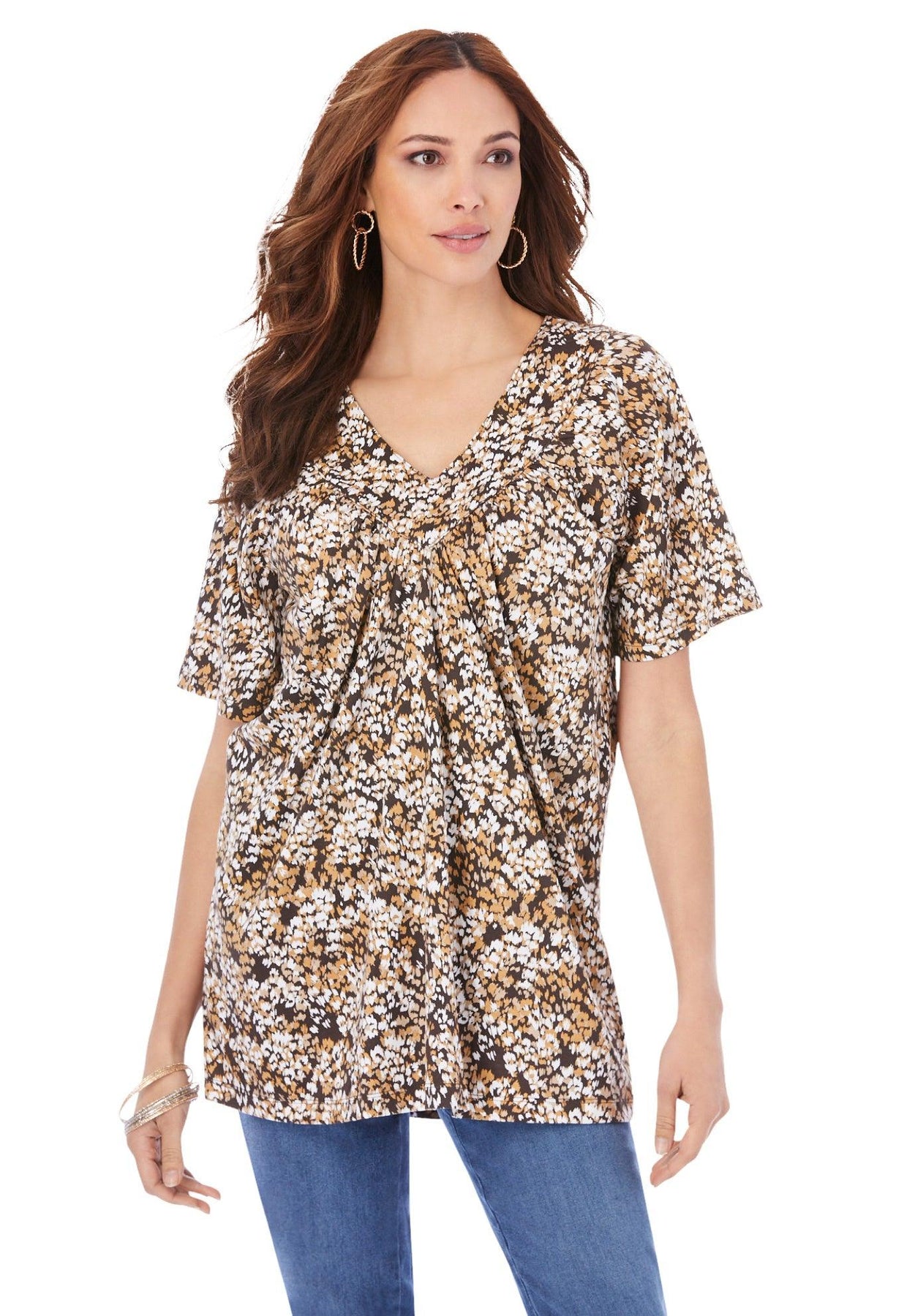 This top fits so well The brown features a small print which flatters a larger woman Dont care for big prints on my big body The blue is also figure flattering PLEASE add more colors and small prints