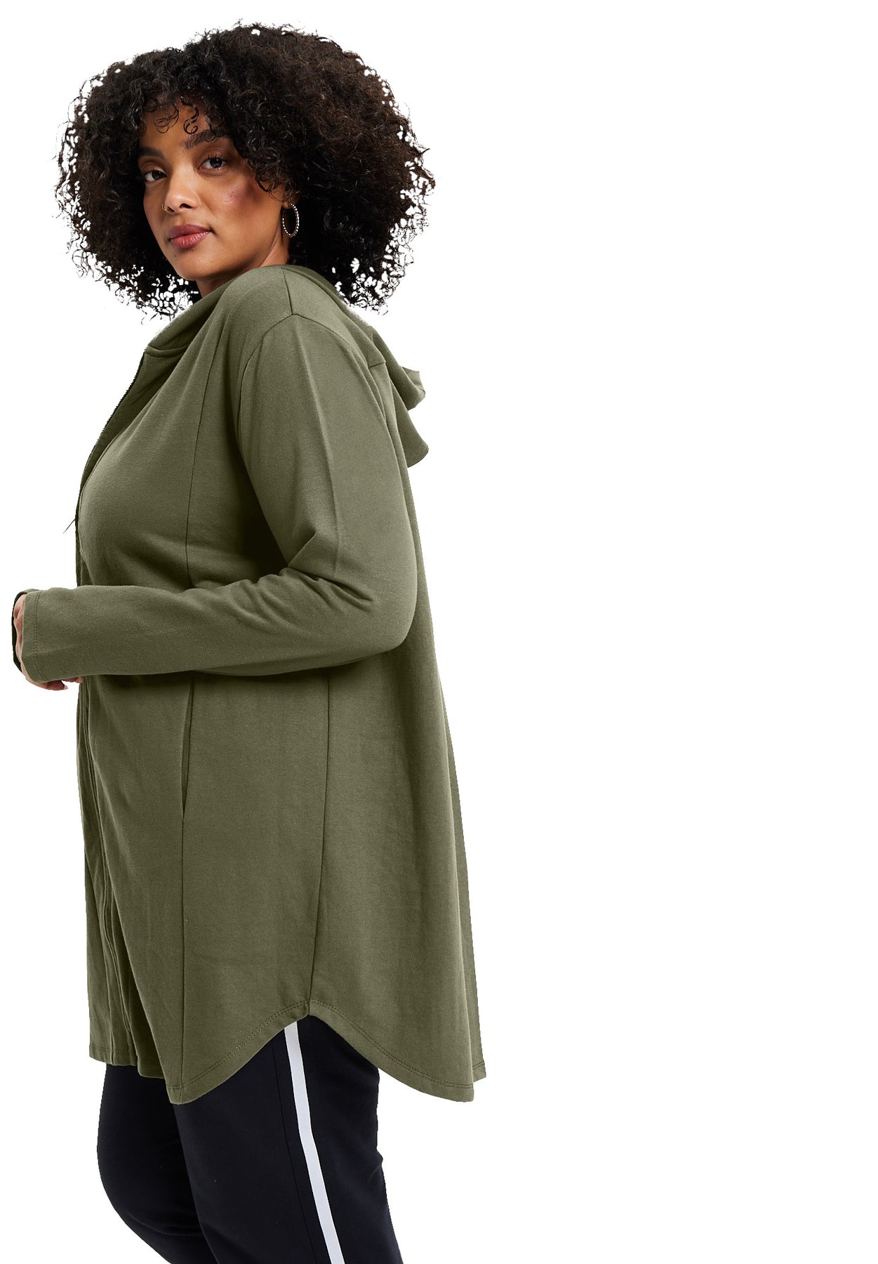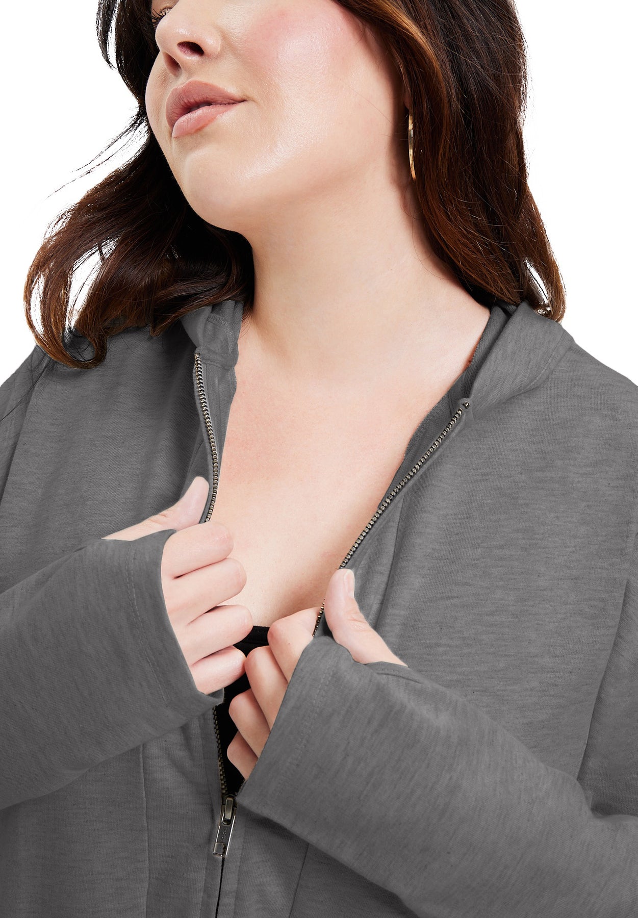 Keep it comfy in a cozy zip up, designed with sporty front panels and detailed with thumbholes for easy wear. Crafted from a super-soft French Terry fabric. Drawstring hood. Two front pockets.