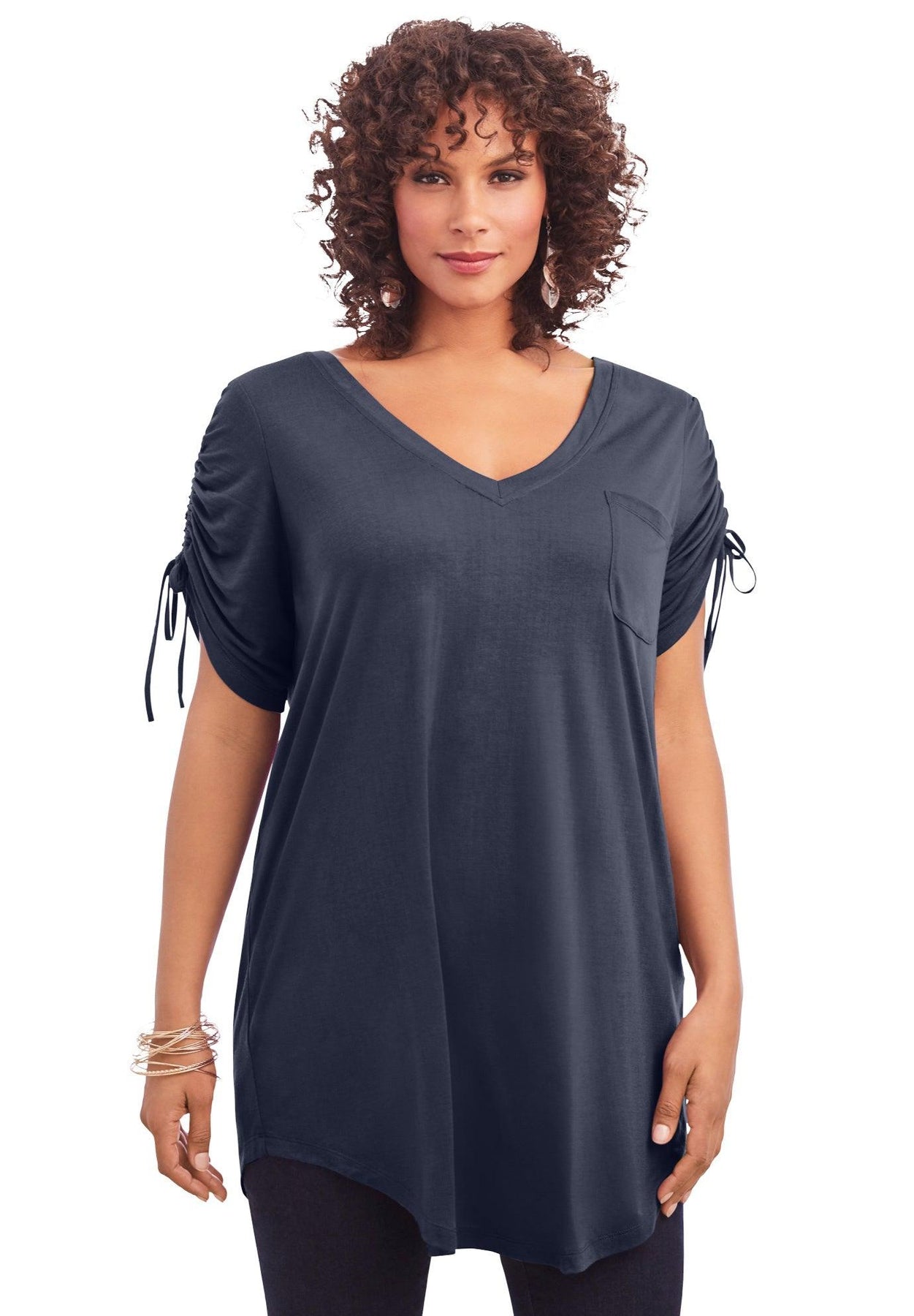 This relaxed, borrowed-from-the-boys tunic features adjustable drawstrings on the sleeves for versatile styling now matter how you wear it. V-neck, chest pocket, shirttail hem.