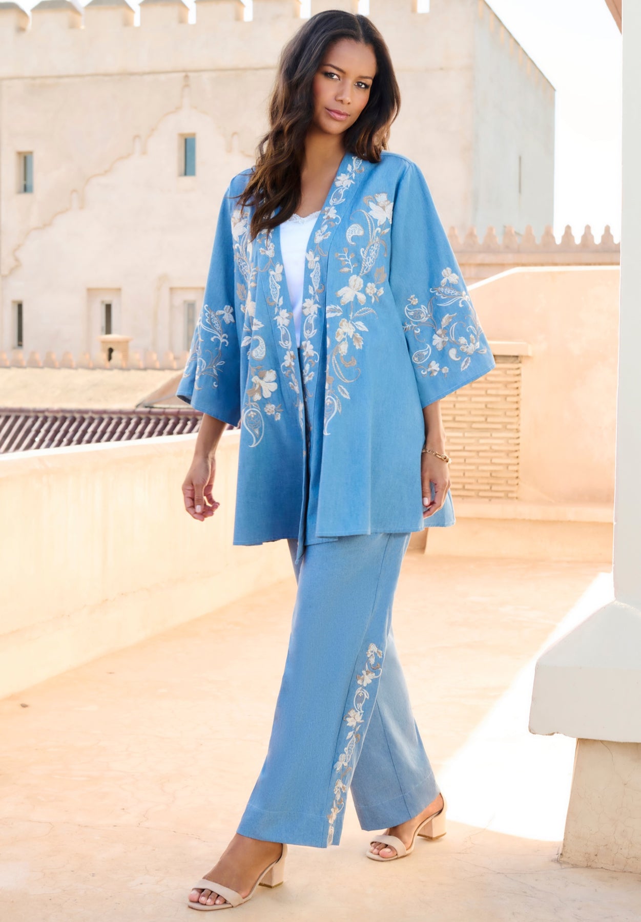 Plus Size Embroidered Pull-On Wide-Leg Chambray Pant | Roaman&