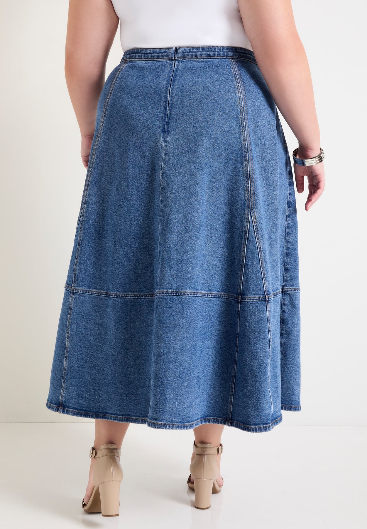 This flared denim midi skirt is crafted from soft, lightly structured cotton with a whisper of stretch—fitted at the waist, then flowing into a gently sweeping hem. The paneled seamwork adds texture, while the lived-in wash implies a sense of wander. It’s the kind of piece that pairs as effortlessly with a slouchy knit as it does a silk blouse.