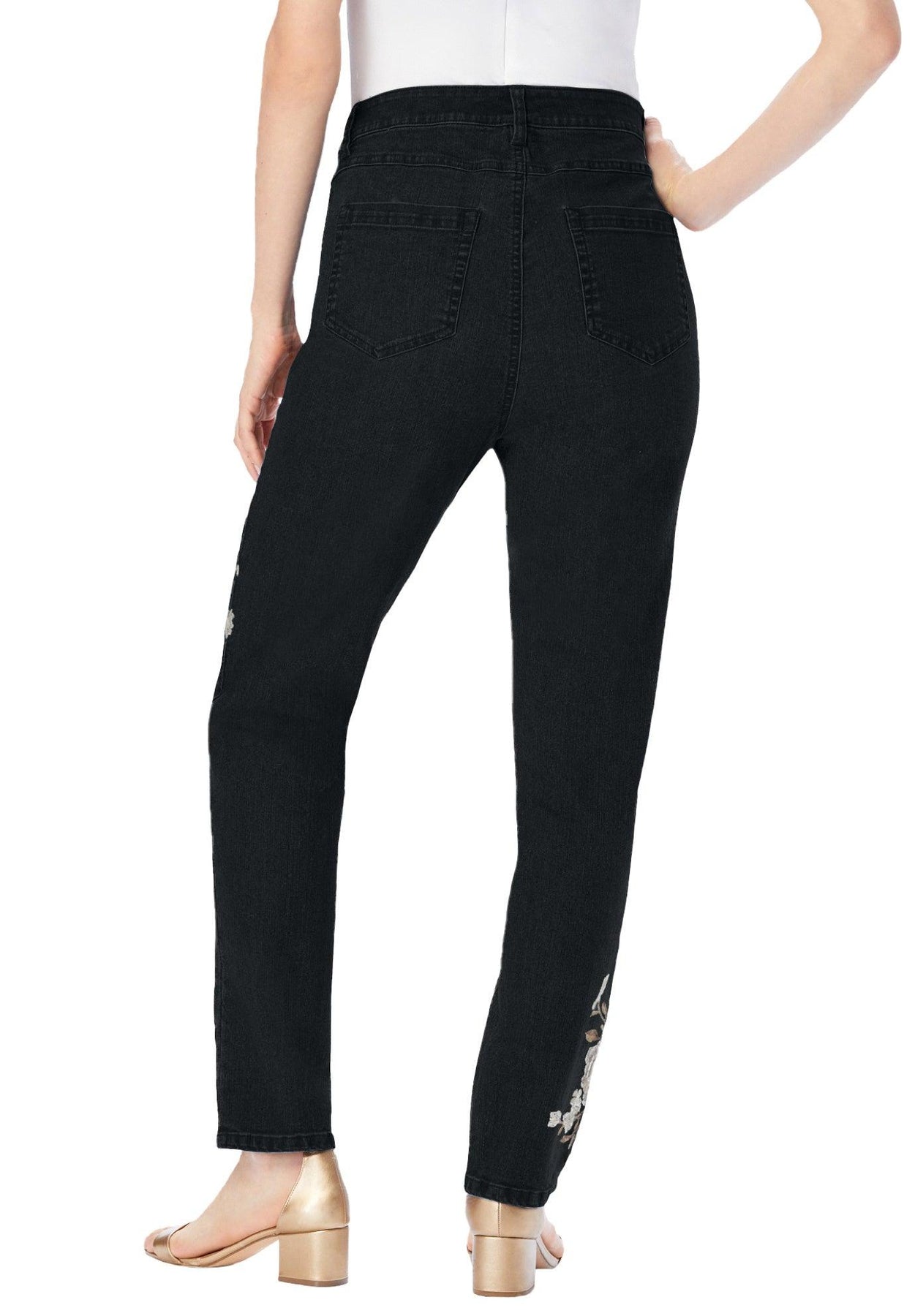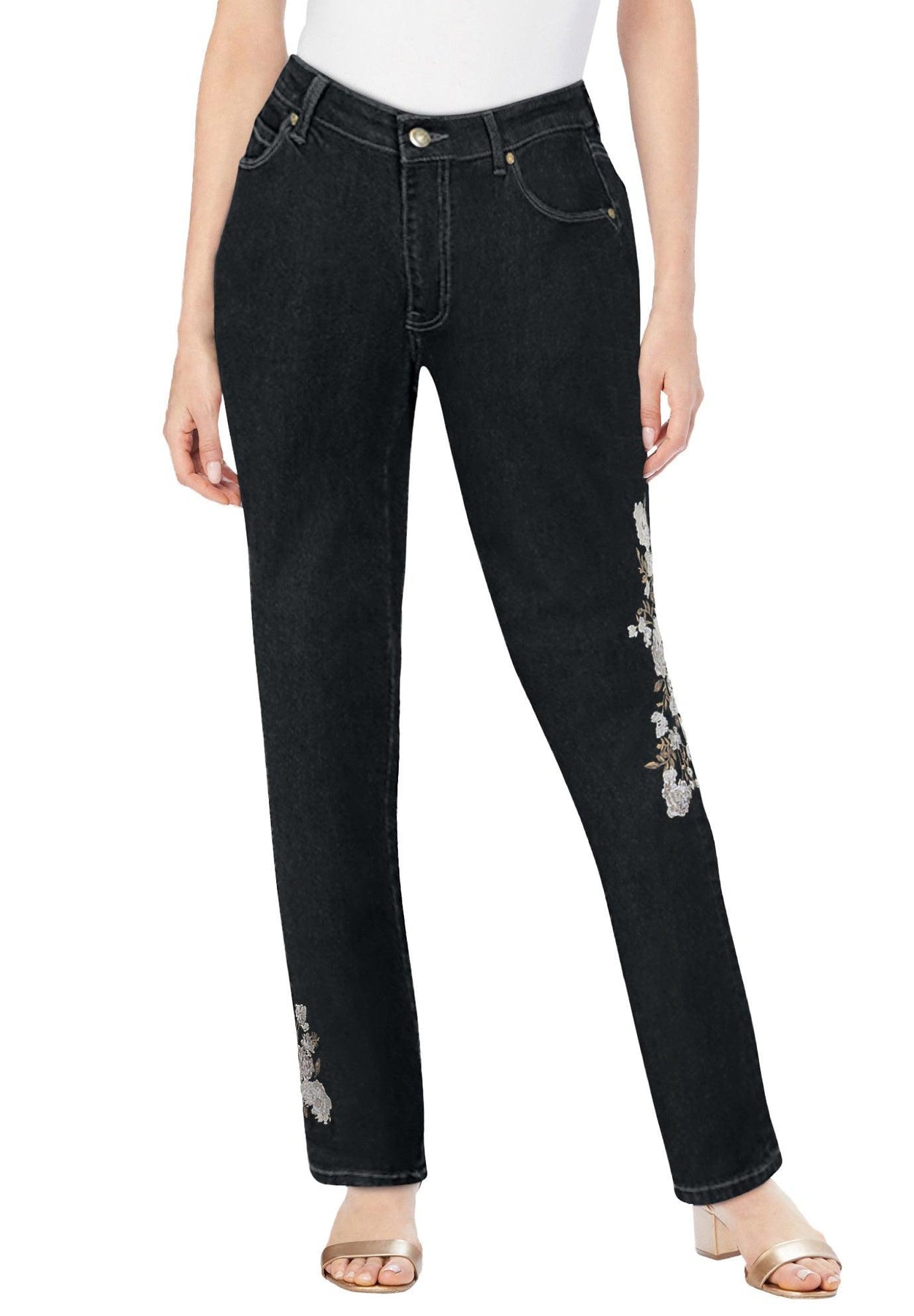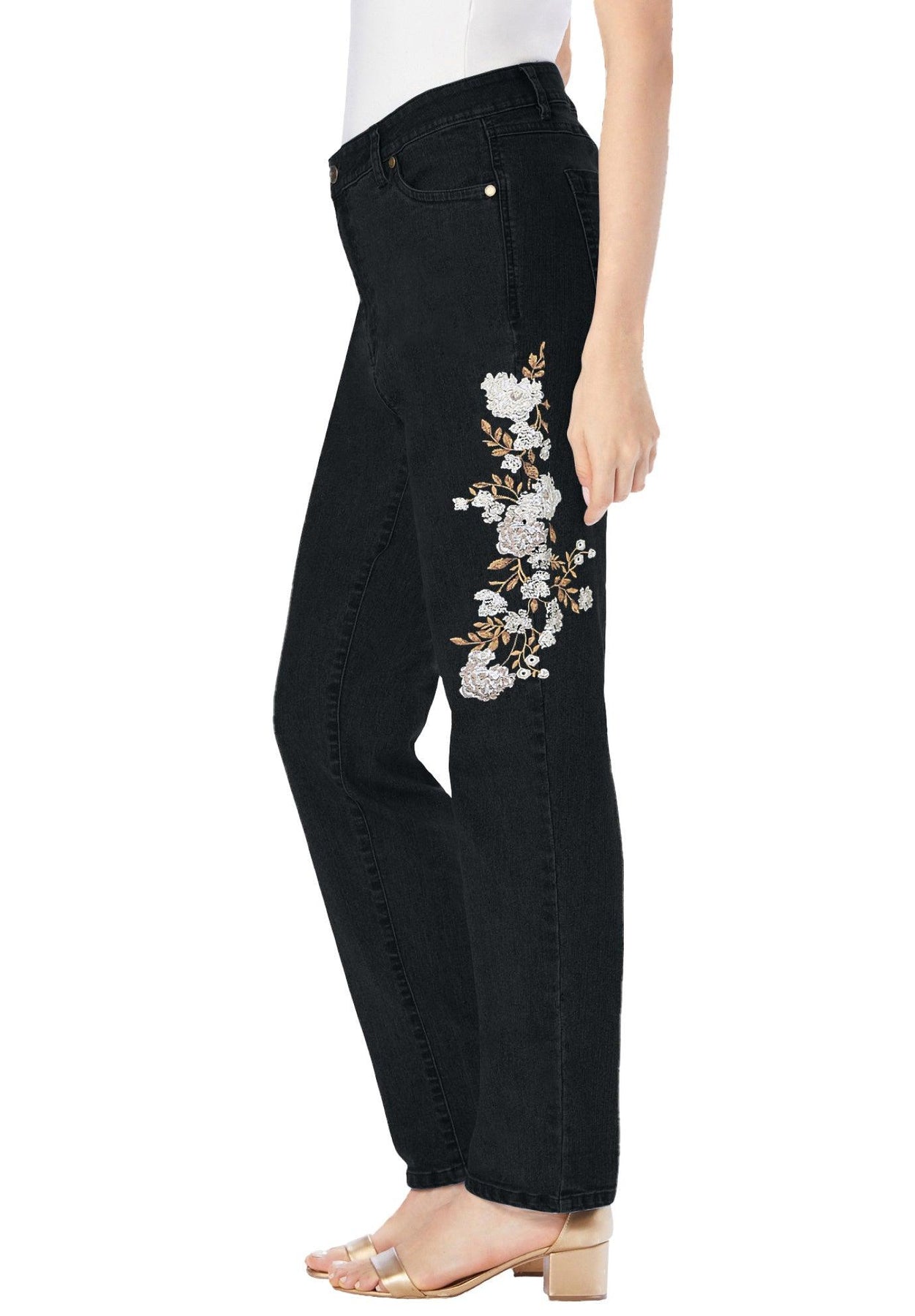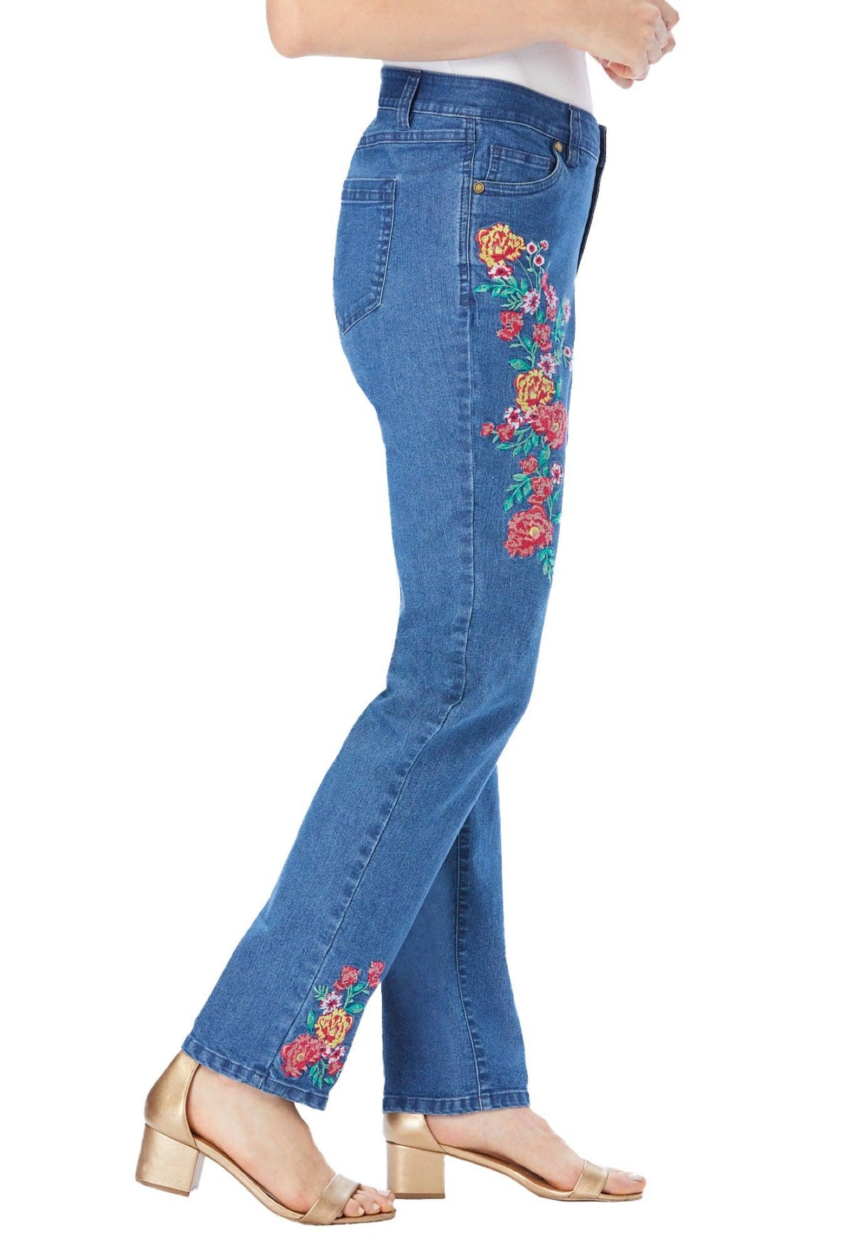 Classic denim gets a feminine feel thanks to the delicate embroidery on this pair of straight-leg jeans. Designed to hug your curves in the right way, the waistband is cut on a bias so it won't fold, gap or bulge. 5-pocket styling.