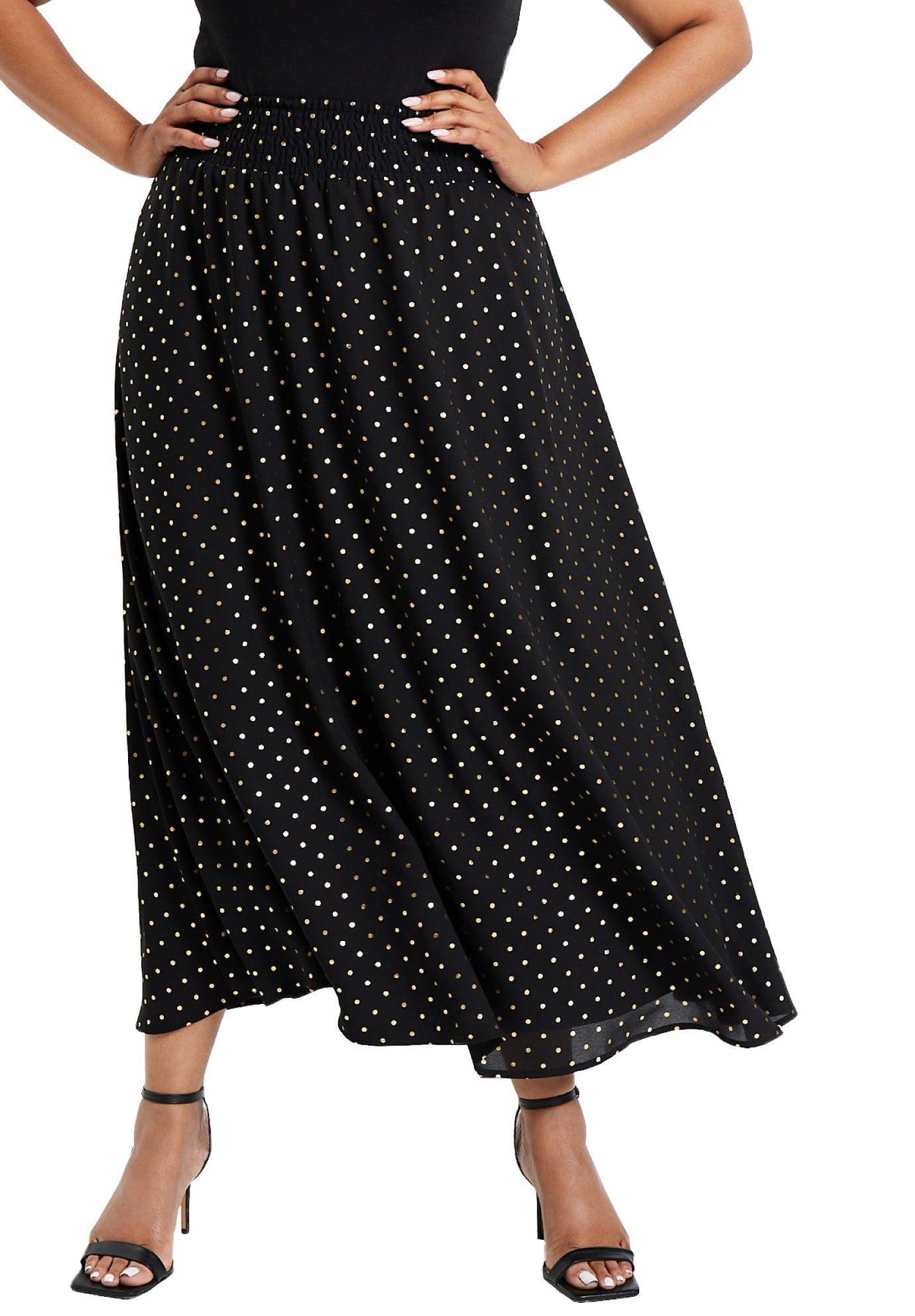 Sophisticated and elegant, this lightweight georgette skirt boasts a metallic, eye-catching polka dot pattern and a full, swirling silhouette. Wear it alone or pair it with the matching top for the easiest going out outfit ever. Complete with an elasticated smocked waistband for an all-night comfortable wear.