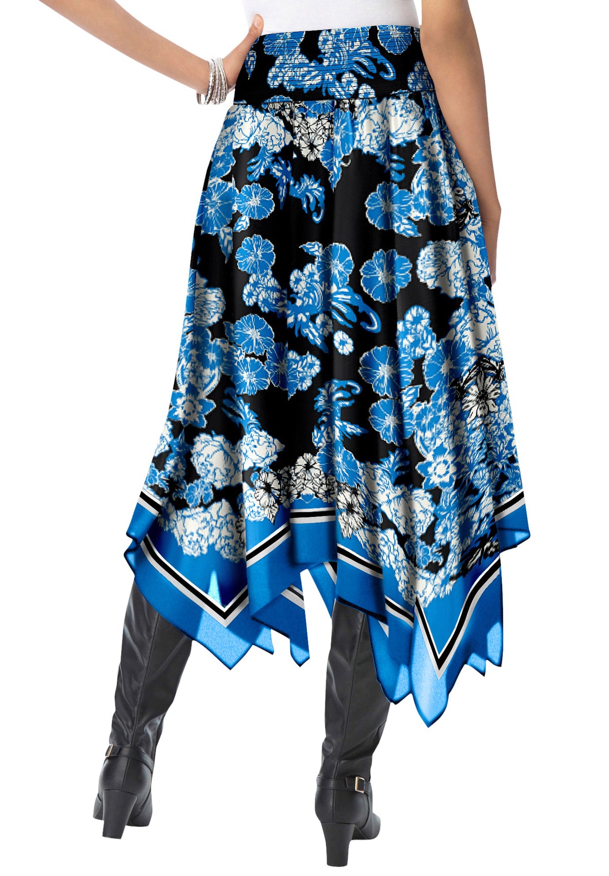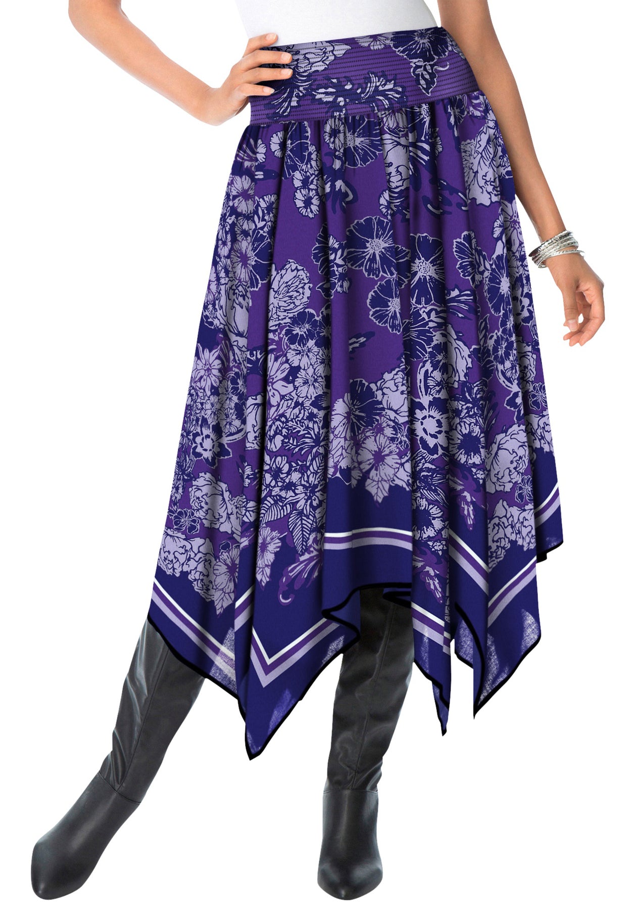 Make any outfit unique and elegant with a gorgeous scarf-print skirt. Smocked, elasticized waistband and asymmetric handkerchief hem.