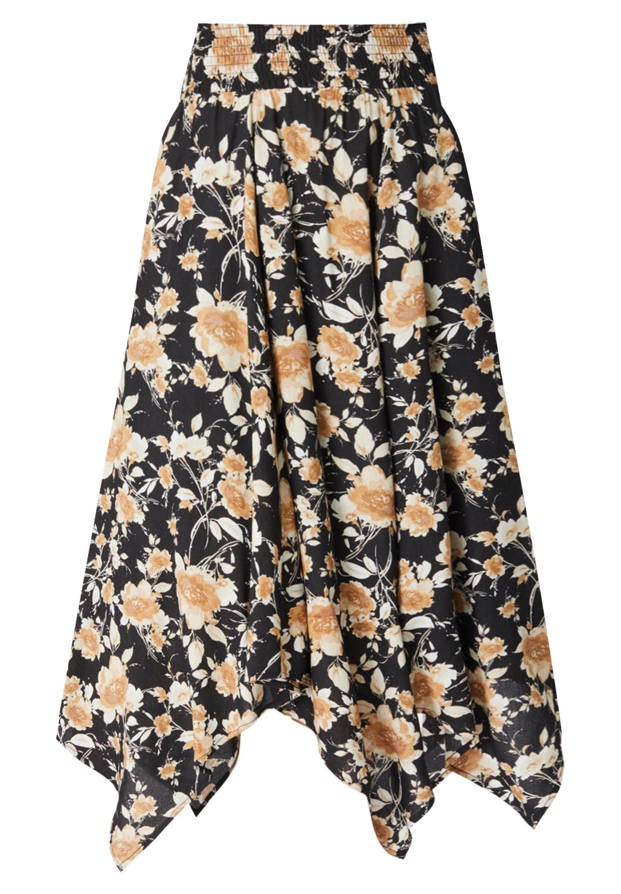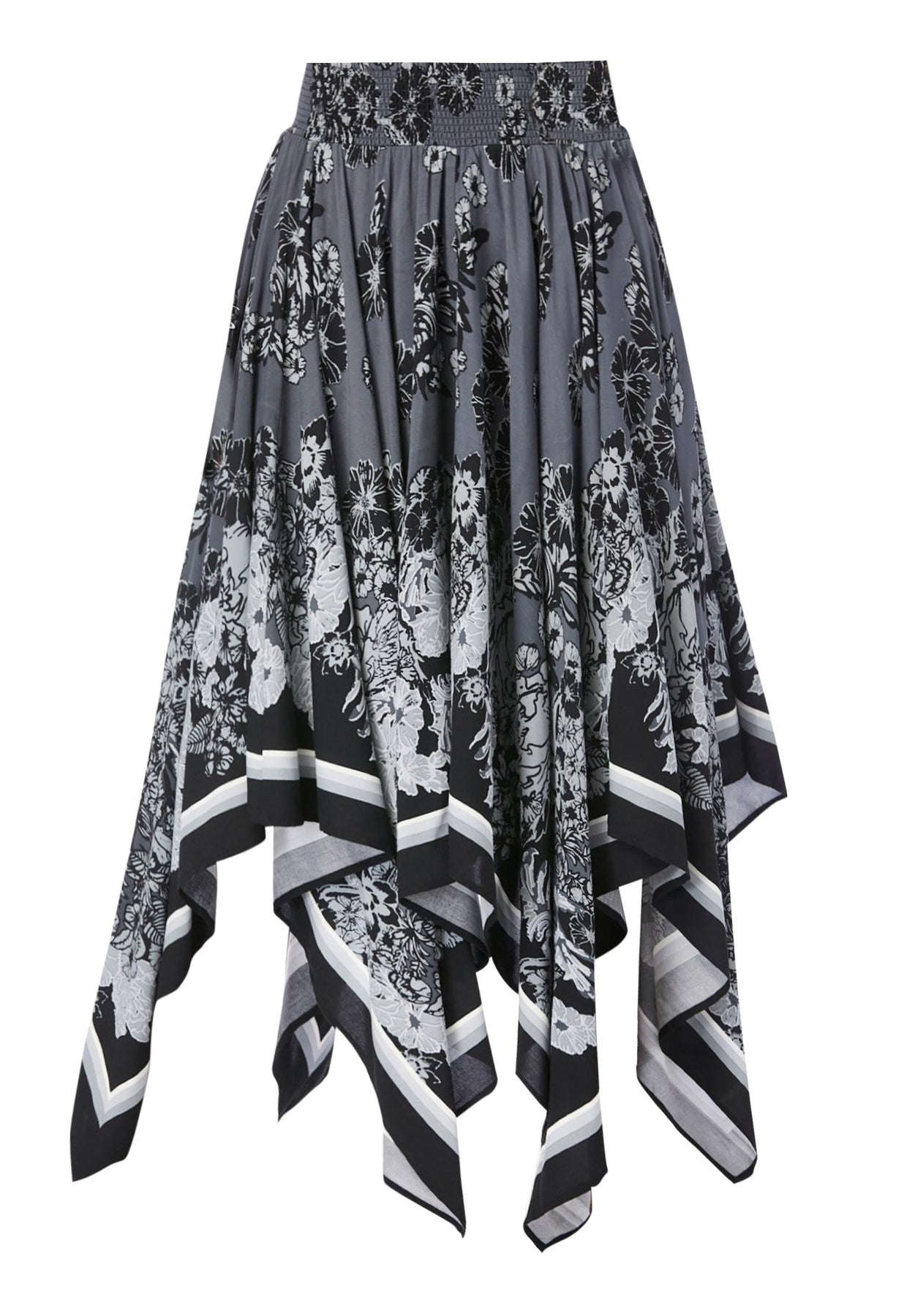 Make any outfit unique and elegant with a gorgeous scarf-print skirt. Smocked, elasticized waistband and asymmetric handkerchief hem.
