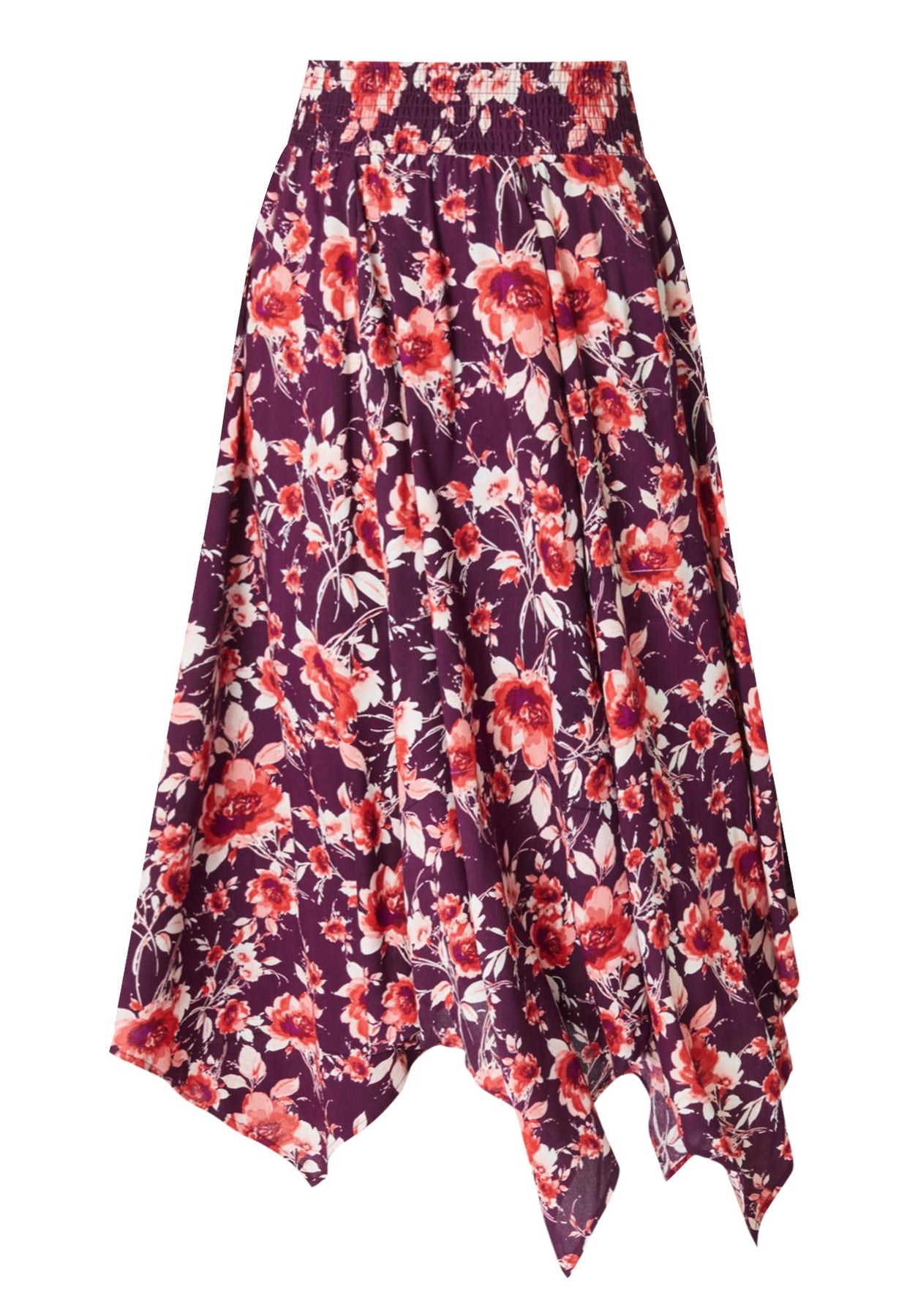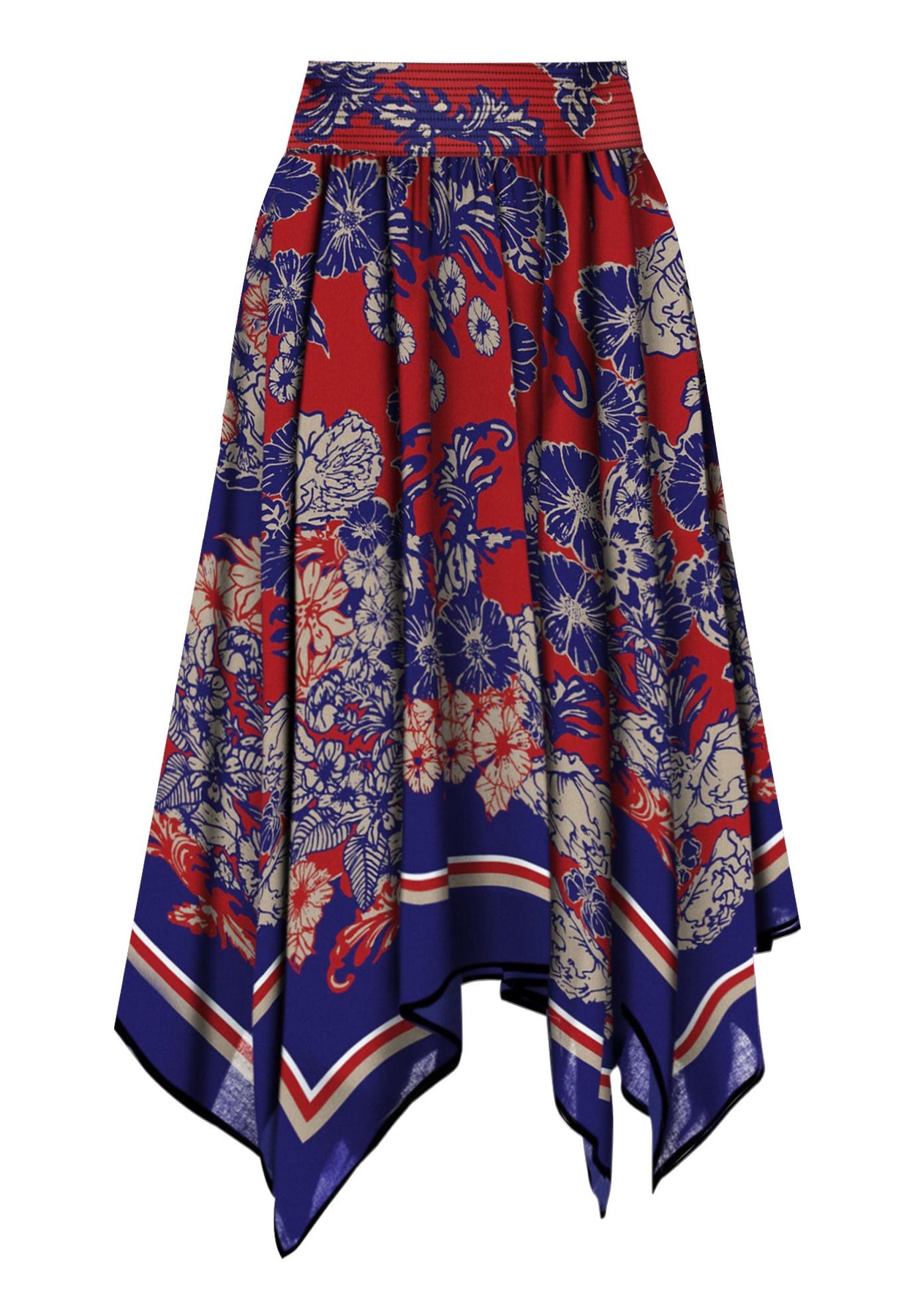 Make any outfit unique and elegant with a gorgeous scarf-print skirt. Smocked, elasticized waistband and asymmetric handkerchief hem.