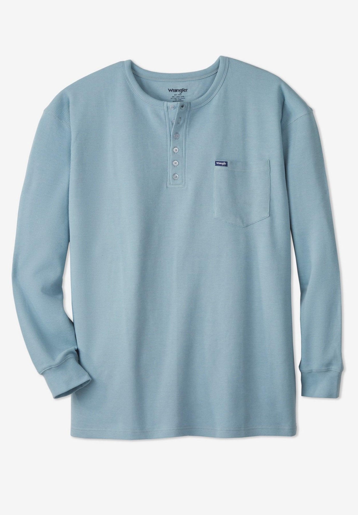 Timeless six-button henley with Wrangler® flag logo on the left chest pocket. Designed with ribbed crewneck and cuffs for extra style.
